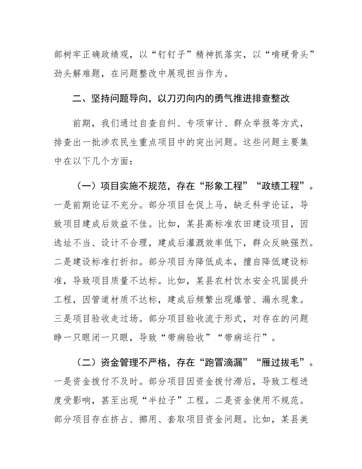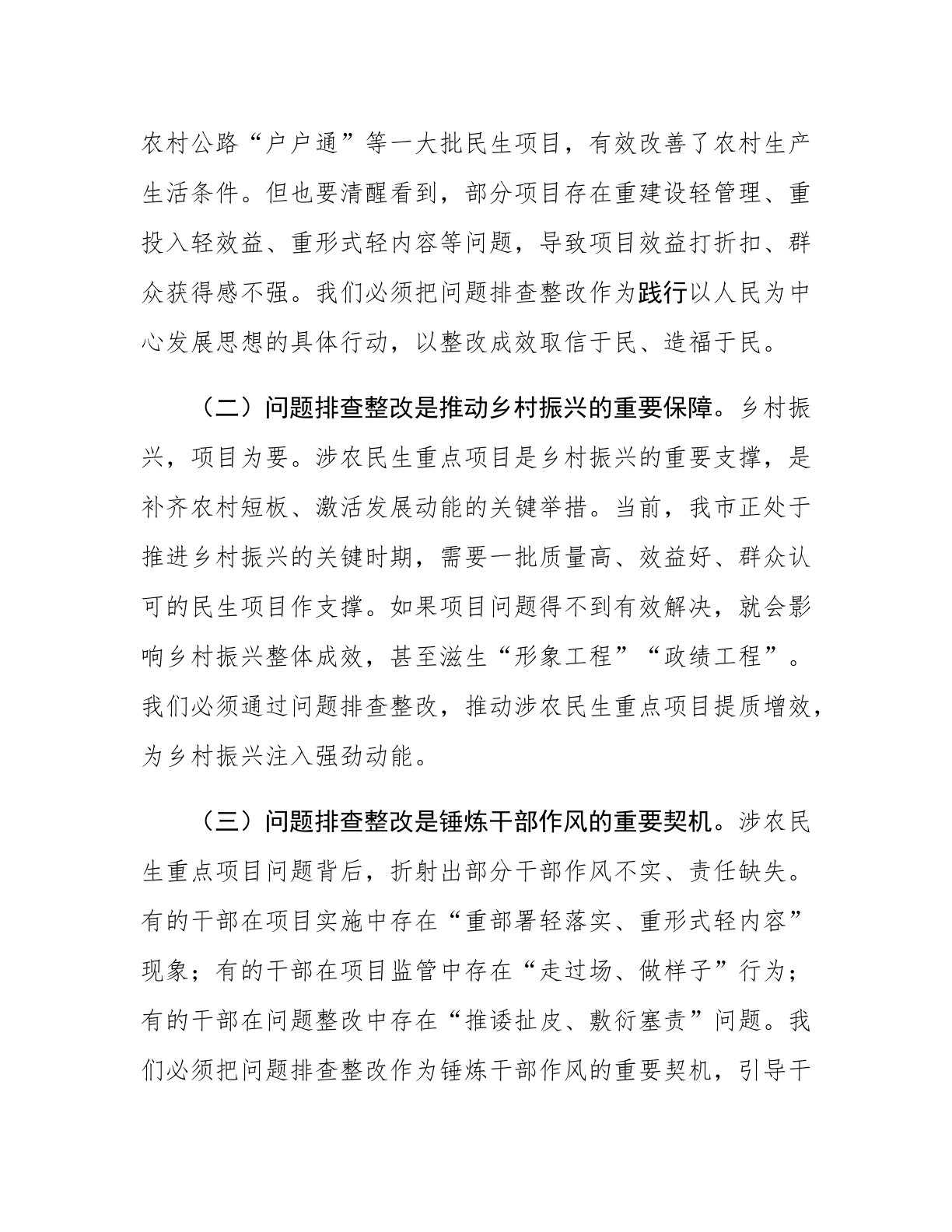市长在全市涉农民生重点项目突出问题排查整改推进会议上的讲话今天,我们召开全市涉农民生重点项目突出问题排查整改推进会议,主要任务是深入贯彻落实总书记关于民生工作的重要论述,按照省委、省政府部署要求,动员全市上下以刀刃向内的勇气、刮骨疗毒的决心,全面排查整治涉农民生重点项目中的突出问题,坚决打赢这场问题整改攻坚战,向全市人民交上一份满意的民生答卷。下面,我讲三点意见。一、提高政治站位,深刻认识涉农民生重点项目问题排查整改的极端重要性涉农民生重点项目是推进乡村振兴、实现共同富裕的重要抓手,是党委、政府向群众作出的庄严承诺。我们必须从政治和全局的高度,深刻认识问题排查整改的极端重要性。(一)问题排查整...