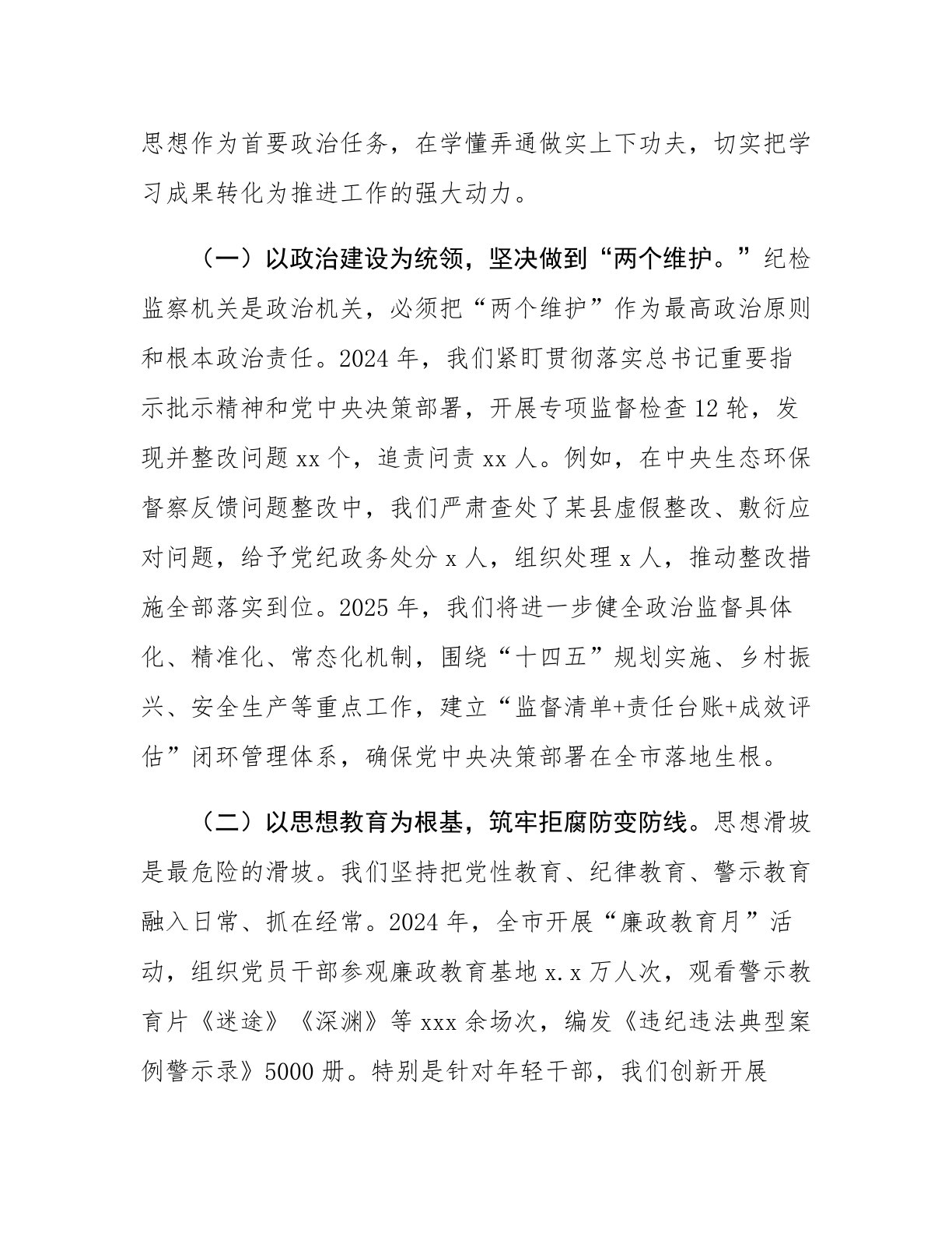 市委纪检监察组组长在2025年党风廉政建设工作会议上的讲话同志们:今天,我们召开2025年党风廉政建设工作会议,主要任务是深入学习贯彻党的二十大和二十届中央纪委历次全会精神,总结2024年全市党风廉政建设和反腐败工作,部署2025年重点任务。过去一年,在市委的坚强领导下,全市纪检监察机关忠诚履职、担当作为,坚定不移正风肃纪反腐,为经济社会高质量发展提供了坚强保障。但也要清醒看到,反腐败斗争形势依然严峻复杂,全面从严治党永远在路上。下面,我讲三点意见。一、坚持深学细悟,以党的创新理论引领党风廉政建设新实践党的二十大以来,总书记围绕全面从严治党提出一系列新理念新思想新战略,为新时代新征程推进党风廉...