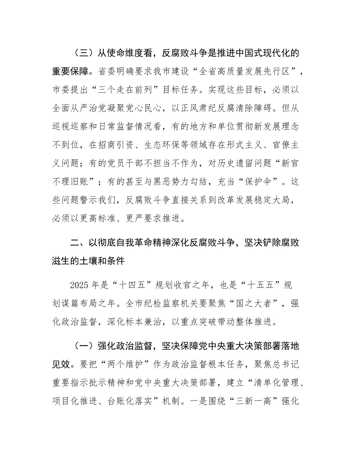 市纪委书记在2025年全面从严治党、党风廉政建设和反腐败工作会暨警示教育大会上的讲话同志们:今天,我们召开2025年全面从严治党、党风廉政建设和反腐败工作会暨警示教育大会,主要任务是深入学习贯彻总书记关于党的自我革命的重要思想,全面落实二十届中央纪委五次全会和省委、市委部署要求,以案为鉴、以案促改,动员全市各级党组织和纪检监察机关发扬彻底的自我革命精神,坚定不移推进全面从严治党向纵深发展。下面,我讲三个方面意见。一、深刻把握反腐败斗争新形势,始终保持永远在路上的清醒和坚定过去一年,在中央纪委国家监委和省委、市委坚强领导下,全市纪检监察机关忠实履行党章和宪法赋予的职责,以“全周期管理”理念一体推...