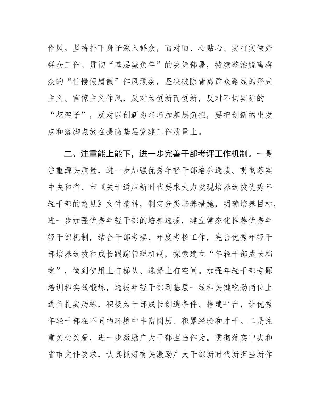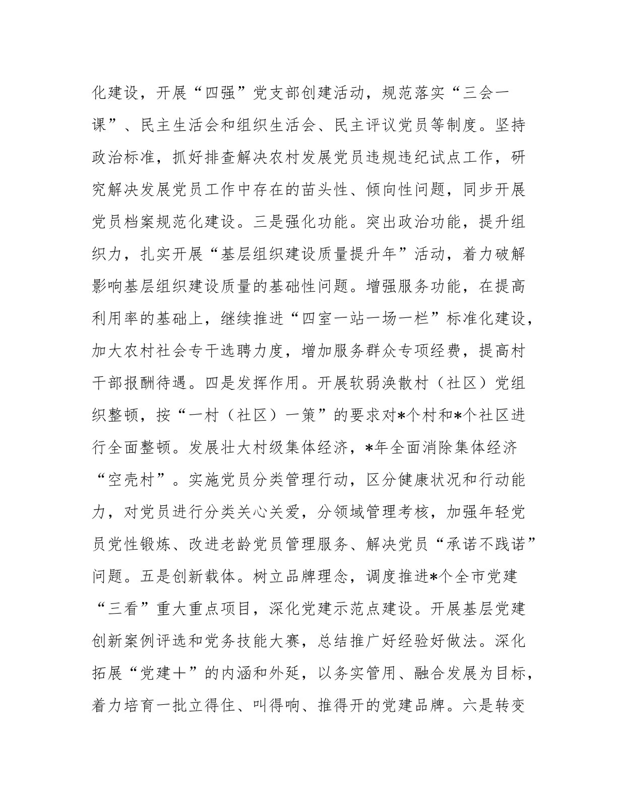 某县在全市组织部门重点任务推进会上的发言按照会议部署,*县将突出“抓贯彻、强担当、破难题”工作主线,实施“干部能力迭代、党建品牌创优、人才生态升级”三大行动,推动组织工作与中心大局同频共振。重点抓好三方面工作:一、坚持问题导向,建设坚强有力的基层组织体系。今后,全县基层党建工作将以新时代中国特色社会主义思想为指导,认真贯彻落实全国组织部长会议、全省组织工作重点任务部署会议、全市组织部长会议和全县组织工作会议精神,坚持问题导向,在围绕中心服务大局中凝神聚力,在聚焦主责主业中实干担当,奋力开创新时代全县党的建设新局面。一是抓实责任。坚持领导示范、以上率下,牢固树立“抓好党建是本职、不抓党建是失职、...