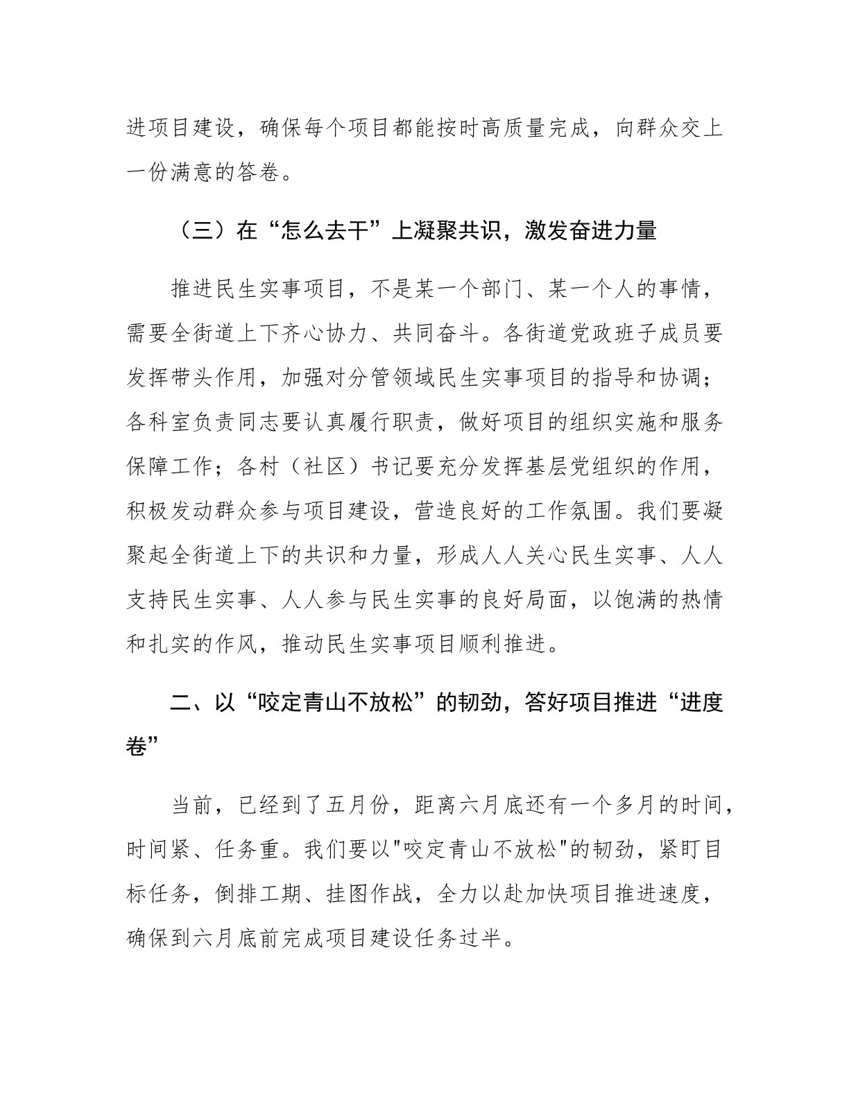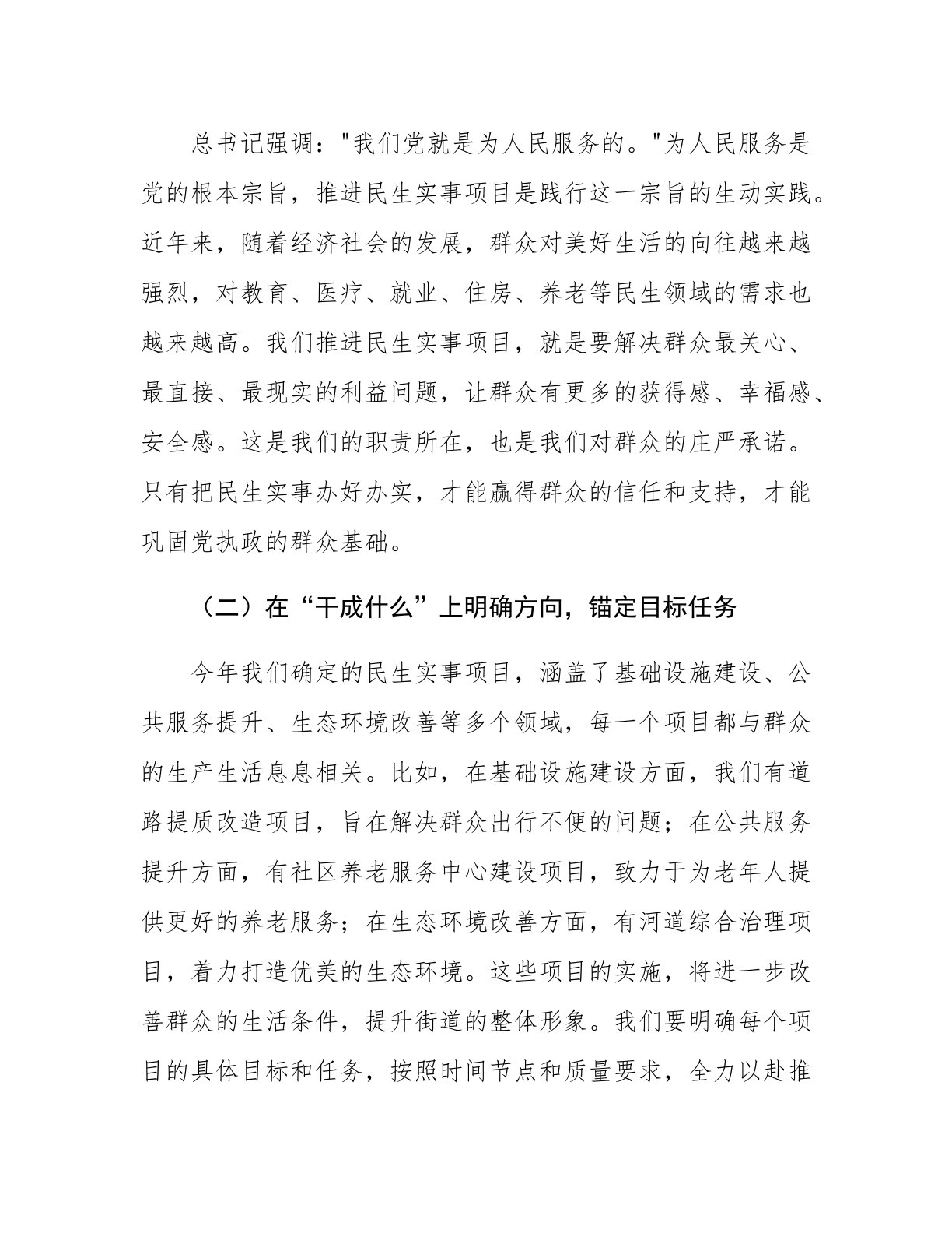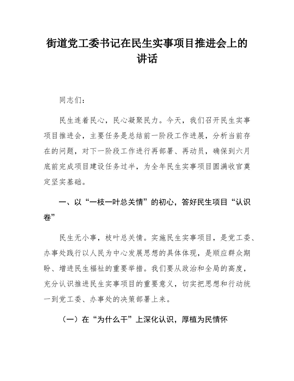 街道党工委书记在民生实事项目推进会上的讲话同志们:民生连着民心,民心凝聚民力。今天,我们召开民生实事项目推进会,主要任务是总结前一阶段工作进展,分析当前存在的问题,对下一阶段工作进行再部署、再动员,确保到六月底前完成项目建设任务过半,为全年民生实事项目圆满收官奠定坚实基础。一、以“一枝一叶总关情”的初心,答好民生项目“认识卷”民生无小事,枝叶总关情。实施民生实事项目,是党工委、办事处践行以人民为中心发展思想的具体体现,是顺应群众期盼、增进民生福祉的重要举措。我们要从政治和全局的高度,充分认识推进民生实事项目的重要意义,切实把思想和行动统一到党工委、办事处的决策部署上来。(一)在“为什么干”上深...
