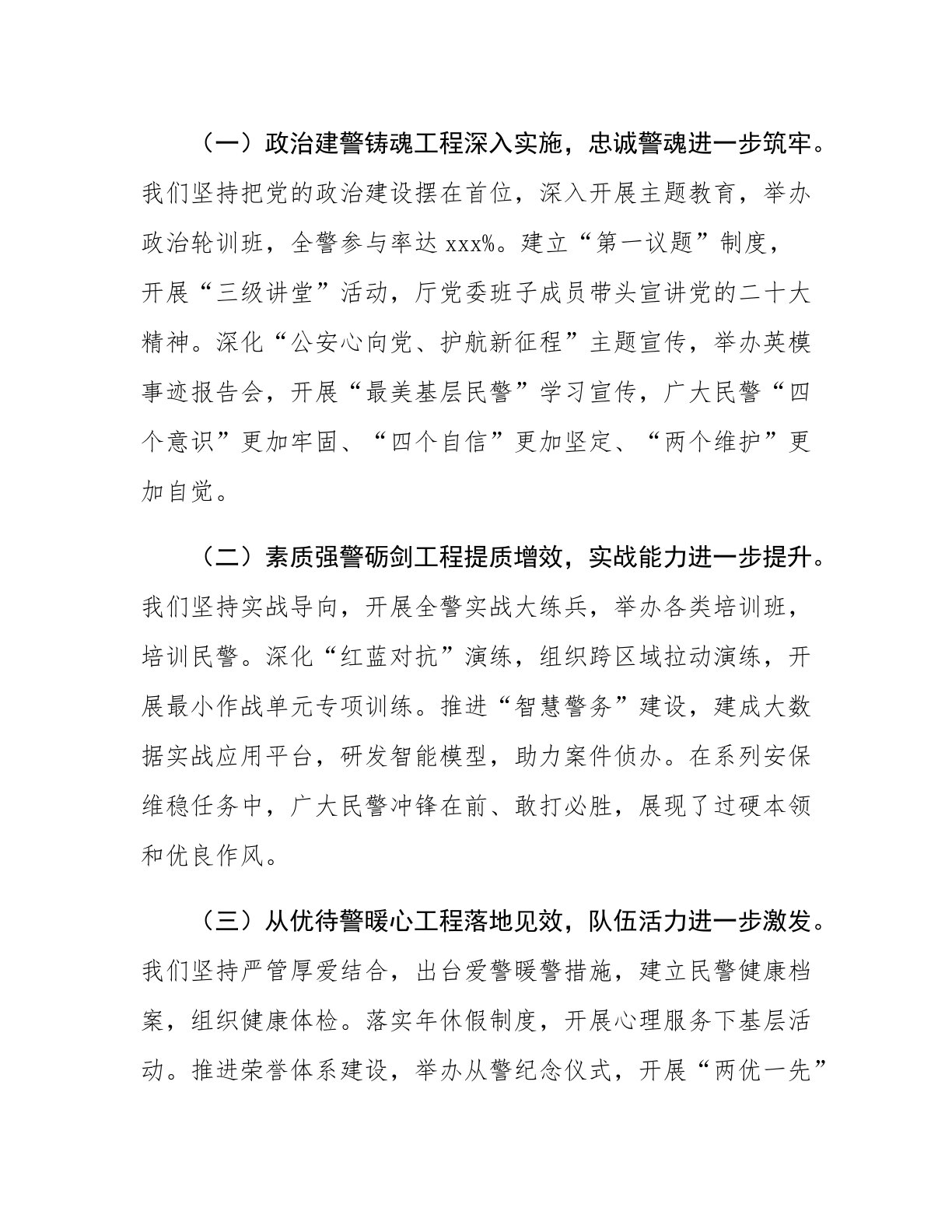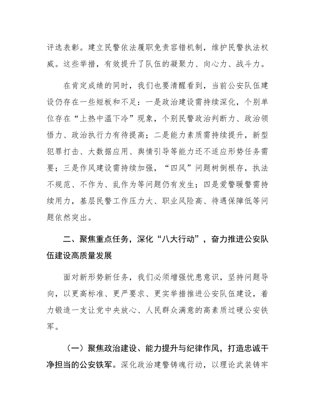 公安厅长在2025年全省公安队伍建设分析研判暨政治工作“八大行动”推进会上的讲话今天,我们召开全省公安队伍建设分析研判暨政治工作“八大行动”推进会,主要任务是深入学习贯彻党的二十大精神,全面落实全国公安厅局长会议和省委政法工作会议部署要求,总结成绩、分析形势、部署任务,动员全省公安机关以“八大行动”为抓手,着力锻造“四个铁一般”的高素质过硬公安铁军,为履行好新时代使命任务提供坚强保证。刚才,政治部通报了全省公安队伍建设情况,部分市局作了交流发言。下面,我讲三个方面意见。一、充分肯定成绩,清醒认识形势,切实增强推进公安队伍建设的责任感紧迫感过去一年,全省公安机关深入贯彻落实新时代党的建警治警方针...
