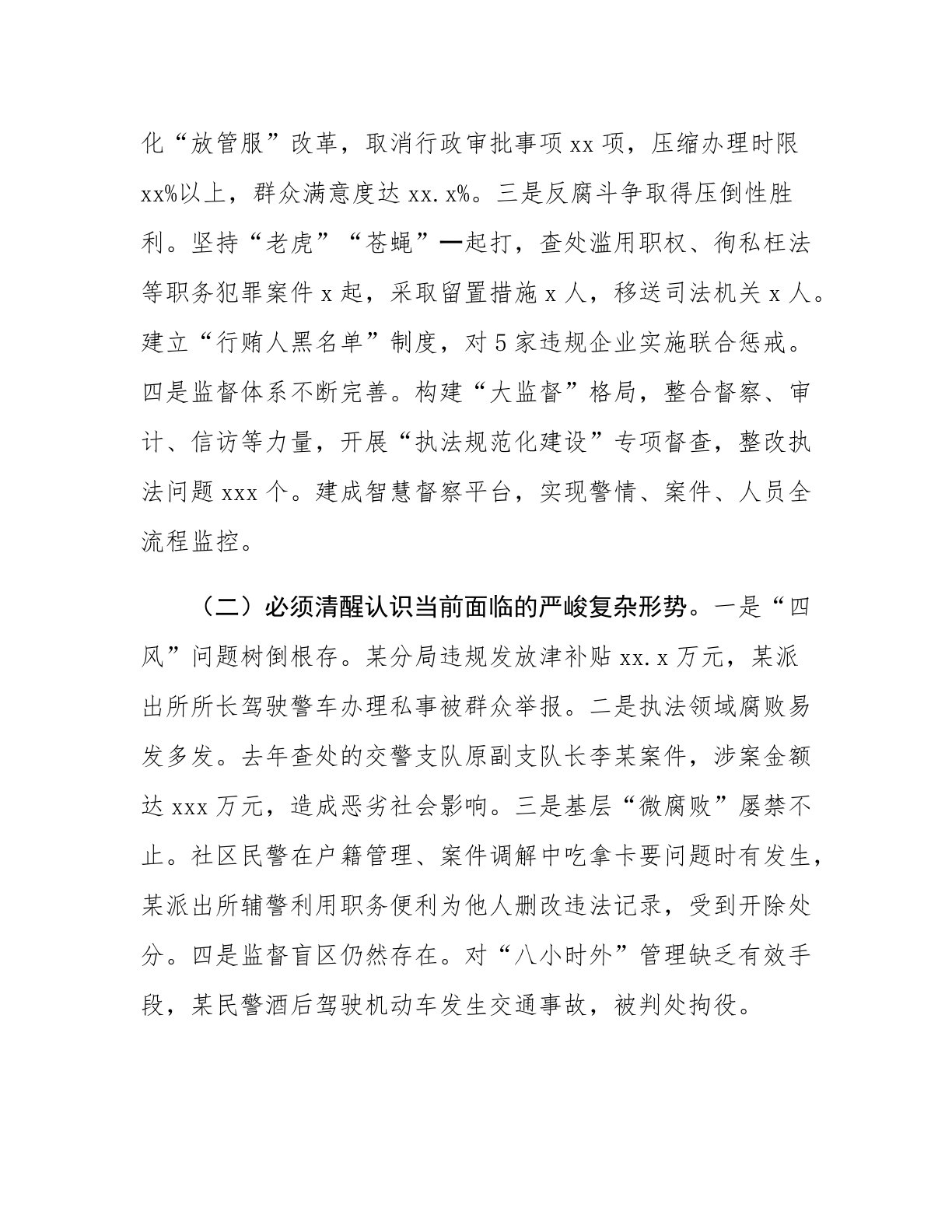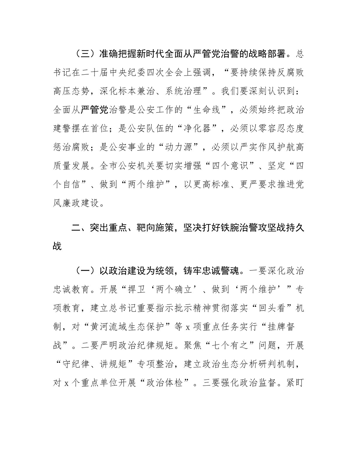 副市长在全市公安系统党风廉政建设会议上的讲话今天,我们召开全市公安系统党风廉政建设会议,主要任务是:以新时代中国特色社会主义思想为指导,深入贯彻党的二十大及二十届三中、四中全会精神,全面落实中央纪委四次全会、省纪委五次全会部署,总结工作、分析形势、部署任务,纵深推进全面从严管党治警,着力锻造“三个绝对”“四个铁一般”的高素质过硬公安铁军,为履行好新时代使命任务提供坚强纪律保障。下面,我讲三个方面意见。一、总结成绩、认清形势,切实增强全面从严管党治警的使命感紧迫感(一)过去一年党风廉政建设取得新成效。一是政治建警纵深推进。扎实开展“第一议题”制度落实专项督查,局党委带头学习总书记关于新时代公安工...
