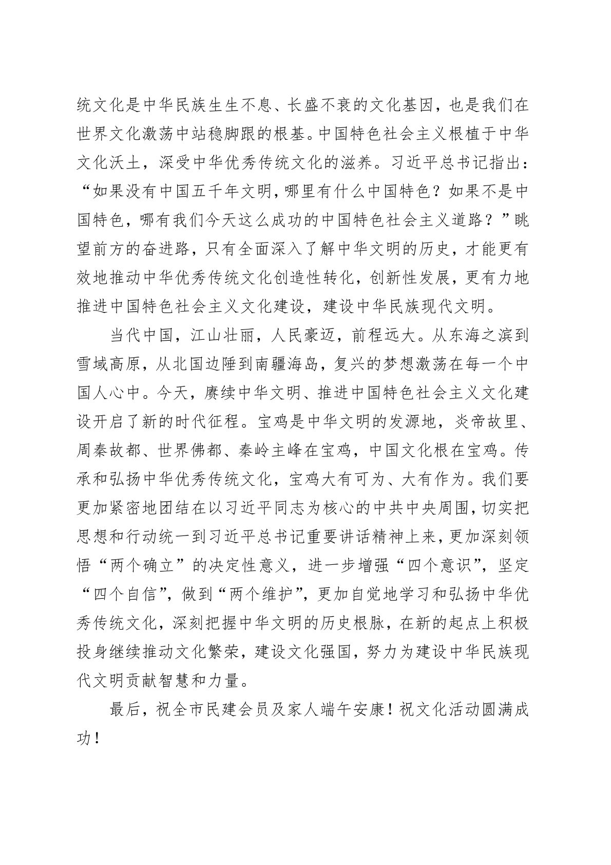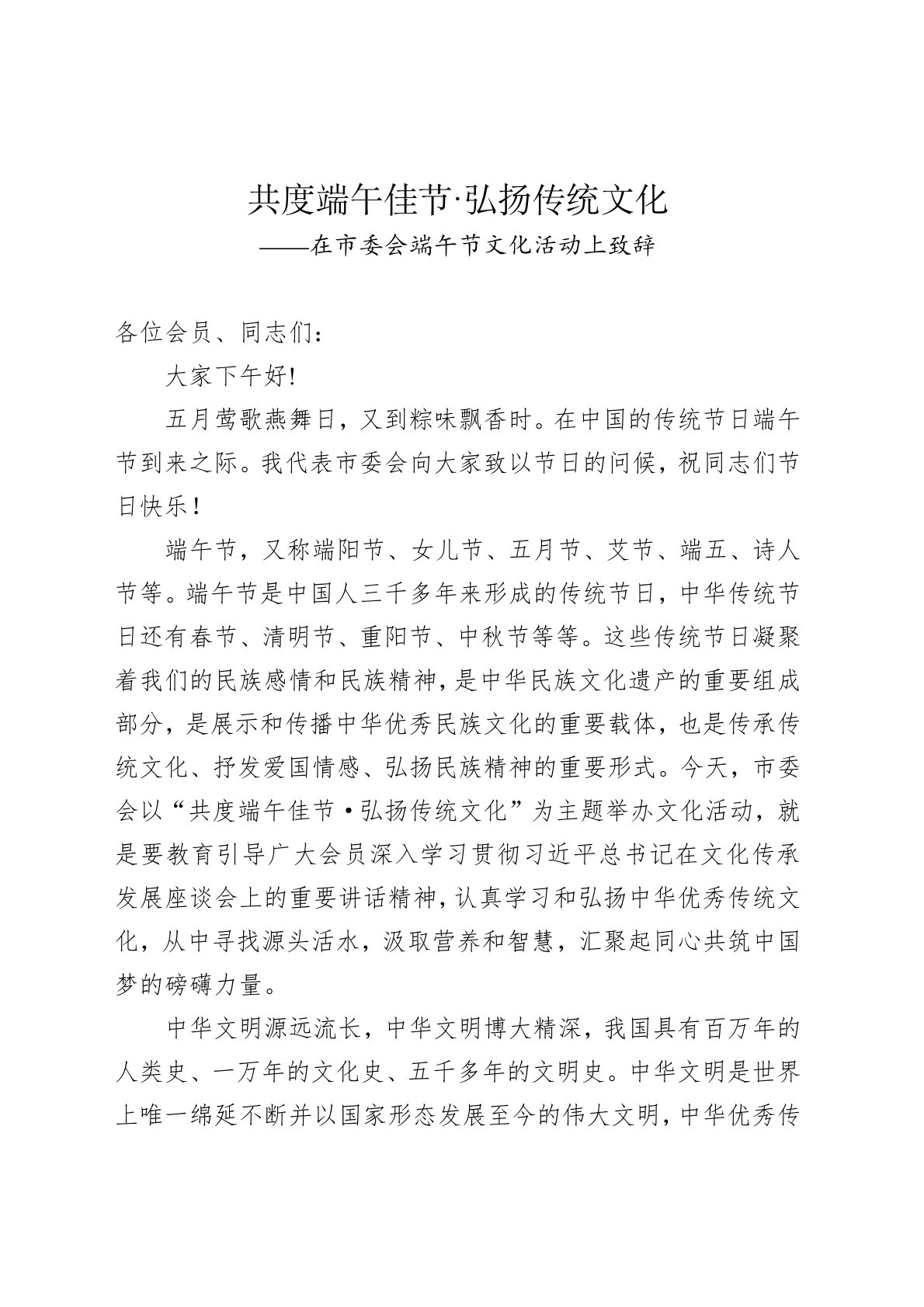 ——在市委会端午节文化活动上致辞各位会员、同志们:大家下午好!五月莺歌燕舞日,又到粽味飘香时。在中国的传统节日端午节到来之际。我代表市委会向大家致以节日的问候,祝同志们节日快乐!端午节,又称端阳节、女儿节、五月节、艾节、端五、诗人节等。端午节是中国人三千多年来形成的传统节日,中华传统节日还有春节、清明节、重阳节、中秋节等等。这些传统节日凝聚着我们的民族感情和民族精神,是中华民族文化遗产的重要组成部分,是展示和传播中华优秀民族文化的重要载体,也是传承传统文化、抒发爱国情感、弘扬民族精神的重要形式。今天,市委会以“共度端午佳节·弘扬传统文化”为主题举办文化活动,就是要教育引导广大会员深入学习贯彻习...