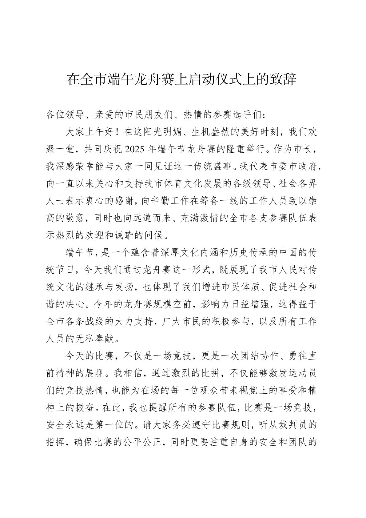 各位领导、亲爱的市民朋友们、热情的参赛选手们:大家上午好!在这阳光明媚、生机盎然的美好时刻,我们欢聚一堂,共同庆祝2025年端午节龙舟赛的隆重举行。作为市长,我深感荣幸能与大家一同见证这一传统盛事。我代表市委市政府,向一直以来关心和支持我市体育文化发展的各级领导、社会各界人士表示衷心的感谢,向辛勤工作在筹备一线的工作人员致以崇高的敬意,同时也向远道而来、充满激情的全市各支参赛队伍表示热烈的欢迎和诚挚的问候。端午节,是一个蕴含着深厚文化内涵和历史传承的中国的传统节日,今天我们通过龙舟赛这一形式,既展现了我市人民对传统文化的继承与发扬,也体现了我们增进市民体质、促进社会和谐的决心。今年的龙舟赛规模...