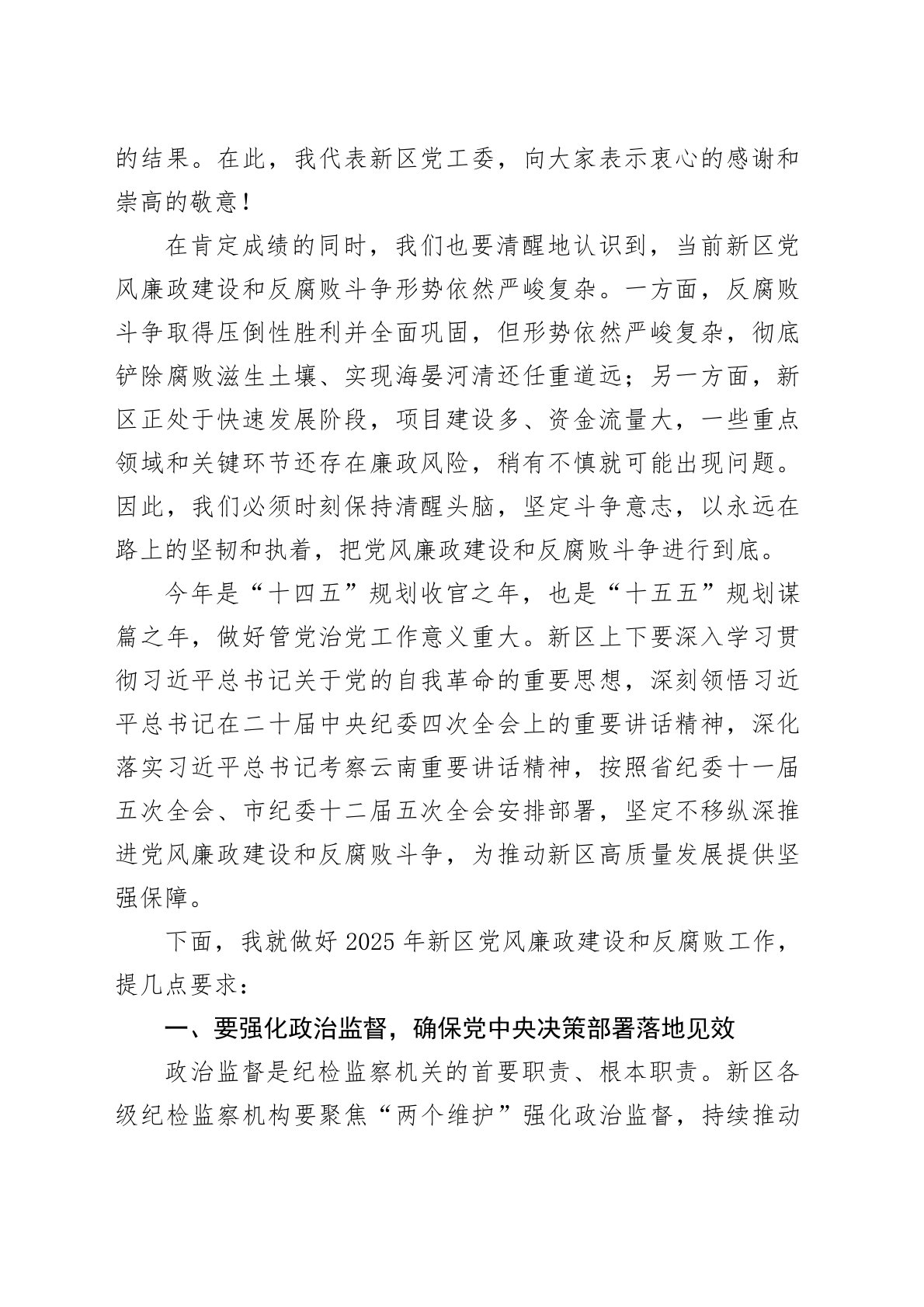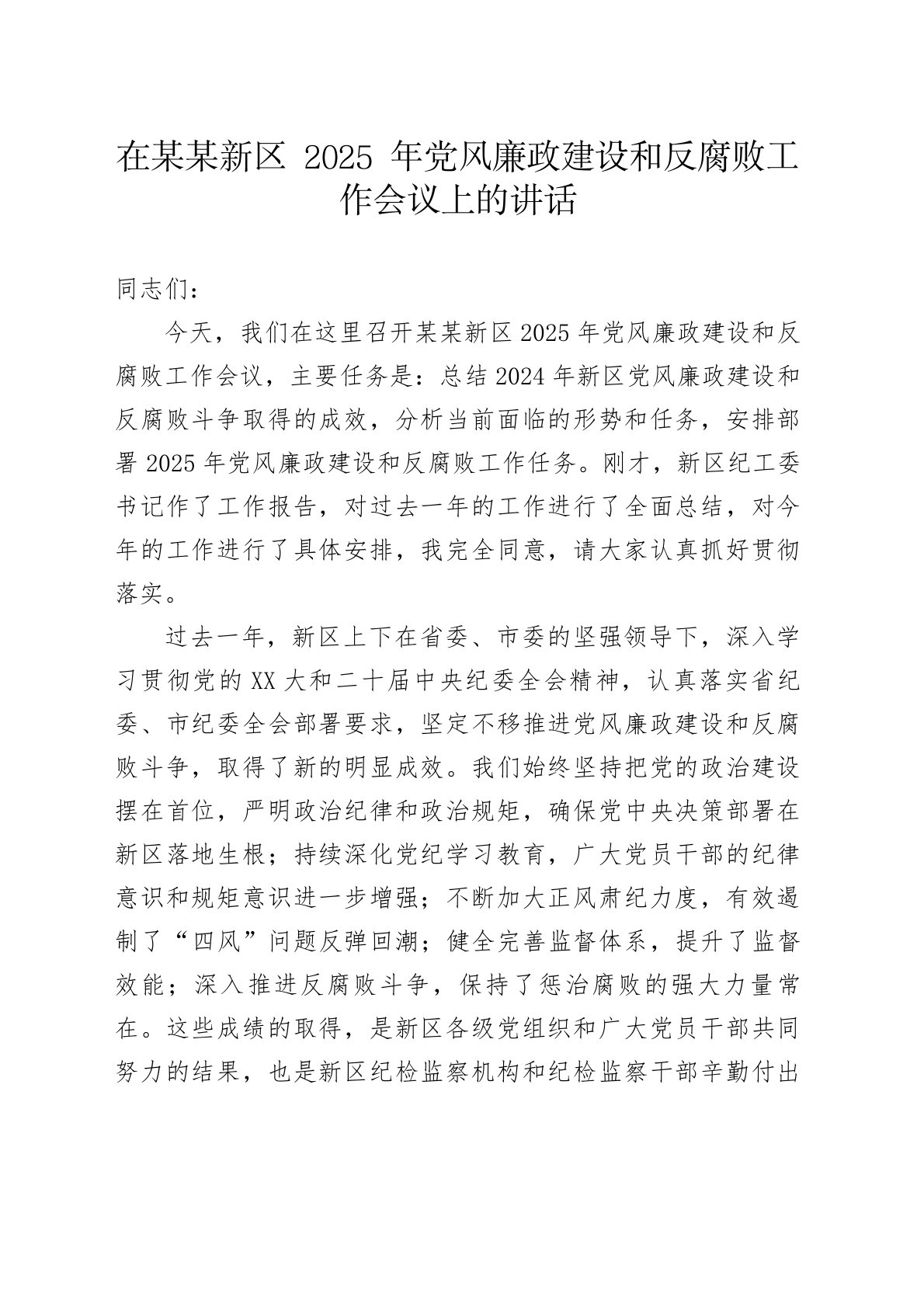在某某新区2025年党风廉政建设和反腐败工作会议上的讲话同志们:今天,我们在这里召开某某新区2025年党风廉政建设和反腐败工作会议,主要任务是:总结2024年新区党风廉政建设和反腐败斗争取得的成效,分析当前面临的形势和任务,安排部署2025年党风廉政建设和反腐败工作任务。刚才,新区纪工委书记作了工作报告,对过去一年的工作进行了全面总结,对今年的工作进行了具体安排,我完全同意,请大家认真抓好贯彻落实。过去一年,新区上下在省委、市委的坚强领导下,深入学习贯彻党的XX大和二十届中央纪委全会精神,认真落实省纪委、市纪委全会部署要求,坚定不移推进党风廉政建设和反腐败斗争,取得了新的明显成效。我们始终坚持...