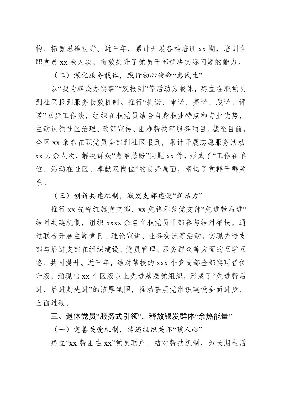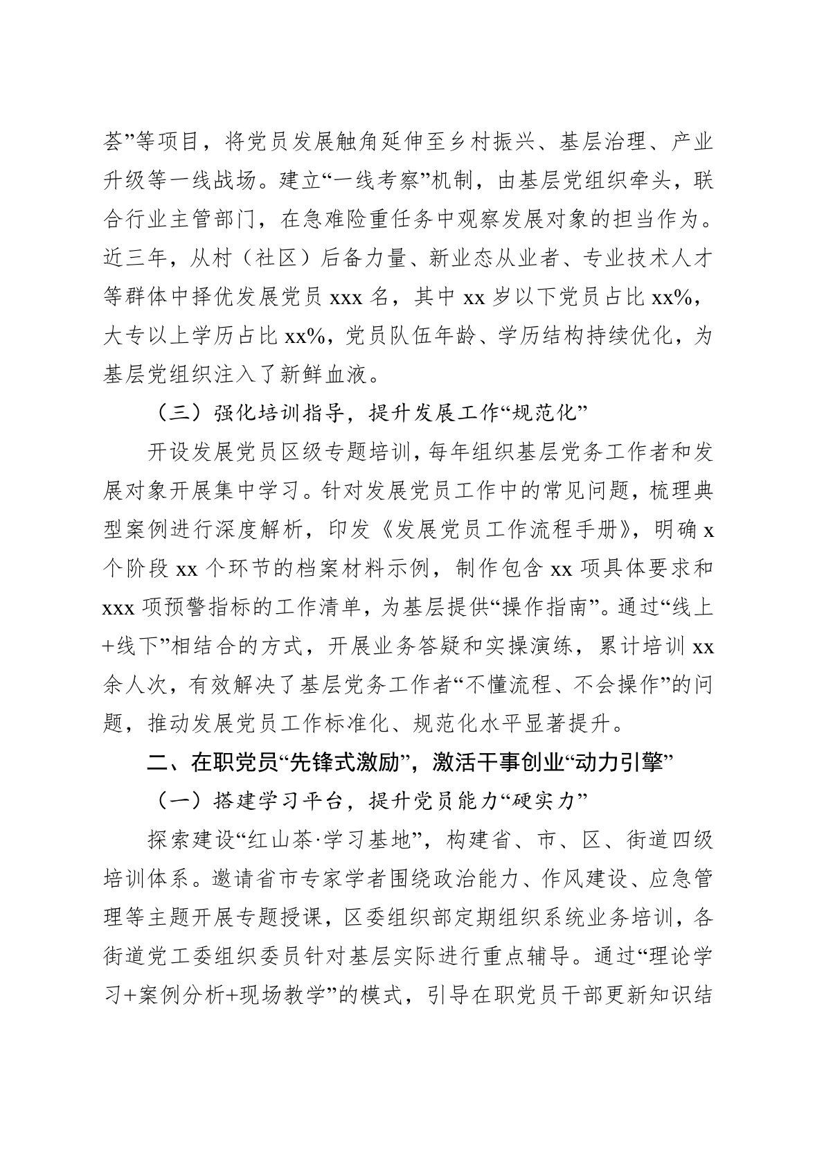 尊敬的各位领导,同志们:近年来,xx区始终将加强党员队伍建设作为夯实基层党建的重要抓手,积极探索“五式”分类联管工作法,靶向开展党员先锋模范“四大行动”,推动党员教育系统化、党员管理规范化、作用发挥常态化,为区域高质量发展提供了坚强组织保障。现将有关工作情况报告如下:一、新发展党员“源头式培养”,筑牢队伍建设“第一关口”(一)健全制度机制,严把政治审查“准入关”建立xx区公推培优严审等7项发展党员制度机制,构建基层党组织“全面掌握”初审、职能部门“深挖问题”联审、党委“持续考察”复审的三级过筛体系。聚焦入党动机、政治立场等核心要素,通过谈心谈话、实地走访、群众测评等方式,对发展对象进行全维度政...
