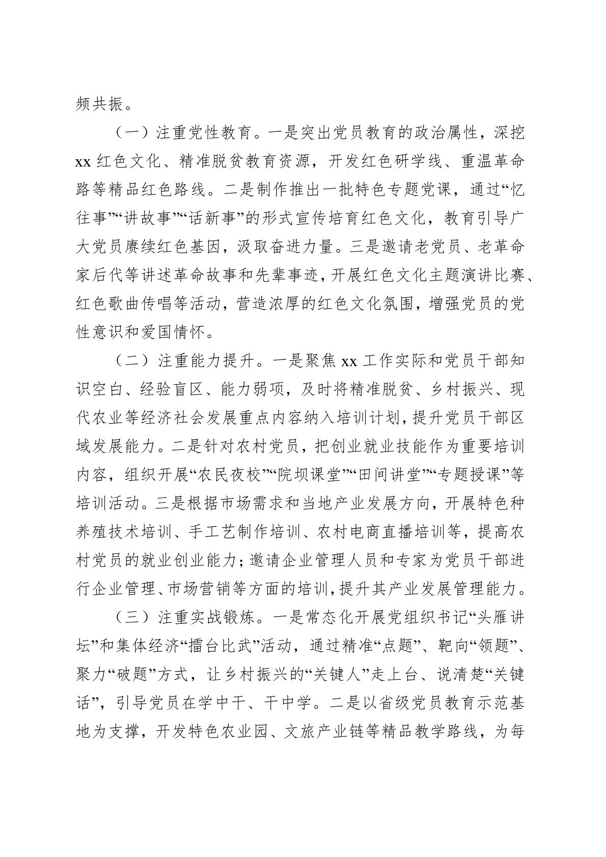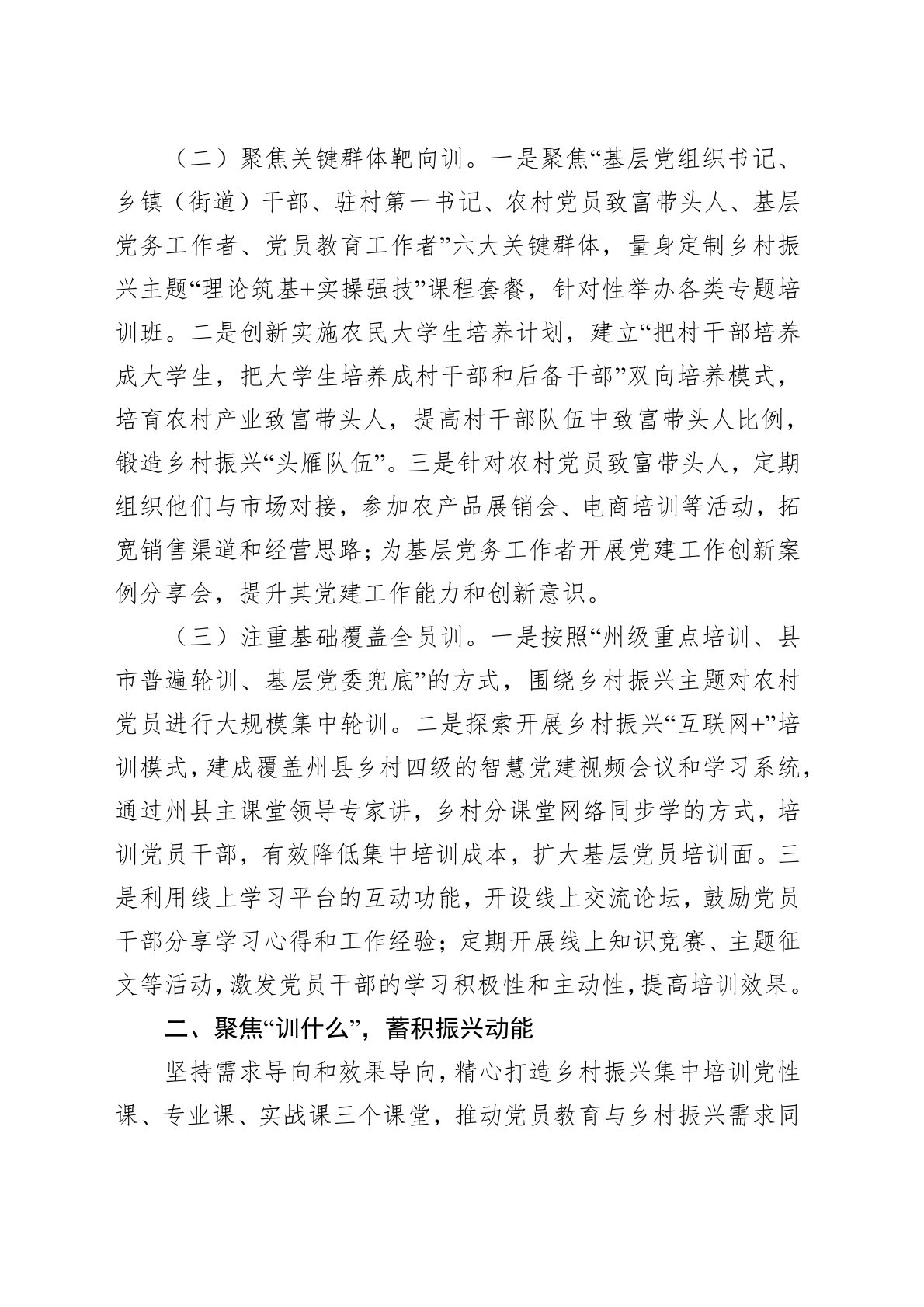 尊敬的各位领导,同志们:近年来,xx围绕乡村振兴中心任务,以增强党性修养为根本,以提升能力素质为重点,以强化工作本领为核心,全面加强基层党员教育培训,为乡村振兴提供强大思想政治保障和能力支撑。一、围绕“怎么训”,凝聚振兴共识紧扣乡村振兴主旋律,构建民族地区特色教育培训方式,凝聚推动乡村全面振兴强大内生动力。(一)紧扣主题主线深入训。一是抢抓xx精准扶贫首倡地、中国脱贫攻坚精神象征的重大机遇,建设xx乡村振兴学院,制作扶贫之歌,开发系列精品课程,展示习近平新时代中国特色社会主义思想的思想伟力,让党员干部在新时代脱贫攻坚经验中找到乡村振兴工作方向。二是充分利用群众生活习俗,以农村自然寨和社区网格为...