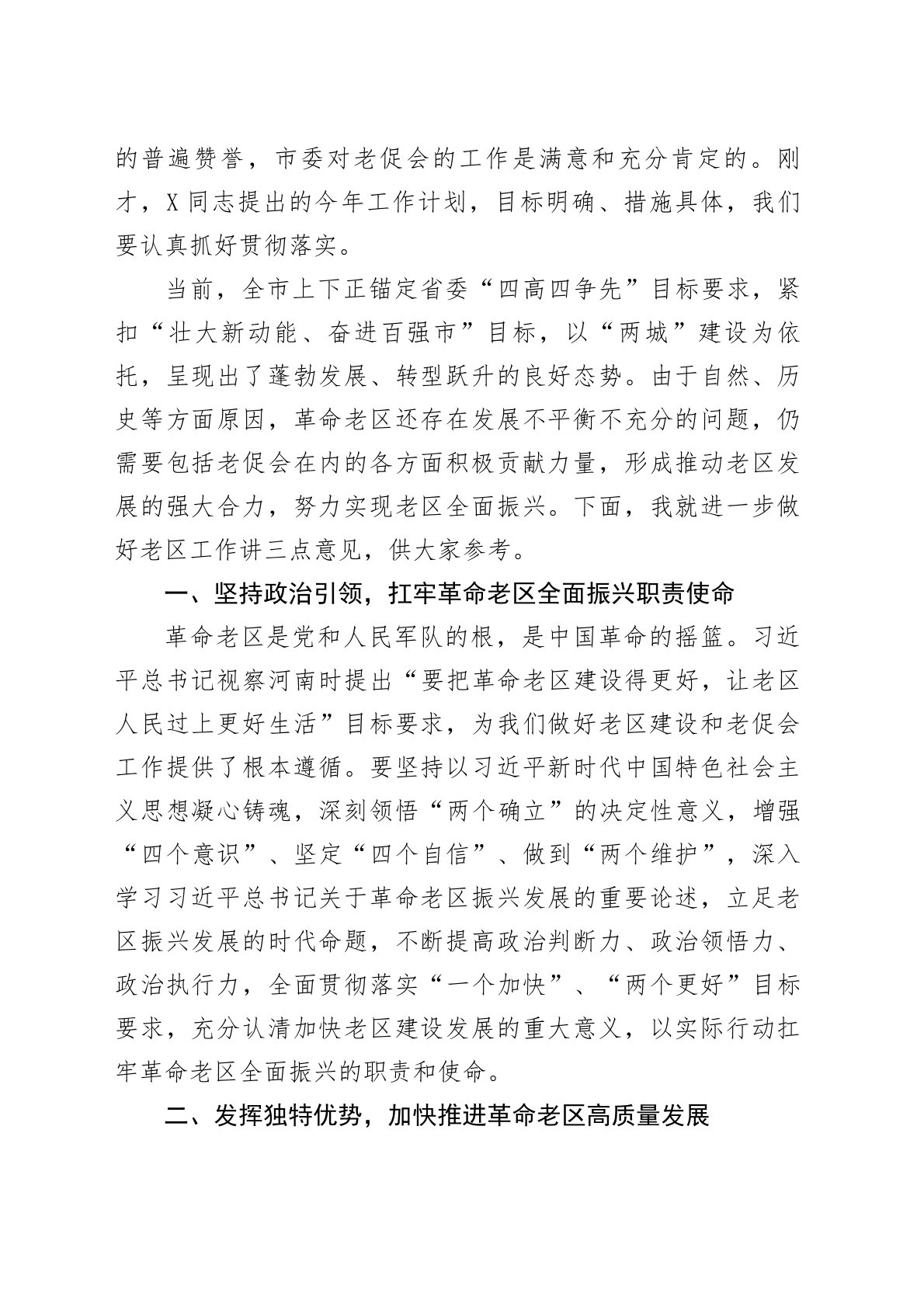 市委常委、统战部部长在市老区建设促进会理事会上的讲话尊敬的各位老领导,各位理事、同志们:今天,我们召开市老促会六届七次理事会议,看到各位老领导、老同志身体健康、精神饱满,感到非常高兴。在此,我代表市委、市政府,向会议的召开表示热烈的祝贺,向为老区建设发展辛勤付出的各位老领导、老同志和理事会成员致以崇高的敬意,向关心支持老区建设发展的社会各界表示衷心的感谢!刚才与大家一起观看了老促会工作专题片,X同志作了很好的工作报告,X同志宣读了市老促会“乡村振兴老区行”活动方案,X同志介绍了全市乡村振兴工作情况,大家要抓好贯彻落实,奋力谱写老区振兴新篇章。近年来,我市老促会始终秉持“全心全意为老区人民服务”...