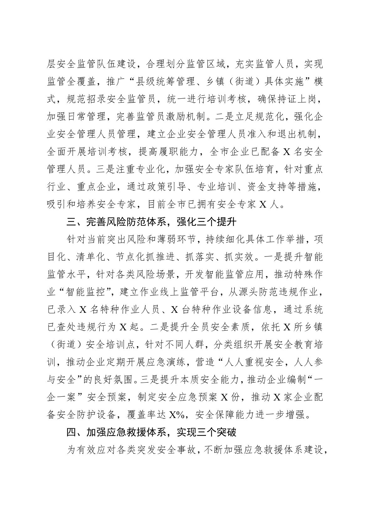 今年以来,X市委、市政府围绕健全长效治理机制,提升本质安全水平,立足实际谋划推进安全生产标准化、规范化、智能化、精细化建设,不断强化安全发展保障能力,推动经济社会高质量稳步向前发展。一、健全安全责任体系,落实三项机制始终将安全生产作为重中之重,市县两级党委常委会、政府常务会每月常态化研究安全生产工作,听取板块和部门安全生产工作汇报,推动工作落实。一是建立“三个一”工作机制,市县党政领导分别挂钩联系一个乡镇(街道)、每个乡镇(街道)建立一个安全培训点、每家重点企业制定一个安全管理方案。二是建立“抓典型、带整体”机制,打造安全生产示范乡镇(街道)、示范企业,推广先进经验和做法,以点带面提升安全生产...