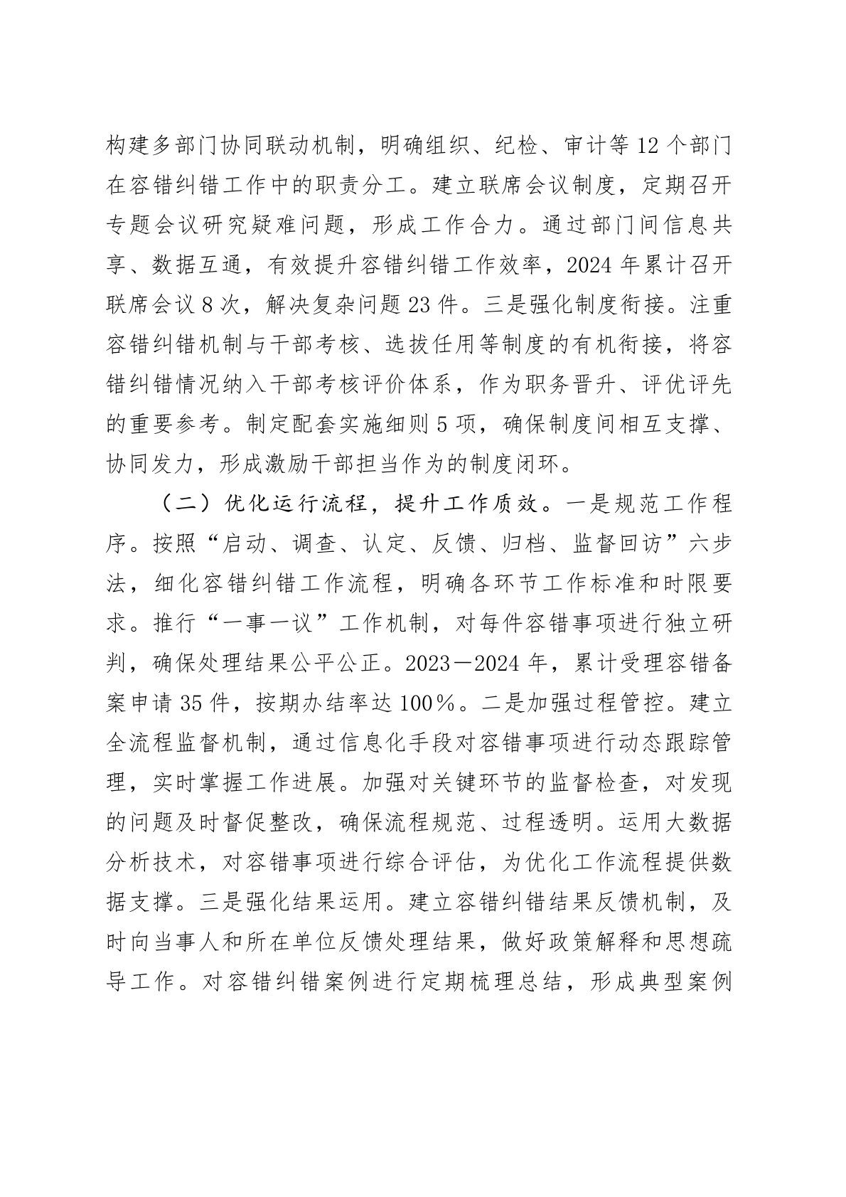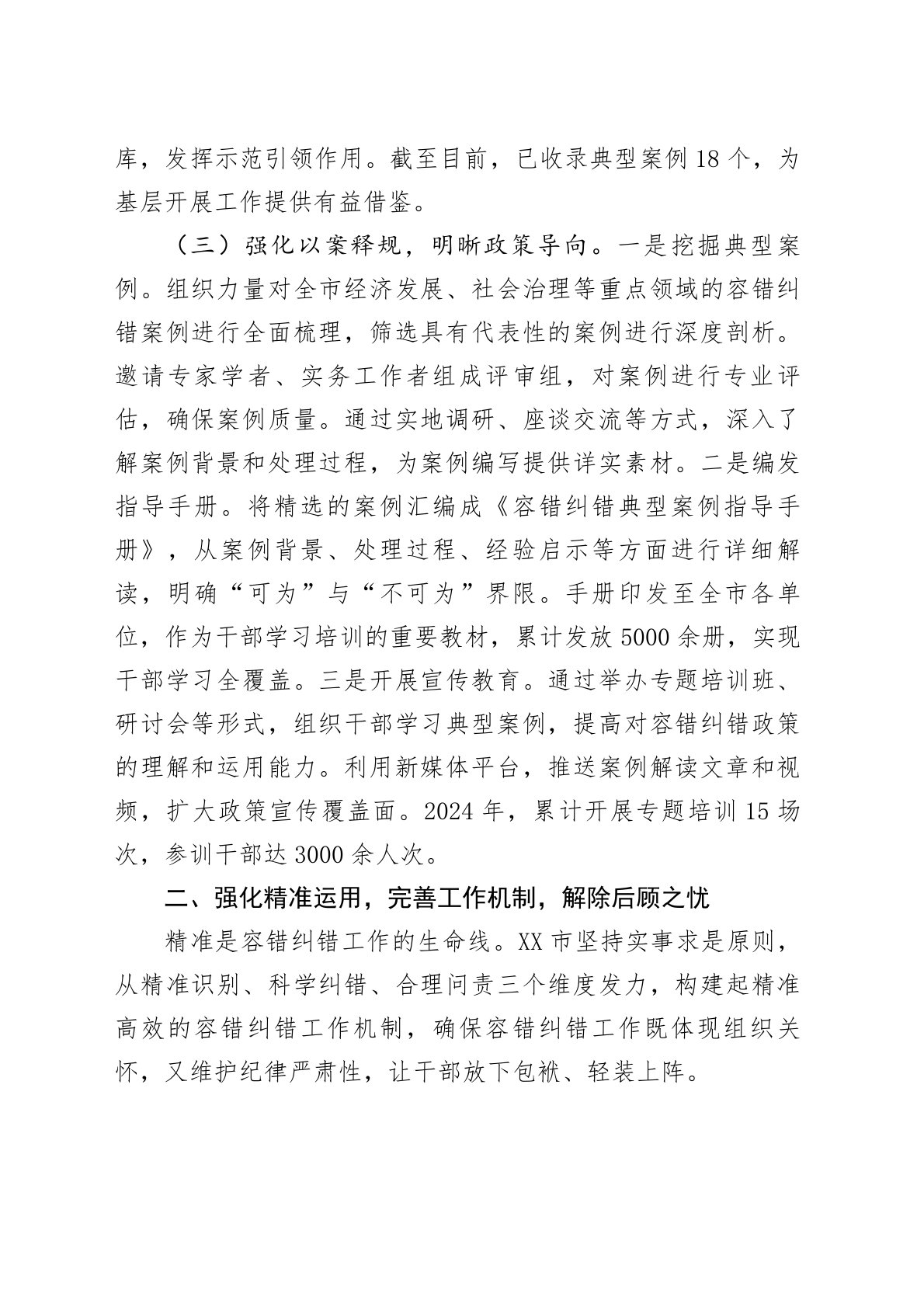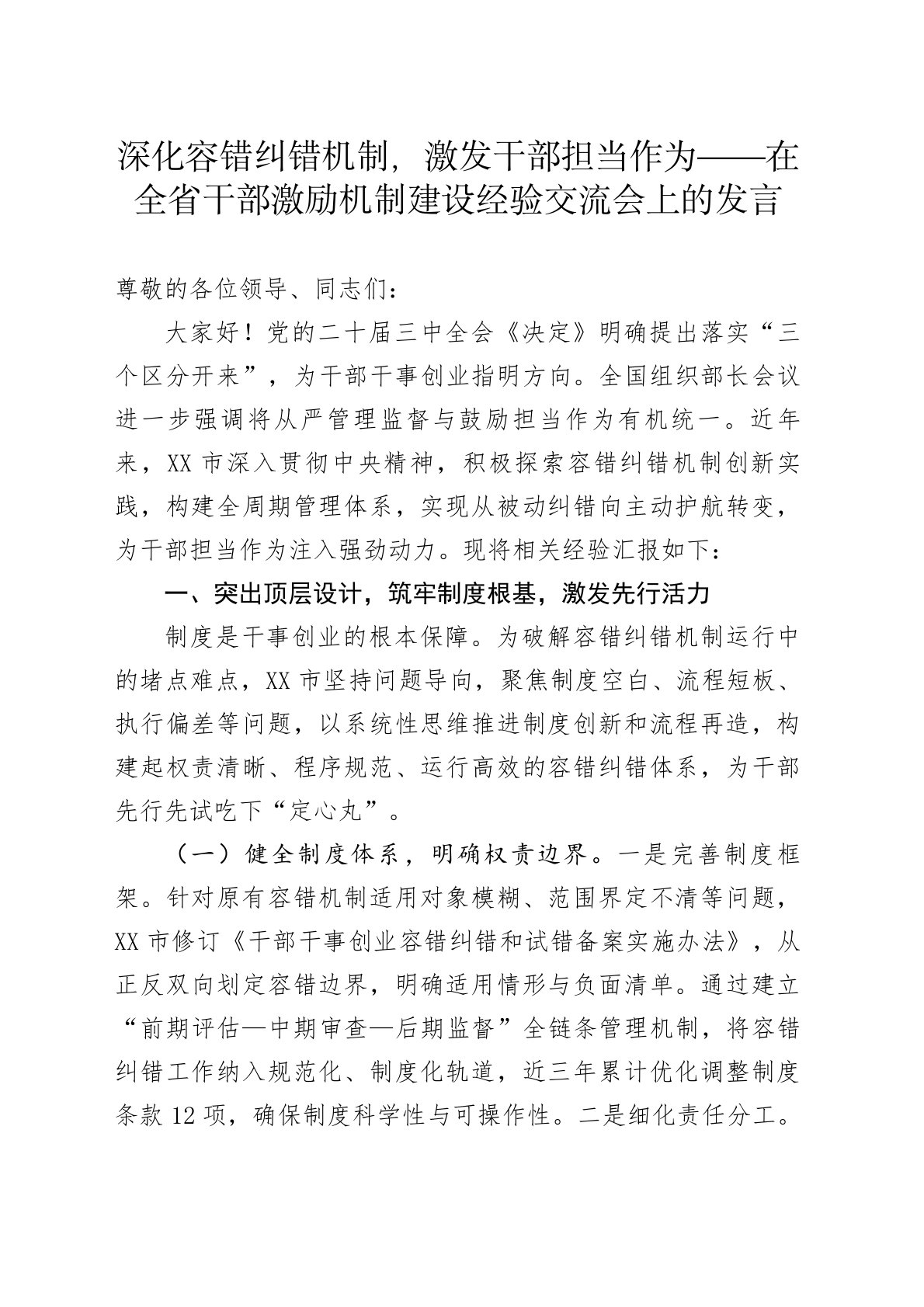 深化容错纠错机制,激发干部担当作为——在全省干部激励机制建设经验交流会上的发言尊敬的各位领导、同志们:大家好!党的二十届三中全会《决定》明确提出落实“三个区分开来”,为干部干事创业指明方向。全国组织部长会议进一步强调将从严管理监督与鼓励担当作为有机统一。近年来,XX市深入贯彻中央精神,积极探索容错纠错机制创新实践,构建全周期管理体系,实现从被动纠错向主动护航转变,为干部担当作为注入强劲动力。现将相关经验汇报如下:一、突出顶层设计,筑牢制度根基,激发先行活力制度是干事创业的根本保障。为破解容错纠错机制运行中的堵点难点,XX市坚持问题导向,聚焦制度空白、流程短板、执行偏差等问题,以系统性思维推进制...
