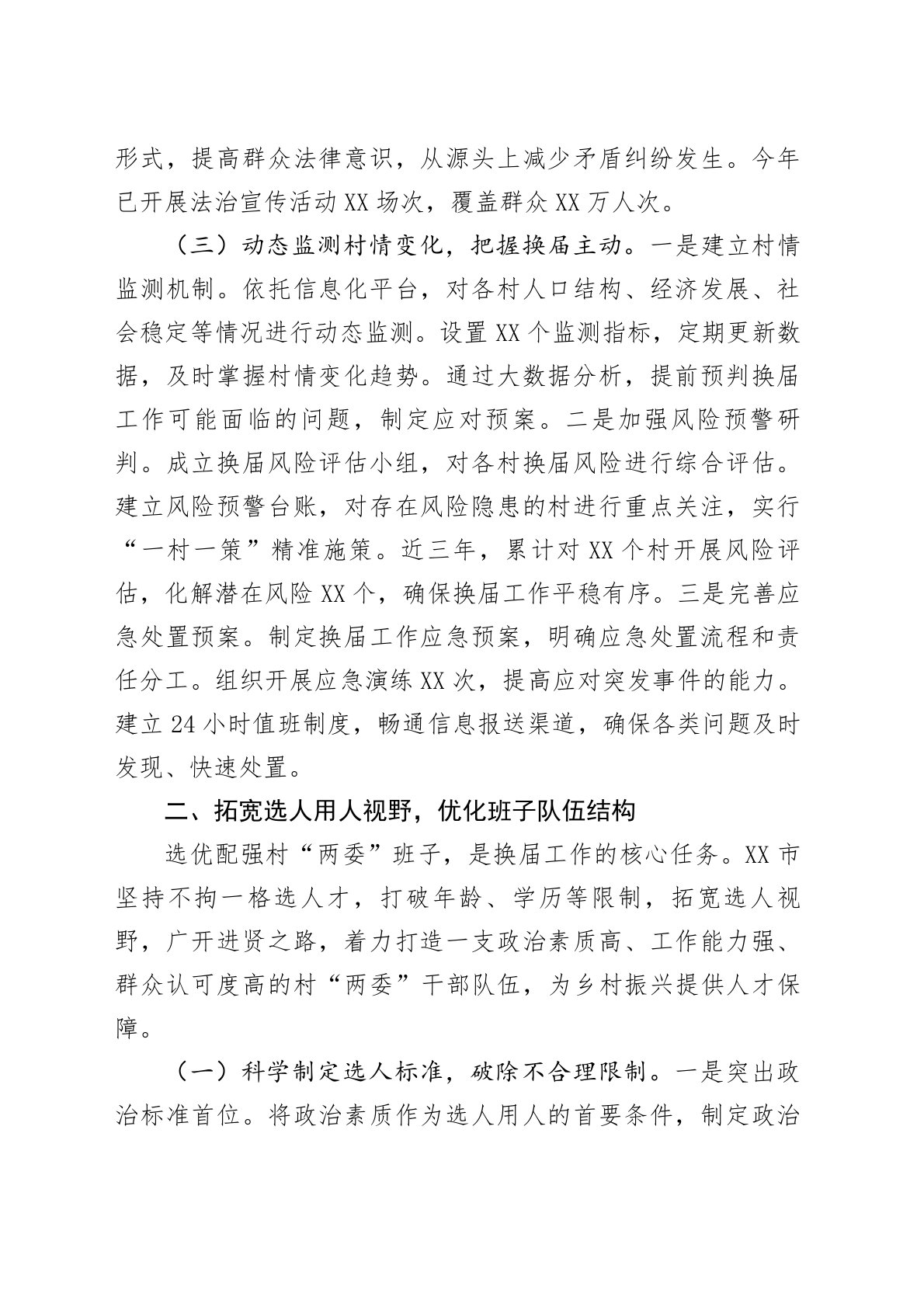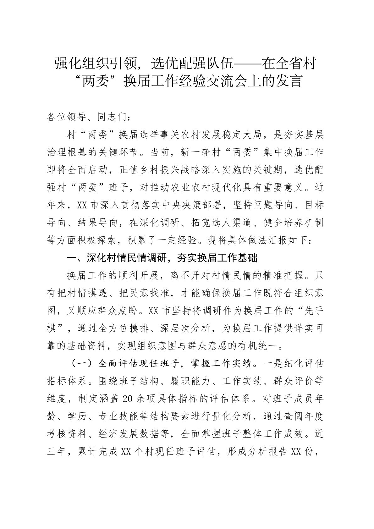 强化组织引领,选优配强队伍——在全省村“两委”换届工作经验交流会上的发言各位领导、同志们:村“两委”换届选举事关农村发展稳定大局,是夯实基层治理根基的关键环节。当前,新一轮村“两委”集中换届工作即将全面启动,正值乡村振兴战略深入实施的关键期,选优配强村“两委”班子,对推动农业农村现代化具有重要意义。近年来,XX市深入贯彻落实中央决策部署,坚持问题导向、目标导向、结果导向,在深化调研、拓宽选人渠道、健全培养机制等方面积极探索,积累了一定经验。现将具体做法汇报如下:一、深化村情民情调研,夯实换届工作基础换届工作的顺利开展,离不开对村情民情的精准把握。只有把村情摸透、把民意找准,才能确保换届工作既符...