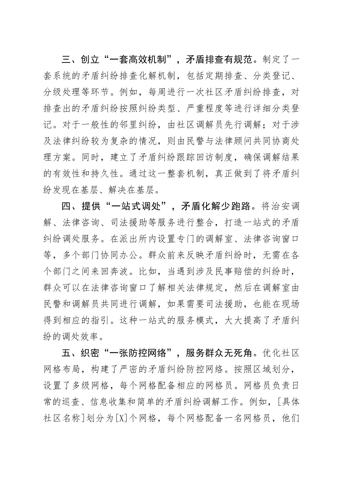 派出所矛盾纠纷排查化解经验交流今年以来,我所深入贯彻落实新时代“枫桥经验”,积极探索矛盾纠纷一站式、多元化解决机制,致力于构建和谐稳定的辖区环境,将矛盾纠纷排查化解工作落到实处。一、构建“一个交流平台”,群众诉求有处应。整合所内资源,联合社区居委会、街道办事处等多方力量,搭建了一个综合性的矛盾纠纷排查化解平台。这个平台犹如一个信息中枢,将各类矛盾纠纷信息进行集中收集与处理。例如,在[具体社区名称],我们打造了集矛盾纠纷受理、法律咨询、调解协商等多功能于一体的社区服务站,面积达x平方米,切实落实了让群众遇到问题有地方反映的要求。在这里,群众可以一站式地表达自己的诉求,无论是邻里纠纷还是其他民事争...