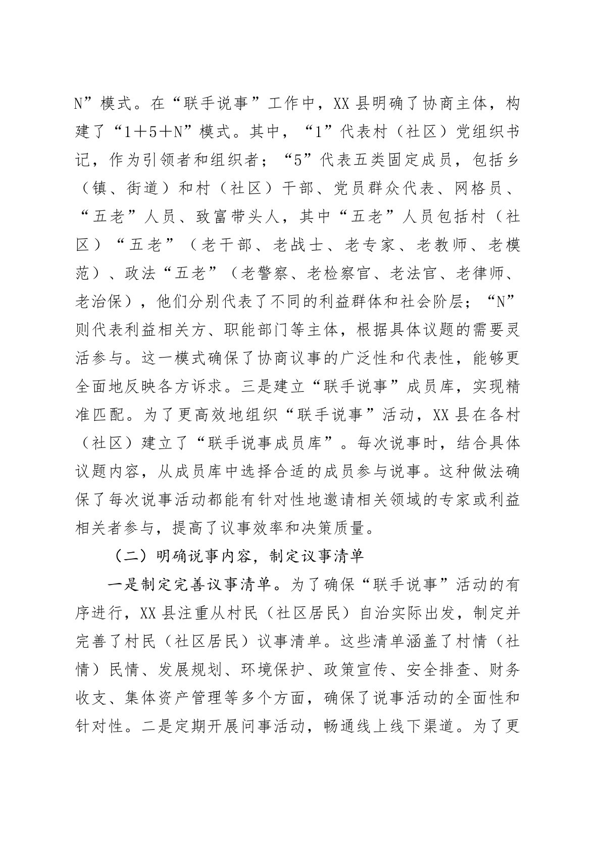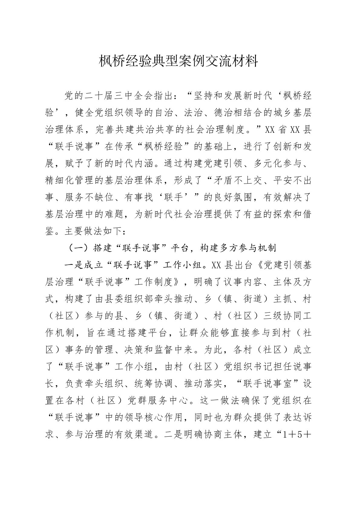 枫桥经验典型案例交流材料党的二十届三中全会指出:“坚持和发展新时代‘枫桥经验’,健全党组织领导的自治、法治、德治相结合的城乡基层治理体系,完善共建共治共享的社会治理制度。”XX省XX县“联手说事”在传承“枫桥经验”的基础上,进行了创新和发展,赋予了新的时代内涵。通过构建党建引领、多元化参与、精细化管理的基层治理体系,形成了“矛盾不上交、平安不出事、服务不缺位、有事找‘联手’”的良好氛围,有效解决了基层治理中的难题,为新时代社会治理提供了有益的探索和借鉴。主要做法如下:(一)搭建“联手说事”平台,构建多方参与机制一是成立“联手说事”工作小组。XX县出台《党建引领基层治理“联手说事”工作制度》,明...