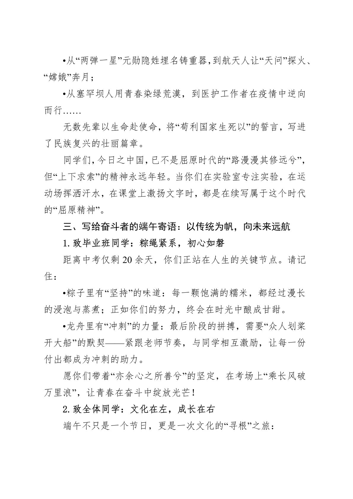 尊敬的老师们、亲爱的同学们:“碧艾香蒲处处忙,谁家儿共女,庆端阳。”当艾草的清香弥漫校园,当粽叶的青绿包裹温情,我们又一次迎来了中华民族的传统佳节——端午节。在此,我代表学校向全体师生及关心教育事业的各界人士,致以最真挚的节日祝福!一、粽香里的千年传承:品味文化根脉两千余年时光流转,端午的民俗里始终藏着中国人的精神密码:•吃粽子,是对“廉洁正直”的纪念——屈原“宁赴湘流,葬于江鱼之腹中”的气节,化作糯米的软糯与粽叶的清芬,让高洁品格代代相传;•赛龙舟,是对“团结奋进”的诠释——众人划桨、击鼓声中,凝结着中华民族同舟共济、百折不挠的力量;•插艾蒲,是对“平安顺遂”的祈愿——青青艾草悬于门楣,既承...