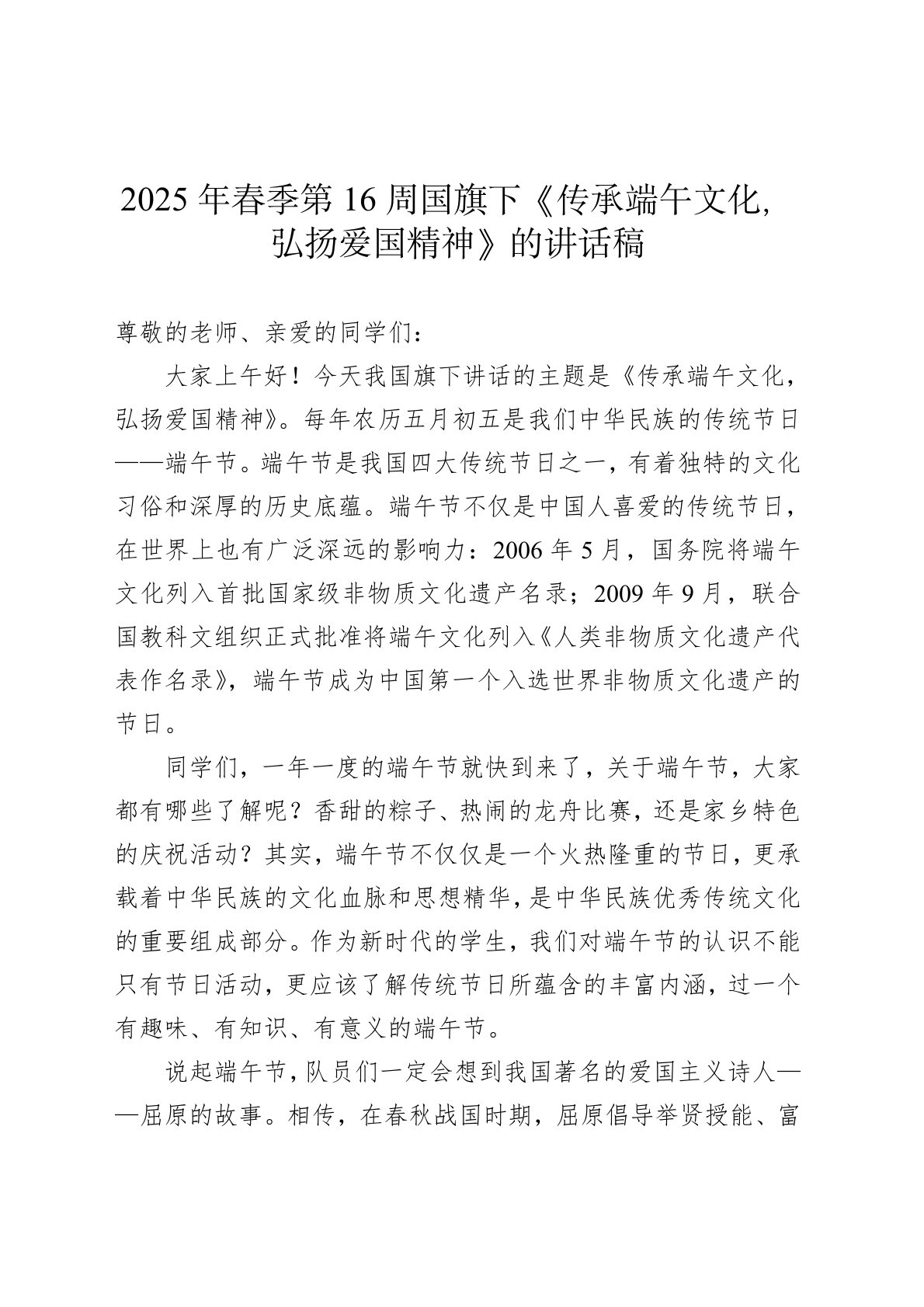 2025年春季第16周国旗下《传承端午文化,弘扬爱国精神》的讲话稿