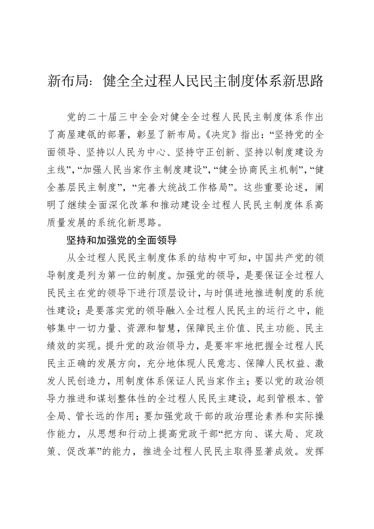 党的二十届三中全会对健全全过程人民民主制度体系作出了高屋建瓴的部署,彰显了新布局。《决定》指出:“坚持党的全面领导、坚持以人民为中心、坚持守正创新、坚持以制度建设为主线”,“加强人民当家作主制度建设”,“健全协商民主机制”,“健全基层民主制度”,“完善大统战工作格局”。这些重要论述,阐明了继续全面深化改革和推动建设全过程人民民主制度体系高质量发展的系统化新思路。坚持和加强党的全面领导从全过程人民民主制度体系的结构中可知,中国共产党的领导制度是列为第一位的制度。加强党的领导,是要保证全过程人民民主在党的领导下进行顶层设计,与时俱进地推进制度的系统性建设;是要落实党的领导融入全过程人民民主的运行之...