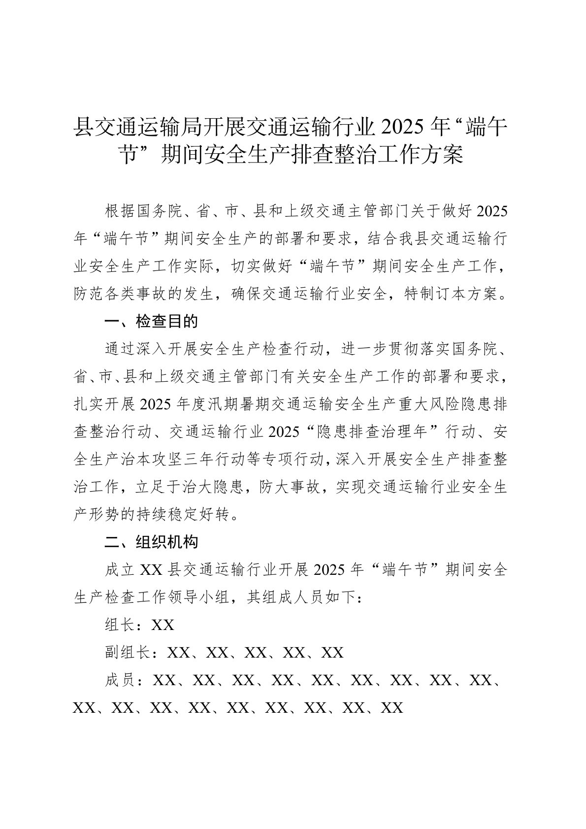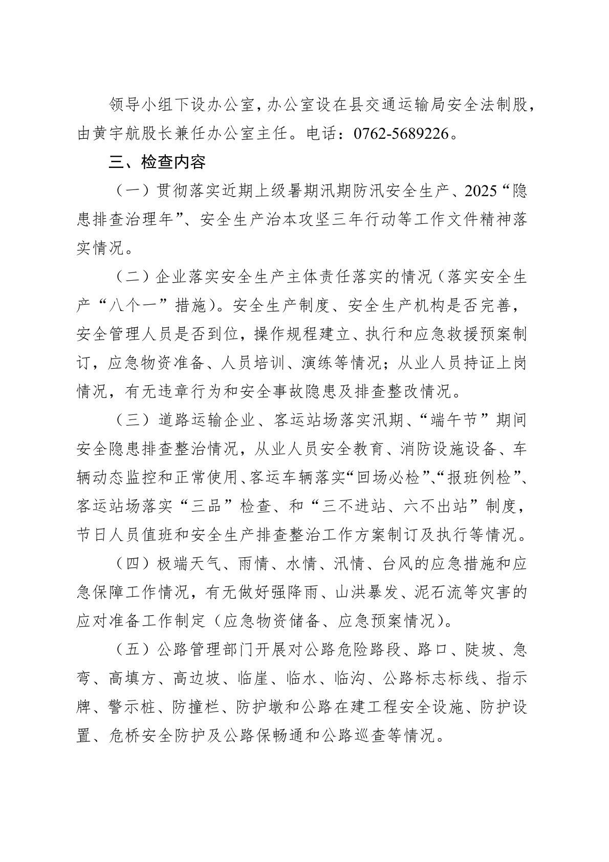 根据国务院、省、市、县和上级交通主管部门关于做好2025年“端午节”期间安全生产的部署和要求,结合我县交通运输行业安全生产工作实际,切实做好“端午节”期间安全生产工作,防范各类事故的发生,确保交通运输行业安全,特制订本方案。一、检查目的通过深入开展安全生产检查行动,进一步贯彻落实国务院、省、市、县和上级交通主管部门有关安全生产工作的部署和要求,扎实开展2025年度汛期暑期交通运输安全生产重大风险隐患排查整治行动、交通运输行业2025“隐患排查治理年”行动、安全生产治本攻坚三年行动等专项行动,深入开展安全生产排查整治工作,立足于治大隐患,防大事故,实现交通运输行业安全生产形势的持续稳定好转。二、...