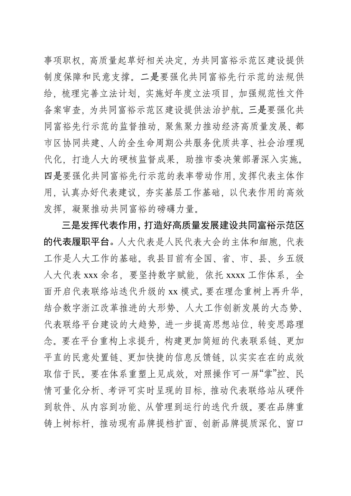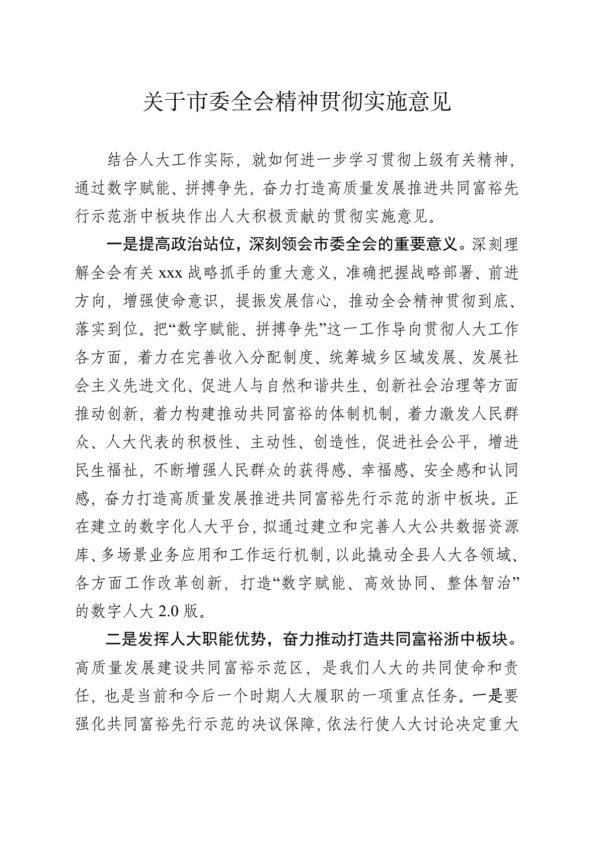 关于市委全会精神贯彻实施意见结合人大工作实际,就如何进一步学习贯彻上级有关精神,通过数字赋能、拼搏争先,奋力打造高质量发展推进共同富裕先行示范浙中板块作出人大积极贡献的贯彻实施意见。一是提高政治站位,深刻领会市委全会的重要意义。深刻理解全会有关习近平战略抓手的重大意义,准确把握战略部署、前进方向,增强使命意识,提振发展信心,推动全会精神贯彻到底、落实到位。把“数字赋能、拼搏争先”这一工作导向贯彻人大工作各方面,着力在完善收入分配制度、统筹城乡区域发展、发展社会主义先进文化、促进人与自然和谐共生、创新社会治理等方面推动创新,着力构建推动共同富裕的体制机制,着力激发人民群众、人大代表的积极性、主动...