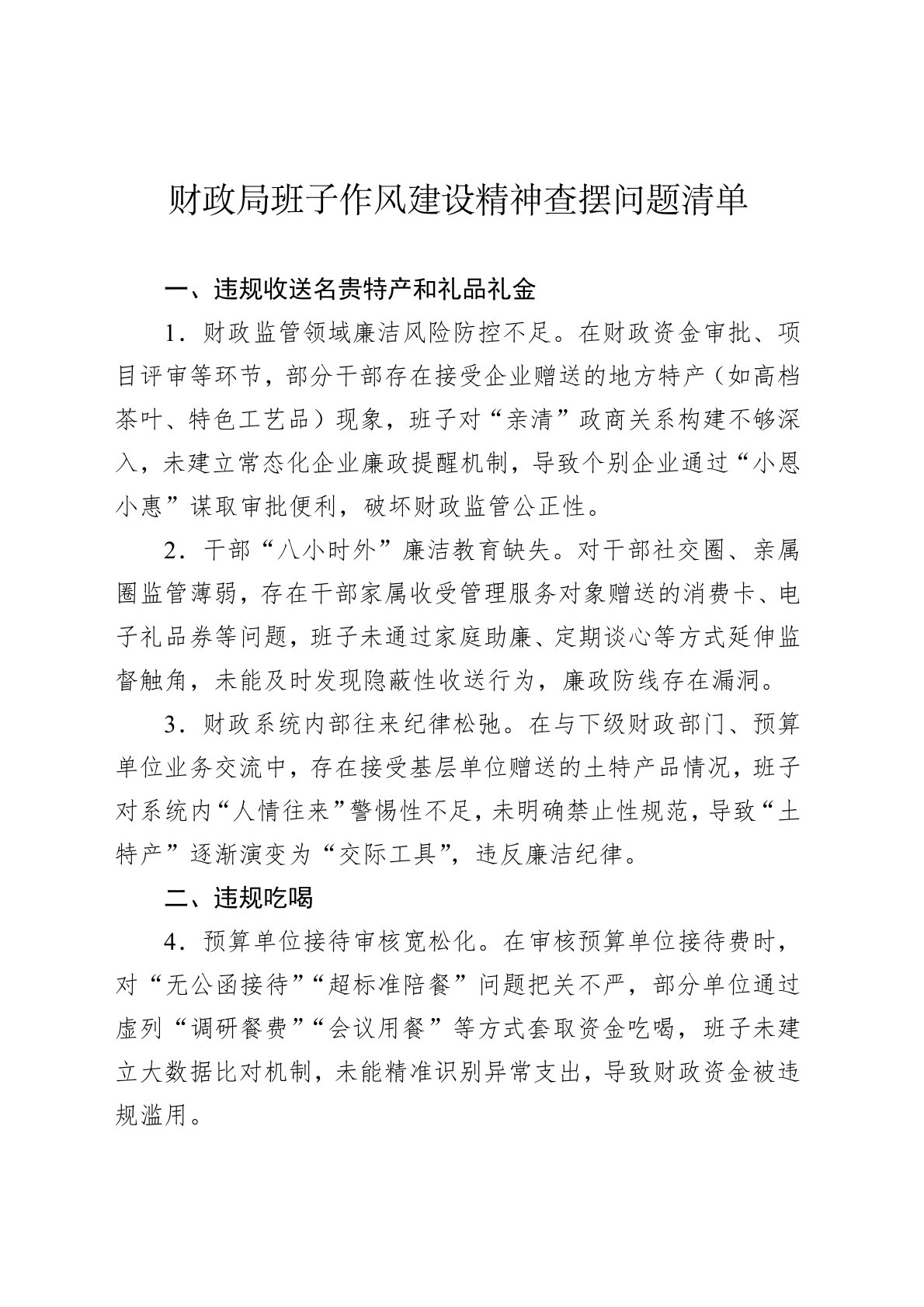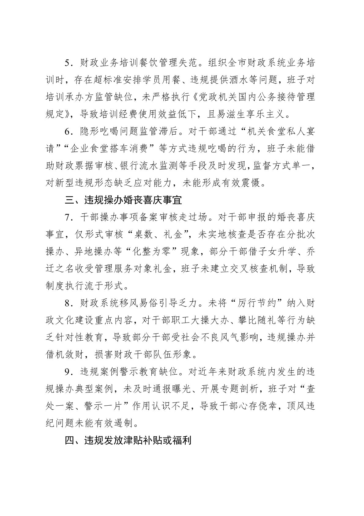 一、违规收送名贵特产和礼品礼金1.财政监管领域廉洁风险防控不足。在财政资金审批、项目评审等环节,部分干部存在接受企业赠送的地方特产(如高档茶叶、特色工艺品)现象,班子对“亲清”政商关系构建不够深入,未建立常态化企业廉政提醒机制,导致个别企业通过“小恩小惠”谋取审批便利,破坏财政监管公正性。2.干部“八小时外”廉洁教育缺失。对干部社交圈、亲属圈监管薄弱,存在干部家属收受管理服务对象赠送的消费卡、电子礼品券等问题,班子未通过家庭助廉、定期谈心等方式延伸监督触角,未能及时发现隐蔽性收送行为,廉政防线存在漏洞。3.财政系统内部往来纪律松弛。在与下级财政部门、预算单位业务交流中,存在接受基层单位赠送的土...