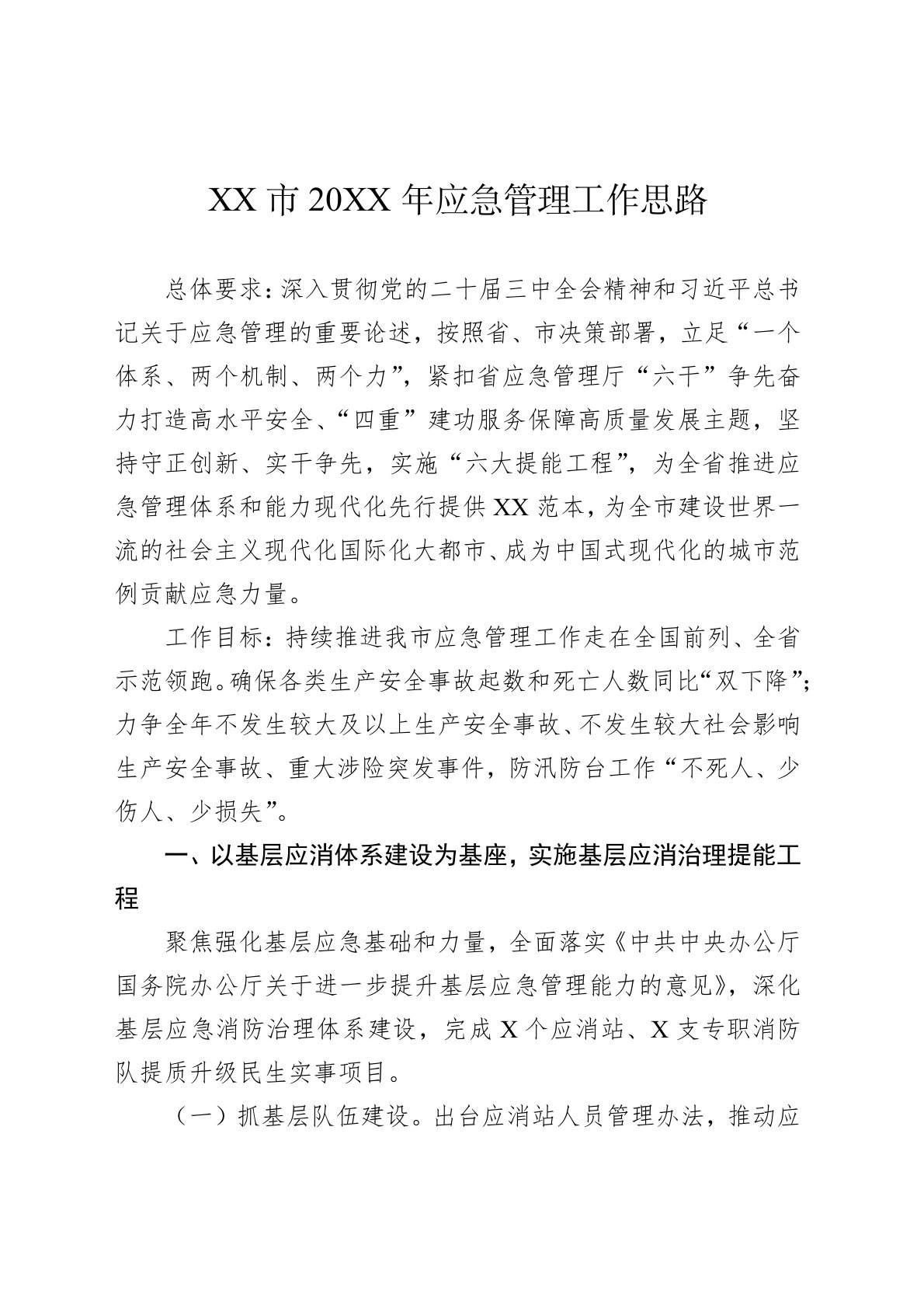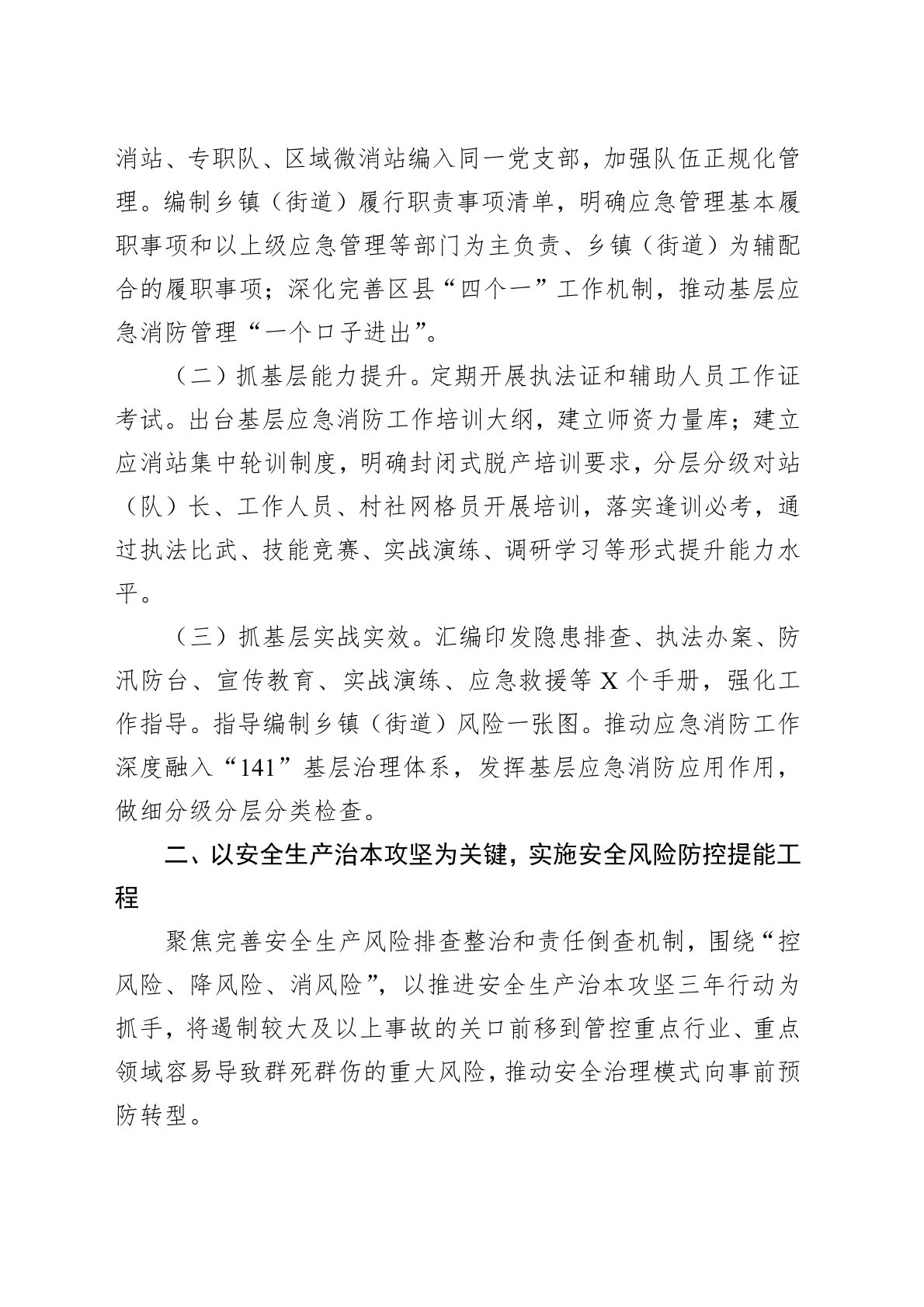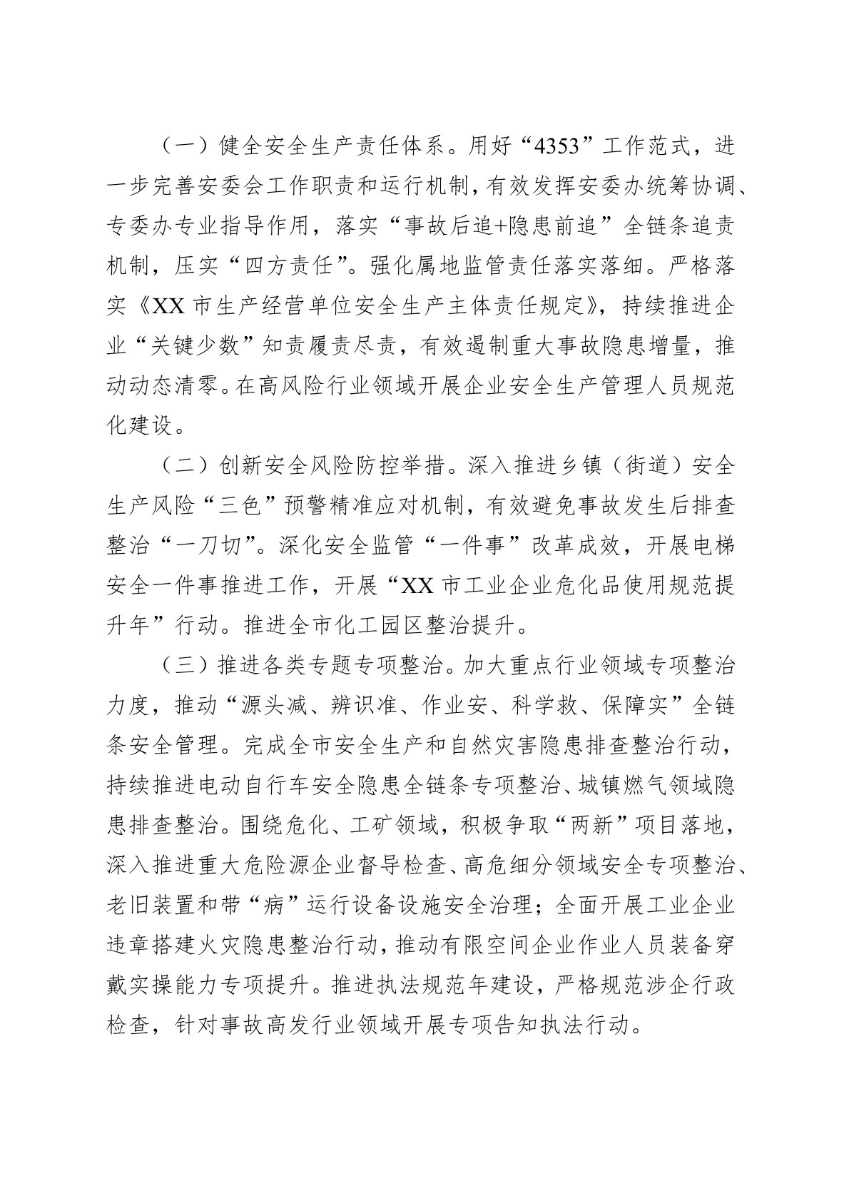 总体要求:深入贯彻党的二十届三中全会精神和习近平总书记关于应急管理的重要论述,按照省、市决策部署,立足“一个体系、两个机制、两个力”,紧扣省应急管理厅“六干”争先奋力打造高水平安全、“四重”建功服务保障高质量发展主题,坚持守正创新、实干争先,实施“六大提能工程”,为全省推进应急管理体系和能力现代化先行提供XX范本,为全市建设世界一流的社会主义现代化国际化大都市、成为中国式现代化的城市范例贡献应急力量。工作目标:持续推进我市应急管理工作走在全国前列、全省示范领跑。确保各类生产安全事故起数和死亡人数同比“双下降”;力争全年不发生较大及以上生产安全事故、不发生较大社会影响生产安全事故、重大涉险突发事...