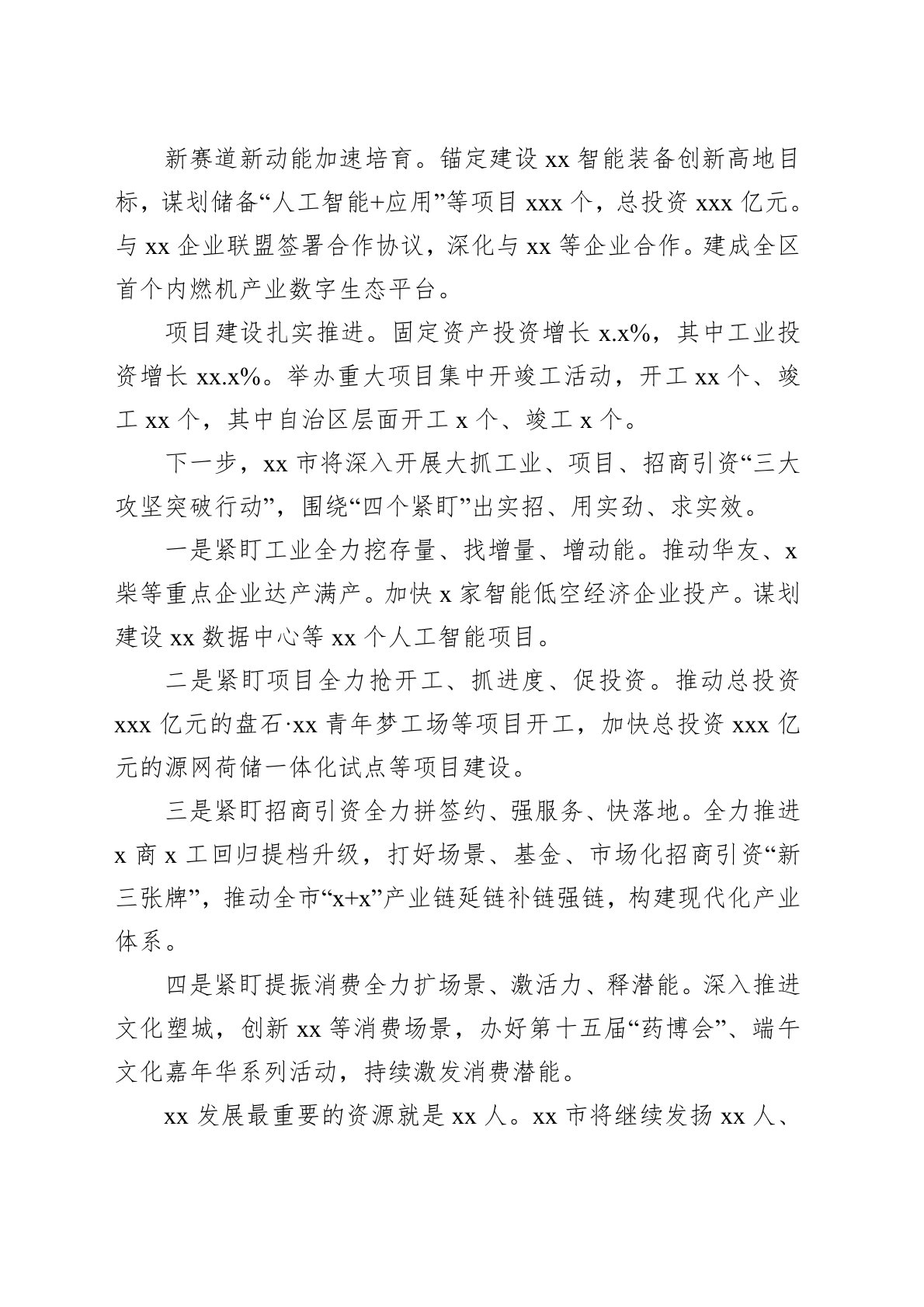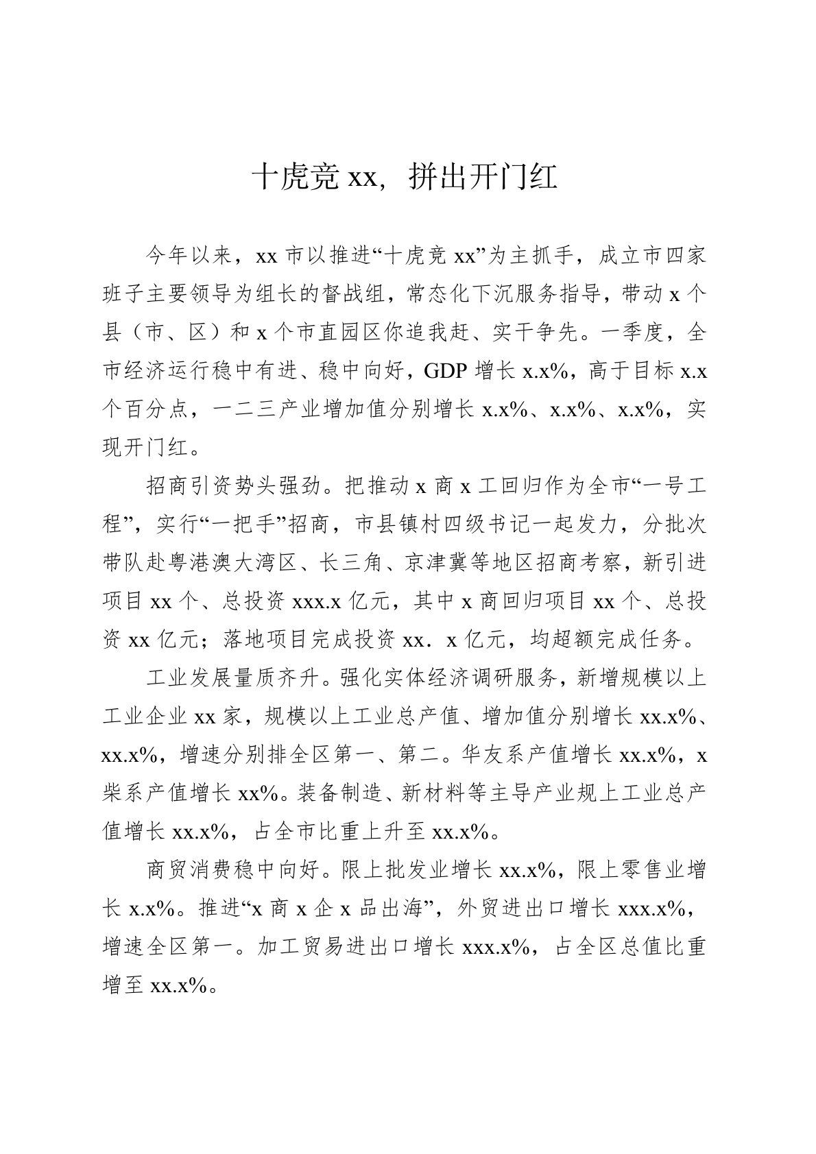 今年以来,xx市以推进“十虎竞xx”为主抓手,成立市四家班子主要领导为组长的督战组,常态化下沉服务指导,带动x个县(市、区)和x个市直园区你追我赶、实干争先。一季度,全市经济运行稳中有进、稳中向好,GDP增长x.x%,高于目标x.x个百分点,一二三产业增加值分别增长x.x%、x.x%、x.x%,实现开门红。招商引资势头强劲。把推动x商x工回归作为全市“一号工程”,实行“一把手”招商,市县镇村四级书记一起发力,分批次带队赴粤港澳大湾区、长三角、京津冀等地区招商考察,新引进项目xx个、总投资习近平.x亿元,其中x商回归项目xx个、总投资xx亿元;落地项目完成投资xx.x亿元,均超额完成任务。工业发...