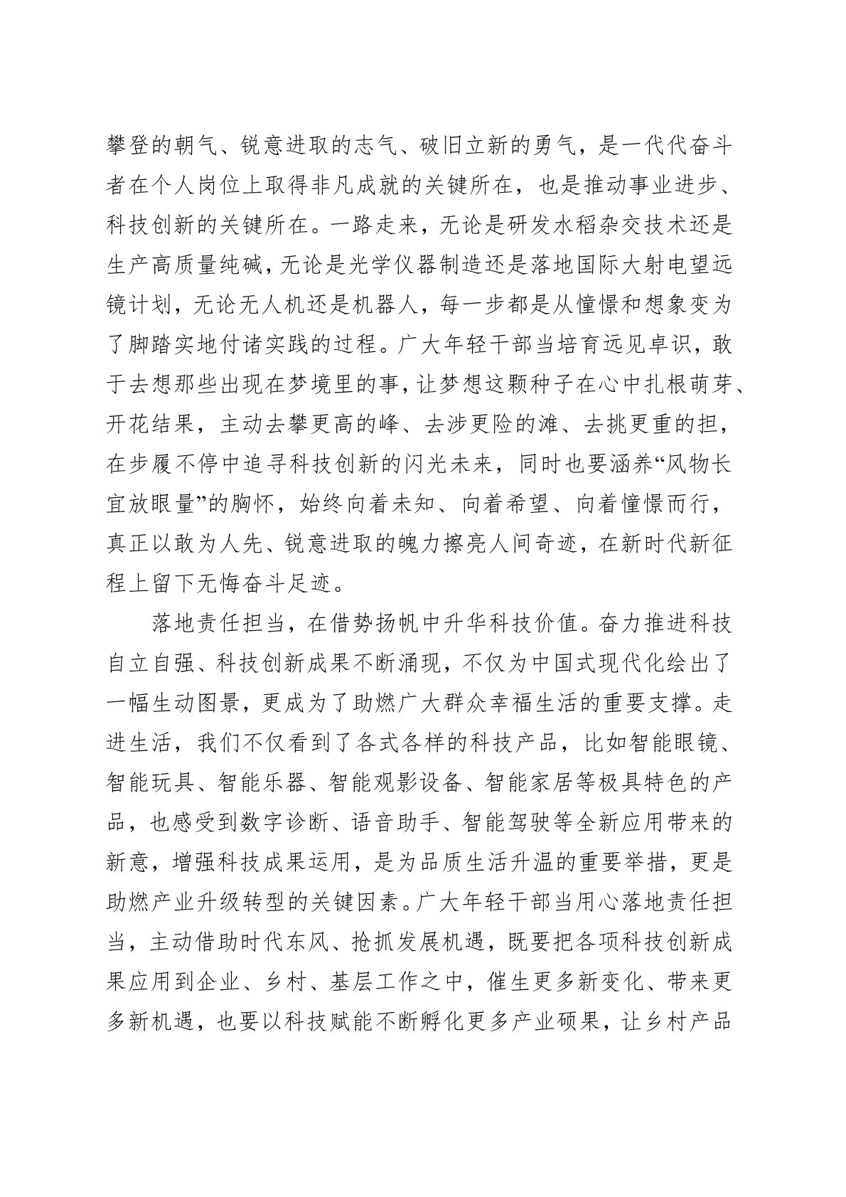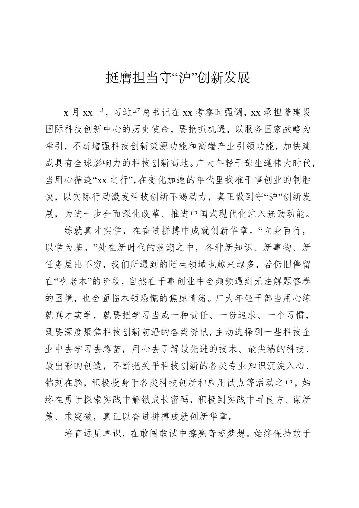 x月xx日,习近平总书记在xx考察时强调,xx承担着建设国际科技创新中心的历史使命,要抢抓机遇,以服务国家战略为牵引,不断增强科技创新策源功能和高端产业引领功能,加快建成具有全球影响力的科技创新高地。广大年轻干部生逢伟大时代,当用心循迹“xx之行”,在变化加速的年代里找准干事创业的制胜诀,以实际行动激发科技创新不竭动力,真正做到守“沪”创新发展,为进一步全面深化改革、推进中国式现代化注入强劲动能。练就真才实学,在奋进拼搏中成就创新华章。“立身百行,以学为基。”处在新时代的浪潮之中,各种新知识、新事物、新任务层出不穷,我们所遇到的陌生领域也越来越多,若仍旧停留在“吃老本”的阶段,自然在干事创业中...