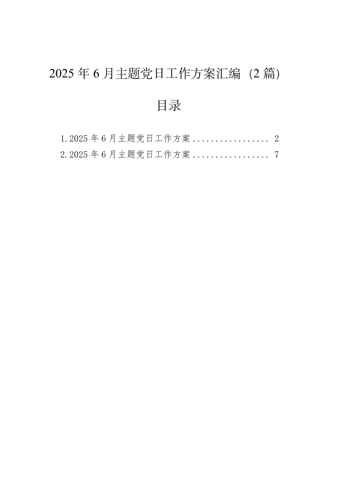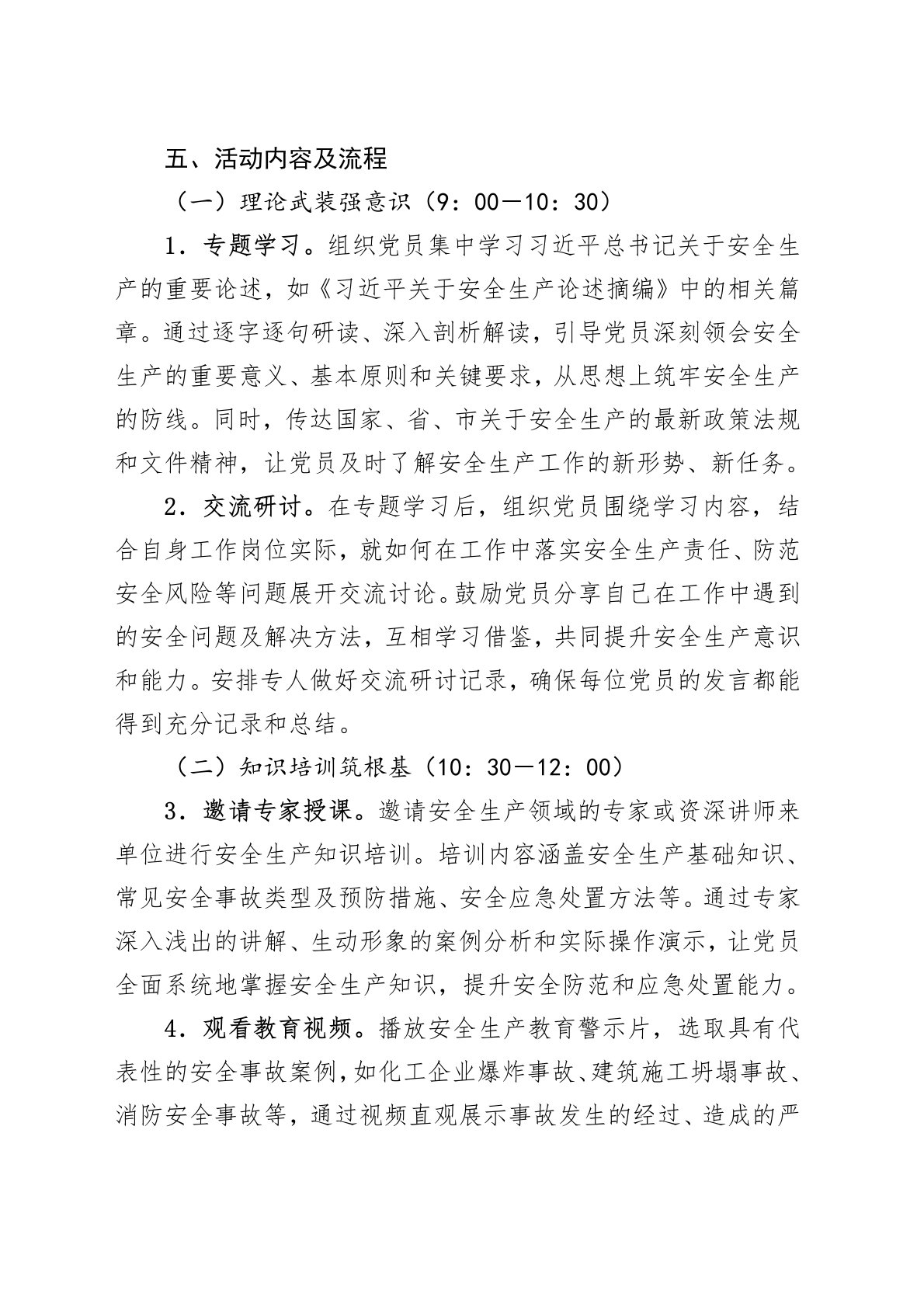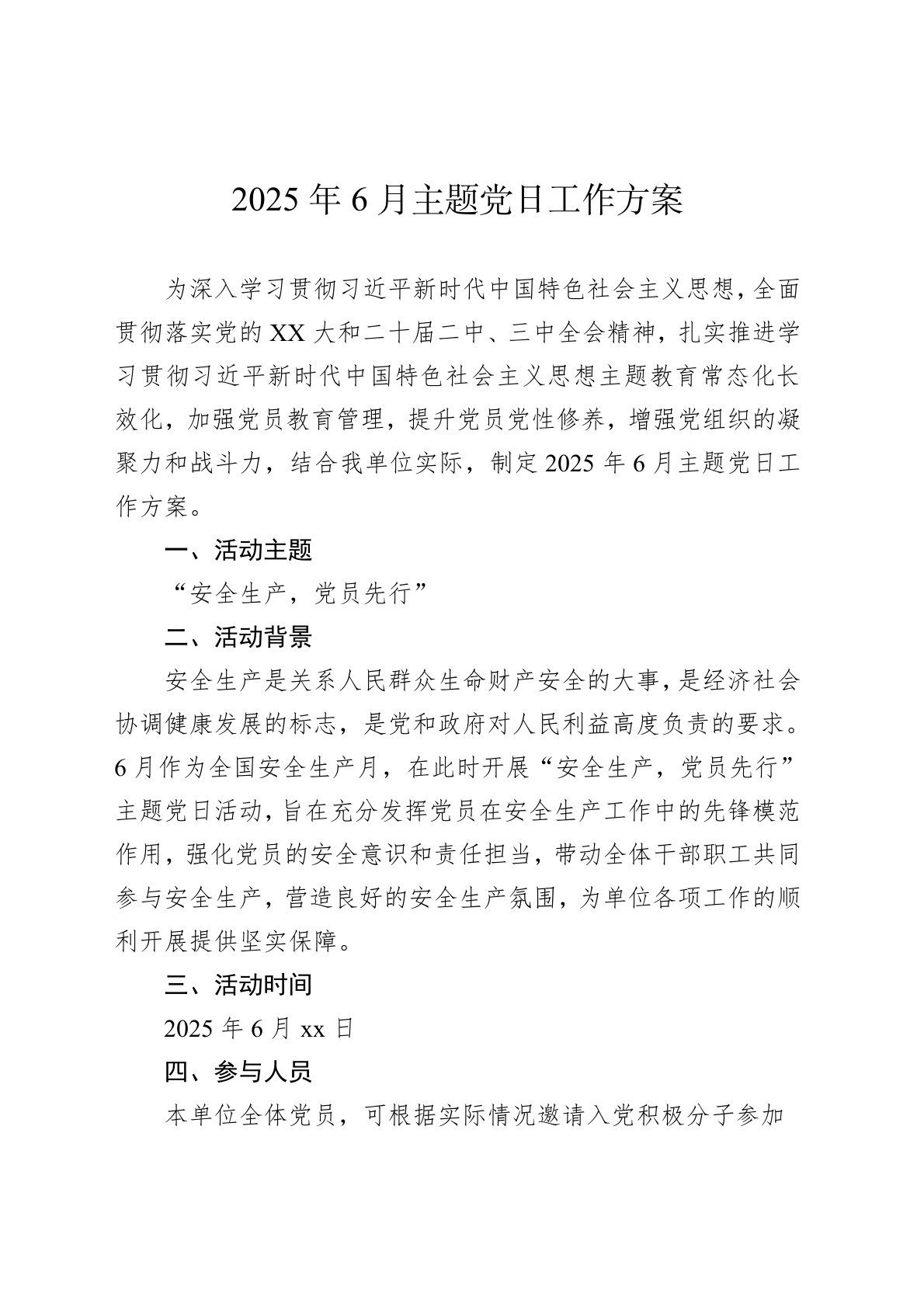 2.2025年6月主题党日工作方案7为深入学习贯彻习近平新时代中国特色社会主义思想,全面贯彻落实党的XX大和二十届二中、三中全会精神,扎实推进学习贯彻习近平新时代中国特色社会主义思想主题教育常态化长效化,加强党员教育管理,提升党员党性修养,增强党组织的凝聚力和战斗力,结合我单位实际,制定2025年6月主题党日工作方案。一、活动主题“安全生产,党员先行”二、活动背景安全生产是关系人民群众生命财产安全的大事,是经济社会协调健康发展的标志,是党和政府对人民利益高度负责的要求。6月作为全国安全生产月,在此时开展“安全生产,党员先行”主题党日活动,旨在充分发挥党员在安全生产工作中的先锋模范作用,强化党员...