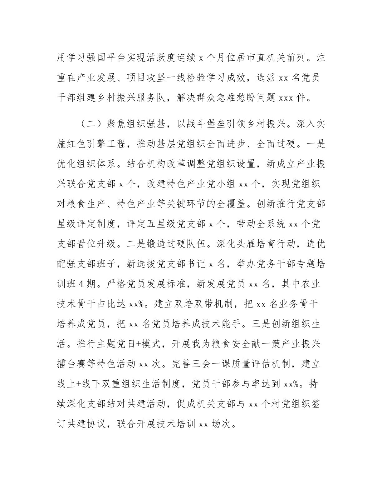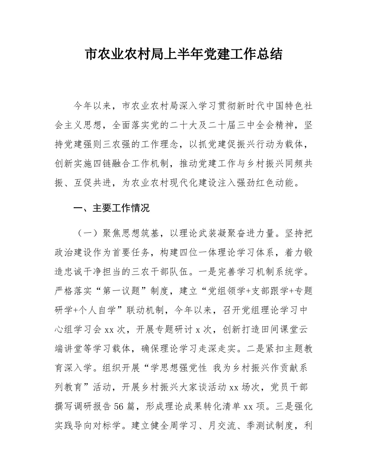 市农业农村局上半年党建工作总结今年以来,市农业农村局深入学习贯彻新时代中国特色社会主义思想,全面落实党的二十大及二十届三中全会精神,坚持党建强则三农强的工作理念,以抓党建促振兴行动为载体,创新实施四链融合工作机制,推动党建工作与乡村振兴同频共振、互促共进,为农业农村现代化建设注入强劲红色动能。一、主要工作情况(一)聚焦思想筑基,以理论武装凝聚奋进力量。坚持把政治建设作为首要任务,构建四位一体理论学习体系,着力锻造忠诚干净担当的三农干部队伍。一是完善学习机制系统学。严格落实“第一议题”制度,建立“党组领学+支部跟学+专题研学+个人自学”联动机制,今年以来,召开党组理论学习中心组学习会xx次,开展...