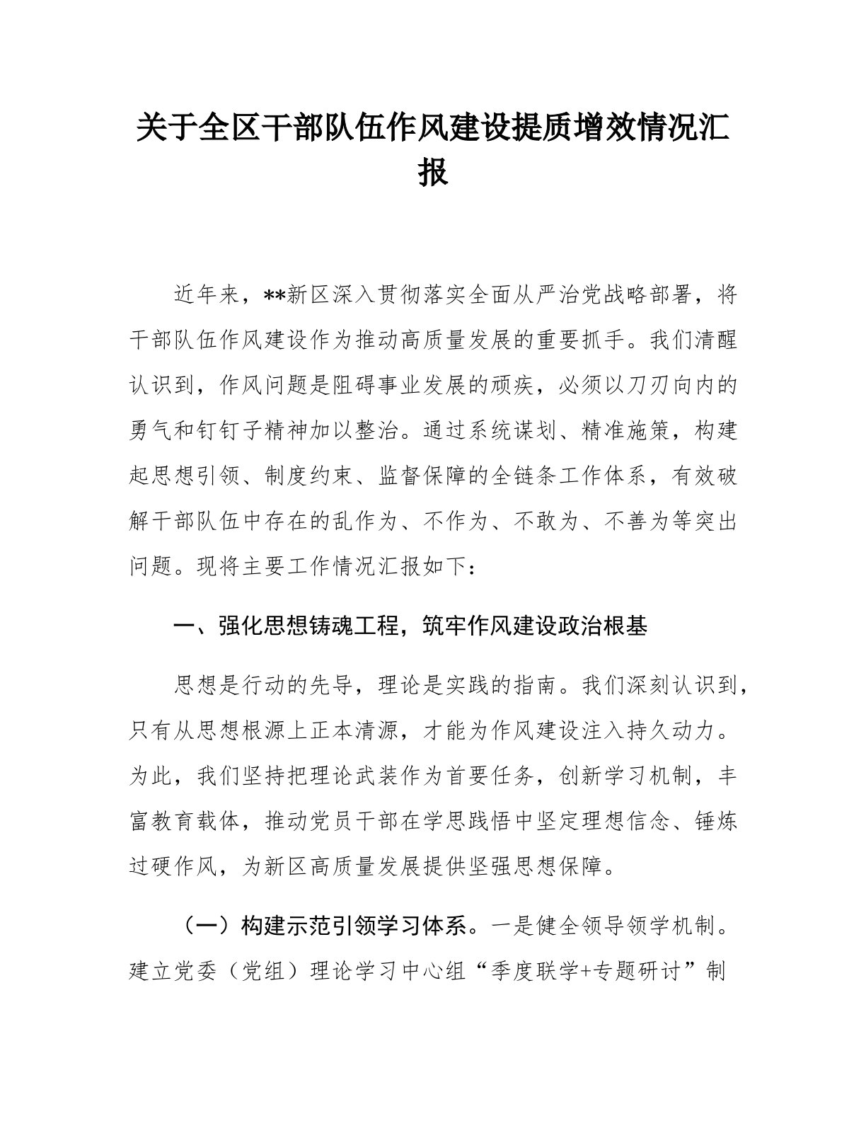 关于全区干部队伍作风建设提质增效情况汇报近年来,**新区深入贯彻落实全面从严治党战略部署,将干部队伍作风建设作为推动高质量发展的重要抓手。我们清醒认识到,作风问题是阻碍事业发展的顽疾,必须以刀刃向内的勇气和钉钉子精神加以整治。通过系统谋划、精准施策,构建起思想引领、制度约束、监督保障的全链条工作体系,有效破解干部队伍中存在的乱作为、不作为、不敢为、不善为等突出问题。现将主要工作情况汇报如下:一、强化思想铸魂工程,筑牢作风建设政治根基思想是行动的先导,理论是实践的指南。我们深刻认识到,只有从思想根源上正本清源,才能为作风建设注入持久动力。为此,我们坚持把理论武装作为首要任务,创新学习机制,丰富教...