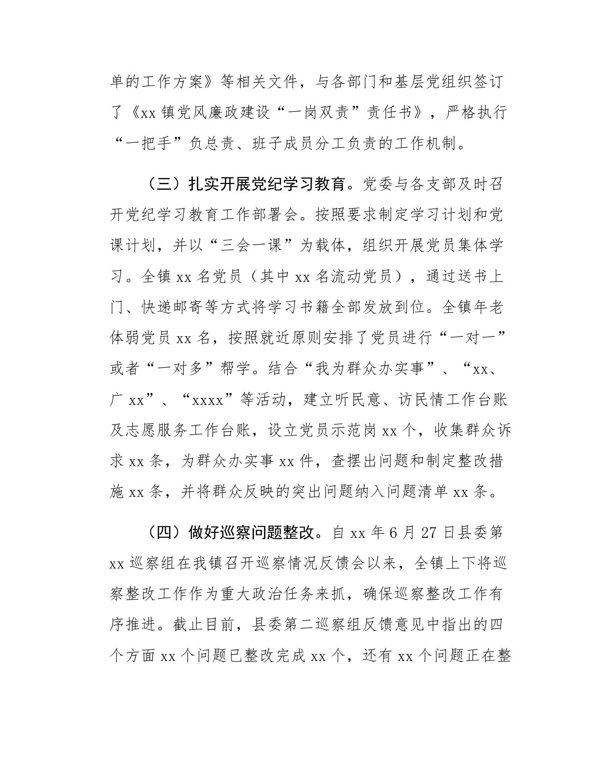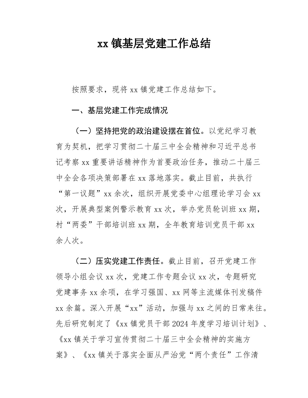 xx镇基层党建工作总结按照要求,现将xx镇党建工作总结如下。一、基层党建工作完成情况(一)坚持把党的政治建设摆在首位。以党纪学习教育为契机,把学习贯彻二十届三中全会精神和习近平总书记考察xx重要讲话精神作为首要政治任务,推动二十届三中全会各项决策部署在xx落地落实。截止目前,共执行“第一议题”xx余次,组织开展党委中心组理论学习会xx次,开展典型案例警示教育xx次,举办党员轮训班xx期,村“两委”干部培训班xx期,全年教育培训党员干部xx余人次。(二)压实党建工作责任。截止目前,召开党建工作领导小组会议xx次,党建工作专题会议xx次,专题研究党建事务xx余项,在学习强国、xx网等主流媒体刊发稿...