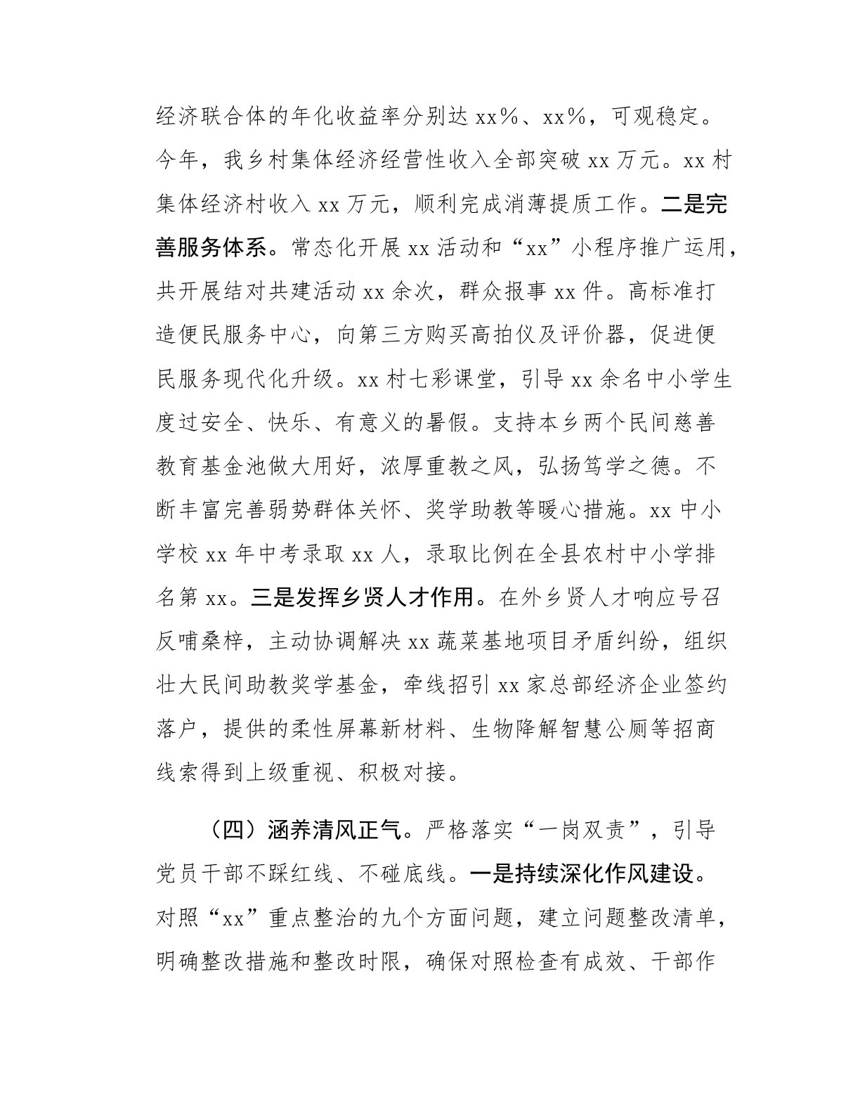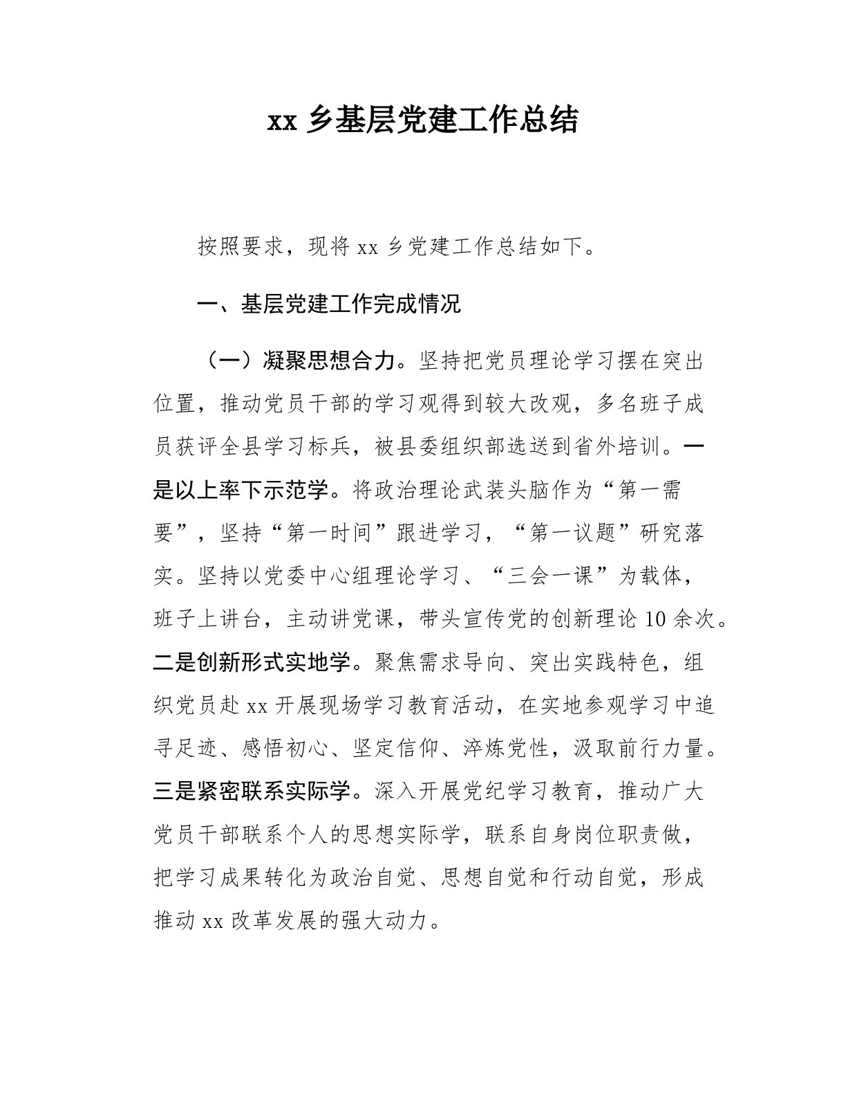 xx乡基层党建工作总结按照要求,现将xx乡党建工作总结如下。一、基层党建工作完成情况(一)凝聚思想合力。坚持把党员理论学习摆在突出位置,推动党员干部的学习观得到较大改观,多名班子成员获评全县学习标兵,被县委组织部选送到省外培训。一是以上率下示范学。将政治理论武装头脑作为“第一需要”,坚持“第一时间”跟进学习,“第一议题”研究落实。坚持以党委中心组理论学习、“三会一课”为载体,班子上讲台,主动讲党课,带头宣传党的创新理论10余次。二是创新形式实地学。聚焦需求导向、突出实践特色,组织党员赴xx开展现场学习教育活动,在实地参观学习中追寻足迹、感悟初心、坚定信仰、淬炼党性,汲取前行力量。三是紧密联系实...