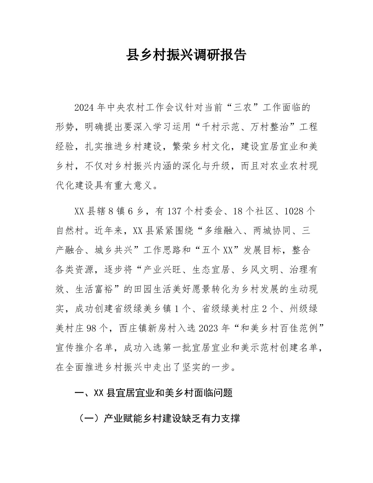 县乡村振兴调研报告2024年中央农村工作会议针对当前“三农”工作面临的形势,明确提出要深入学习运用“千村示范、万村整治”工程经验,扎实推进乡村建设,繁荣乡村文化,建设宜居宜业和美乡村,不仅对乡村振兴内涵的深化与升级,而且对农业农村现代化建设具有重大意义。XX县辖8镇6乡,有137个村委会、18个社区、1028个自然村。近年来,XX县紧紧围绕“多维融入、两城协同、三产融合、城乡共兴”工作思路和“五个XX”发展目标,整合各类资源,逐步将“产业兴旺、生态宜居、乡风文明、治理有效、生活富裕”的田园生活美好愿景转化为乡村发展的生动现实,成功创建省级绿美乡镇1个、省级绿美村庄2个、州级绿美村庄98个,西庄...