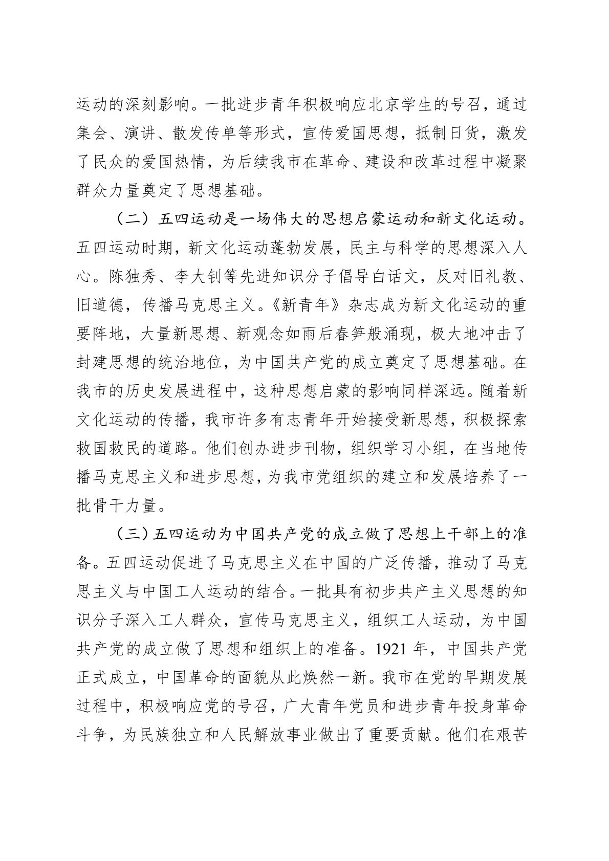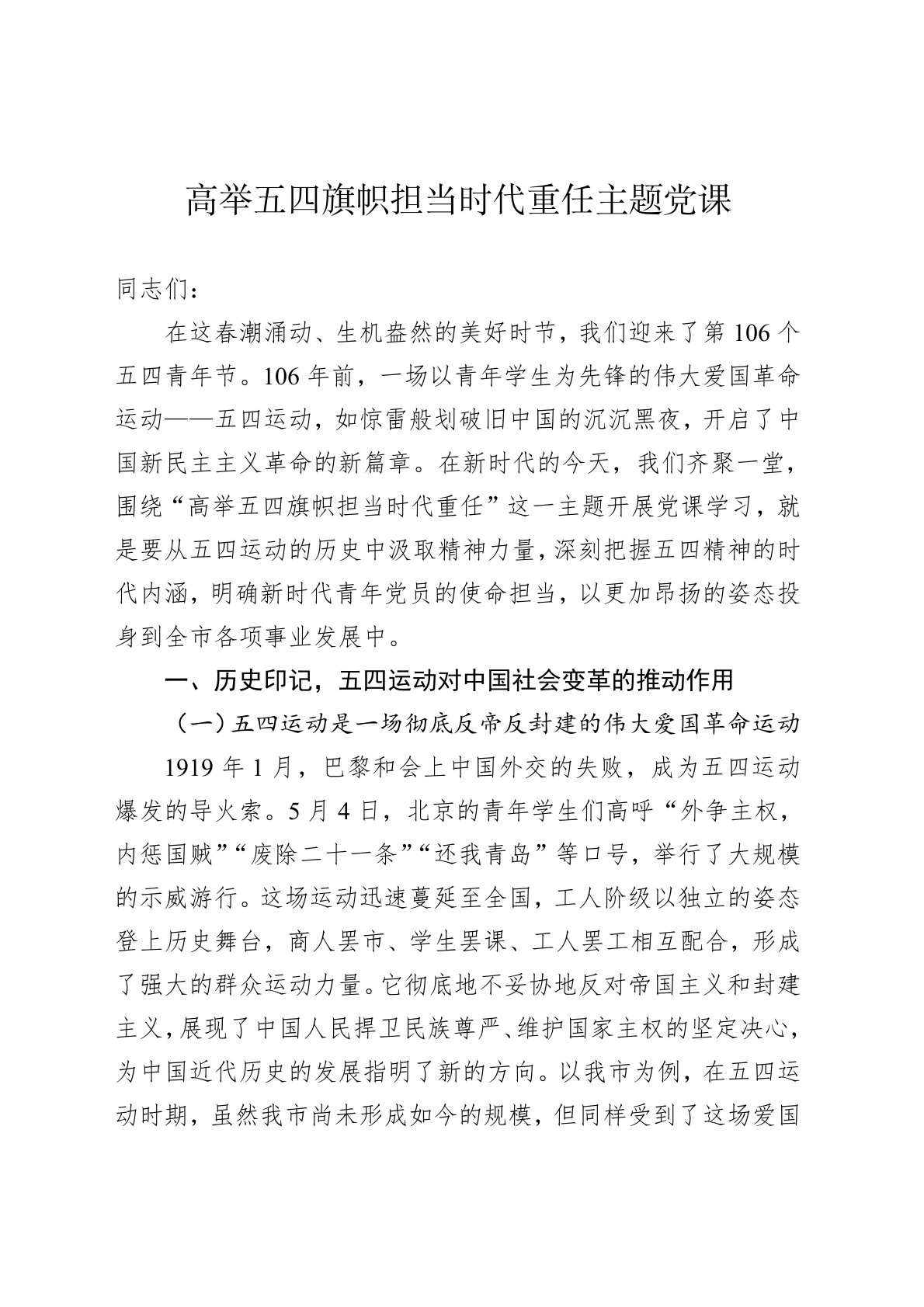 同志们:在这春潮涌动、生机盎然的美好时节,我们迎来了第106个五四青年节。106年前,一场以青年学生为先锋的伟大爱国革命运动——五四运动,如惊雷般划破旧中国的沉沉黑夜,开启了中国新民主主义革命的新篇章。在新时代的今天,我们齐聚一堂,围绕“高举五四旗帜担当时代重任”这一主题开展党课学习,就是要从五四运动的历史中汲取精神力量,深刻把握五四精神的时代内涵,明确新时代青年党员的使命担当,以更加昂扬的姿态投身到全市各项事业发展中。一、历史印记,五四运动对中国社会变革的推动作用(一)五四运动是一场彻底反帝反封建的伟大爱国革命运动1919年1月,巴黎和会上中国外交的失败,成为五四运动爆发的导火索。5月4日,...