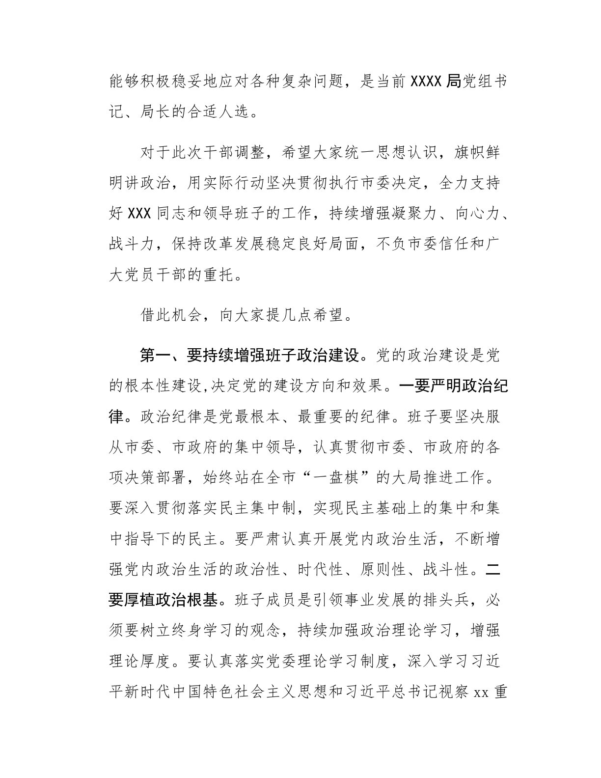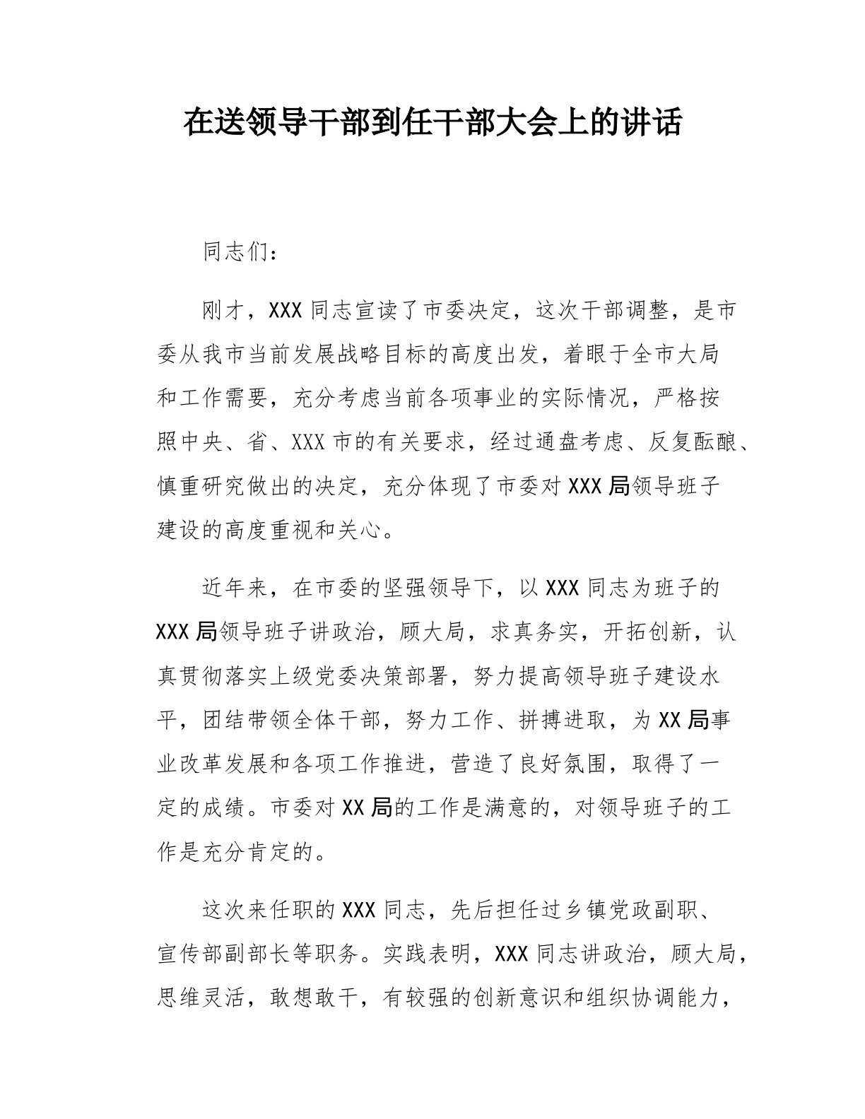 在送领导干部到任干部大会上的讲话同志们:刚才,习近平同志宣读了市委决定,这次干部调整,是市委从我市当前发展战略目标的高度出发,着眼于全市大局和工作需要,充分考虑当前各项事业的实际情况,严格按照中央、省、习近平市的有关要求,经过通盘考虑、反复酝酿、慎重研究做出的决定,充分体现了市委对习近平局领导班子建设的高度重视和关心。近年来,在市委的坚强领导下,以习近平同志为班子的习近平局领导班子讲政治,顾大局,求真务实,开拓创新,认真贯彻落实上级党委决策部署,努力提高领导班子建设水平,团结带领全体干部,努力工作、拼搏进取,为XX局事业改革发展和各项工作推进,营造了良好氛围,取得了一定的成绩。市委对XX局的工...