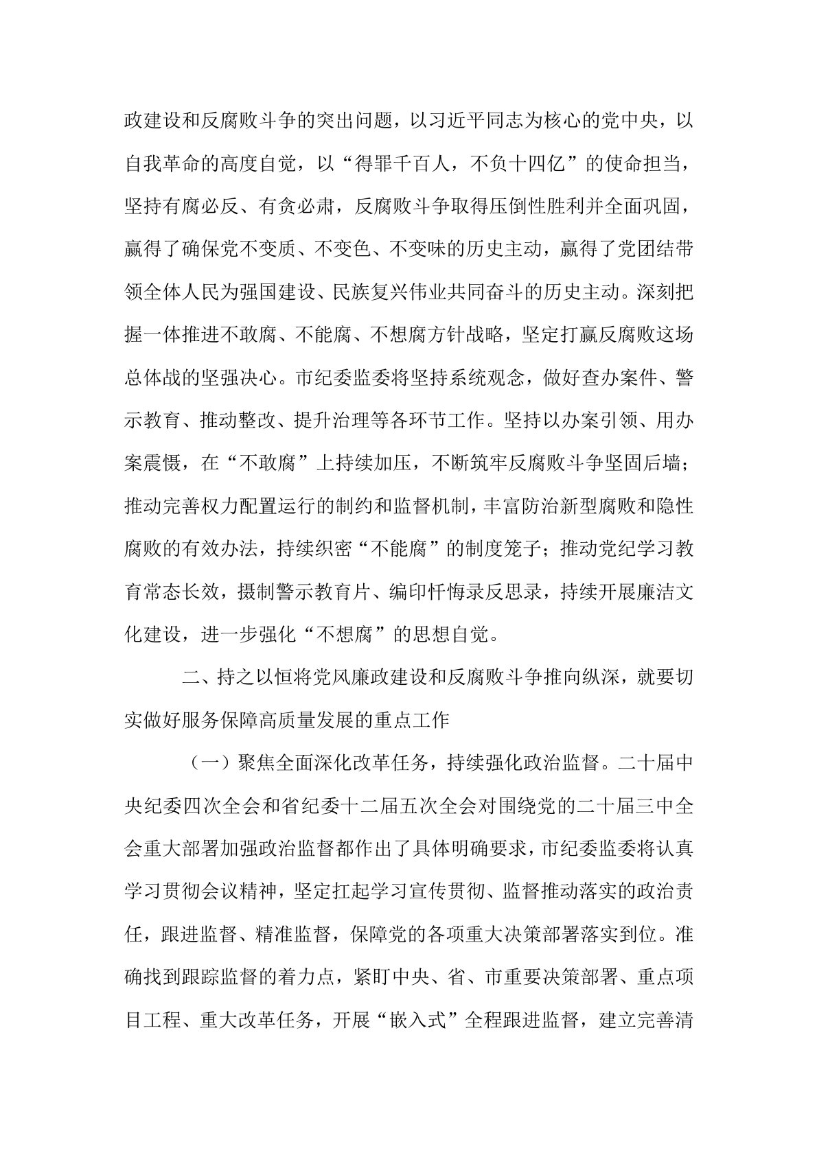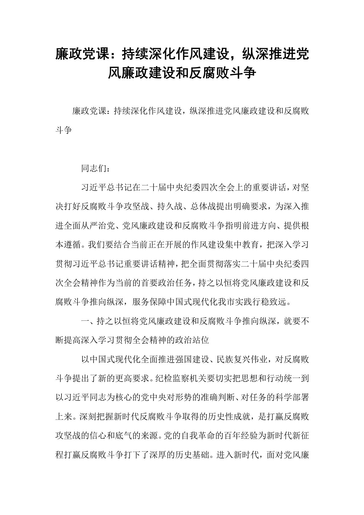 廉政党课:持续深化作风建设,纵深推进党风廉政建设和反腐败斗争廉政党课:持续深化作风建设,纵深推进党风廉政建设和反腐败斗争同志们:习近平总书记在二十届中央纪委四次全会上的重要讲话,对坚决打好反腐败斗争攻坚战、持久战、总体战提出明确要求,为深入推进全面从严治党、党风廉政建设和反腐败斗争指明前进方向、提供根本遵循。我们要结合当前正在开展的作风建设集中教育,把深入学习贯彻习近平总书记重要讲话精神,把全面贯彻落实二十届中央纪委四次全会精神作为当前的首要政治任务,持之以恒将党风廉政建设和反腐败斗争推向纵深,服务保障中国式现代化我市实践行稳致远。一、持之以恒将党风廉政建设和反腐败斗争推向纵深,就要不断提高深...