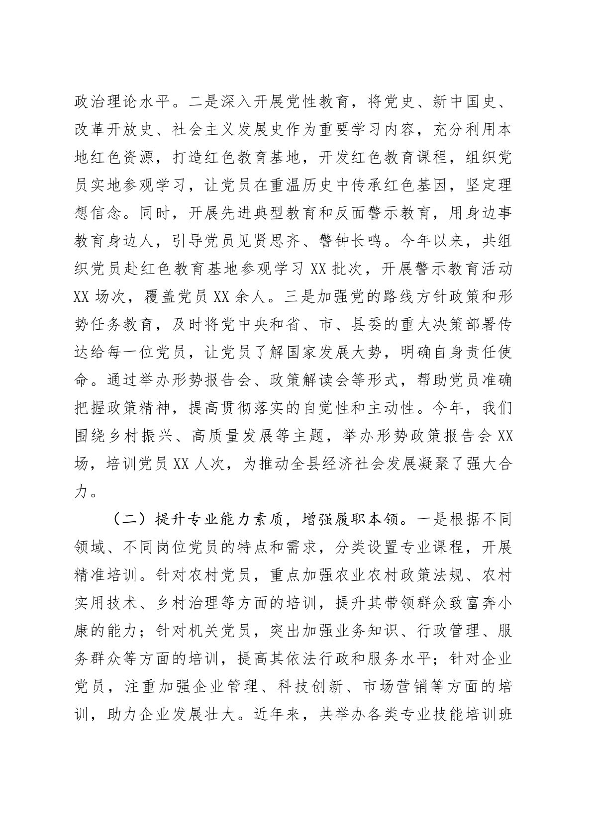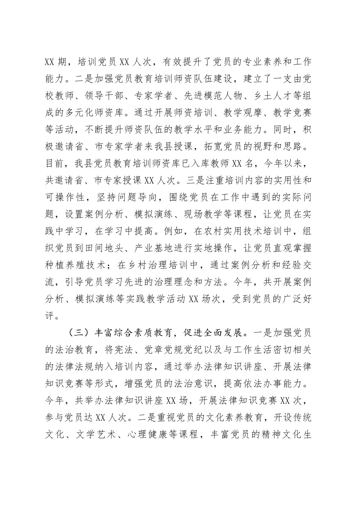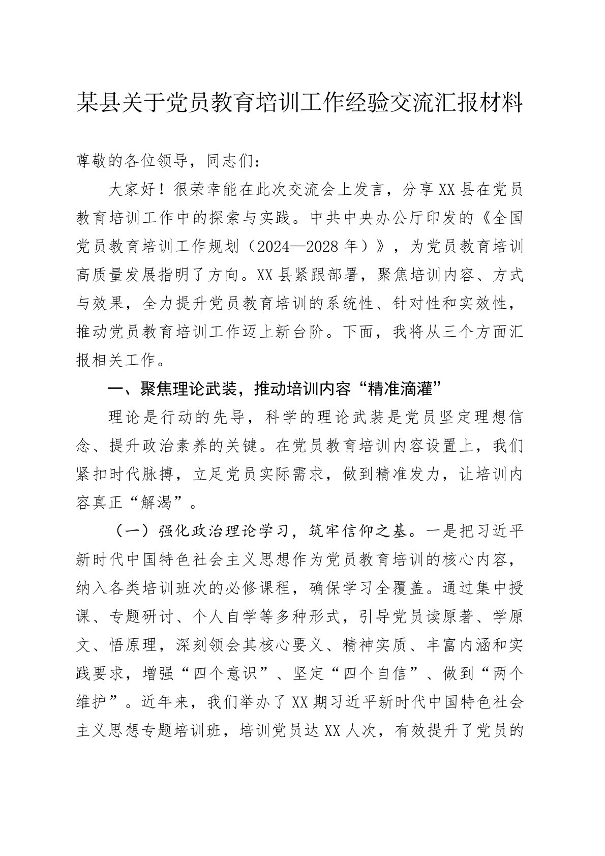 某县关于党员教育培训工作经验交流汇报材料尊敬的各位领导,同志们:大家好!很荣幸能在此次交流会上发言,分享XX县在党员教育培训工作中的探索与实践。中共中央办公厅印发的《全国党员教育培训工作规划(2024—2028年)》,为党员教育培训高质量发展指明了方向。XX县紧跟部署,聚焦培训内容、方式与效果,全力提升党员教育培训的系统性、针对性和实效性,推动党员教育培训工作迈上新台阶。下面,我将从三个方面汇报相关工作。一、聚焦理论武装,推动培训内容“精准滴灌”理论是行动的先导,科学的理论武装是党员坚定理想信念、提升政治素养的关键。在党员教育培训内容设置上,我们紧扣时代脉搏,立足党员实际需求,做到精准发力,让...