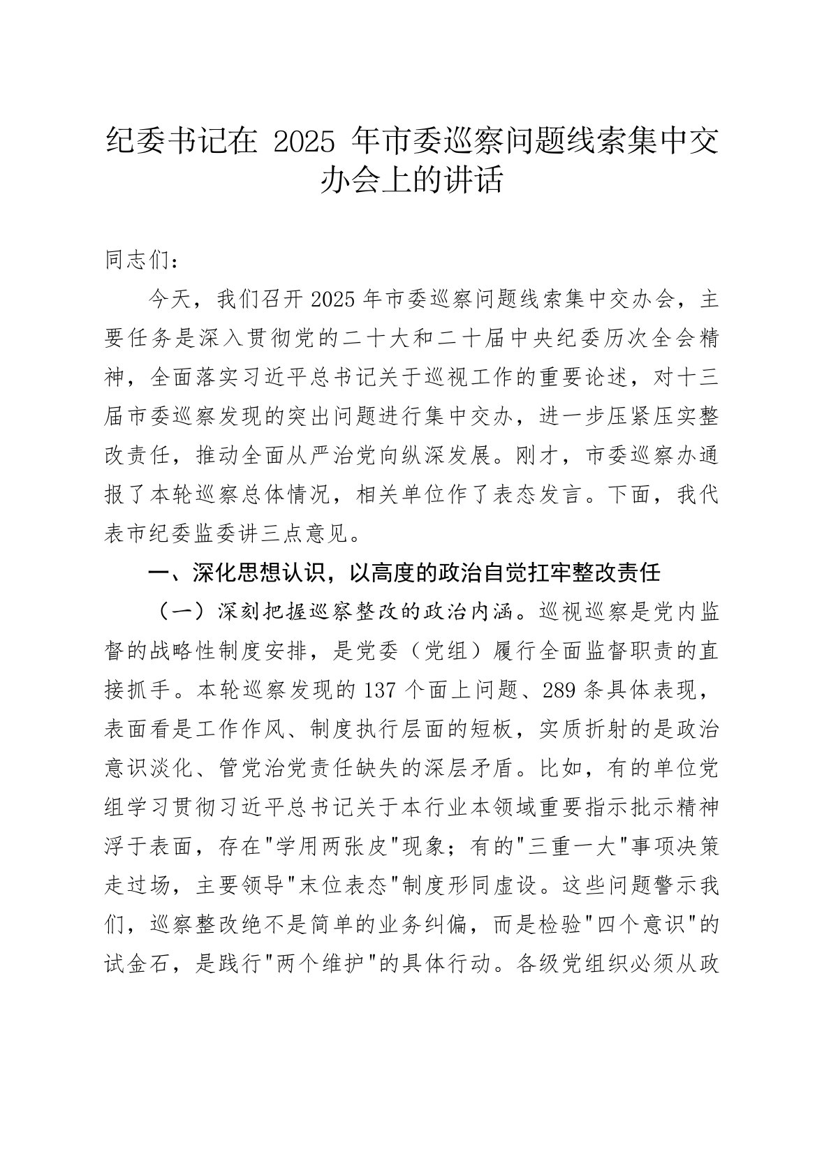 纪委书记在2025年市委巡察问题线索集中交办会上的讲话同志们:今天,我们召开2025年市委巡察问题线索集中交办会,主要任务是深入贯彻党的二十大和二十届中央纪委历次全会精神,全面落实习近平总书记关于巡视工作的重要论述,对十三届市委巡察发现的突出问题进行集中交办,进一步压紧压实整改责任,推动全面从严治党向纵深发展。刚才,市委巡察办通报了本轮巡察总体情况,相关单位作了表态发言。下面,我代表市纪委监委讲三点意见。一、深化思想认识,以高度的政治自觉扛牢整改责任(一)深刻把握巡察整改的政治内涵。巡视巡察是党内监督的战略性制度安排,是党委(党组)履行全面监督职责的直接抓手。本轮巡察发现的137个面上问题、2...