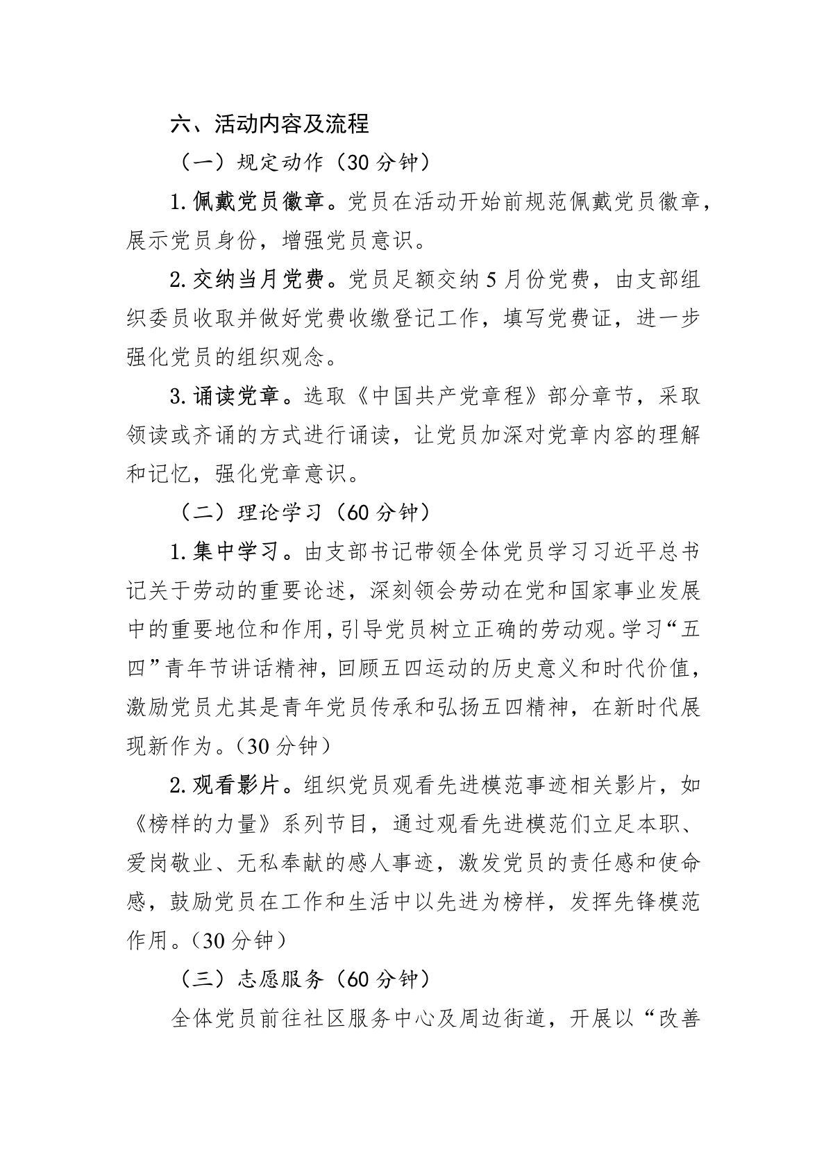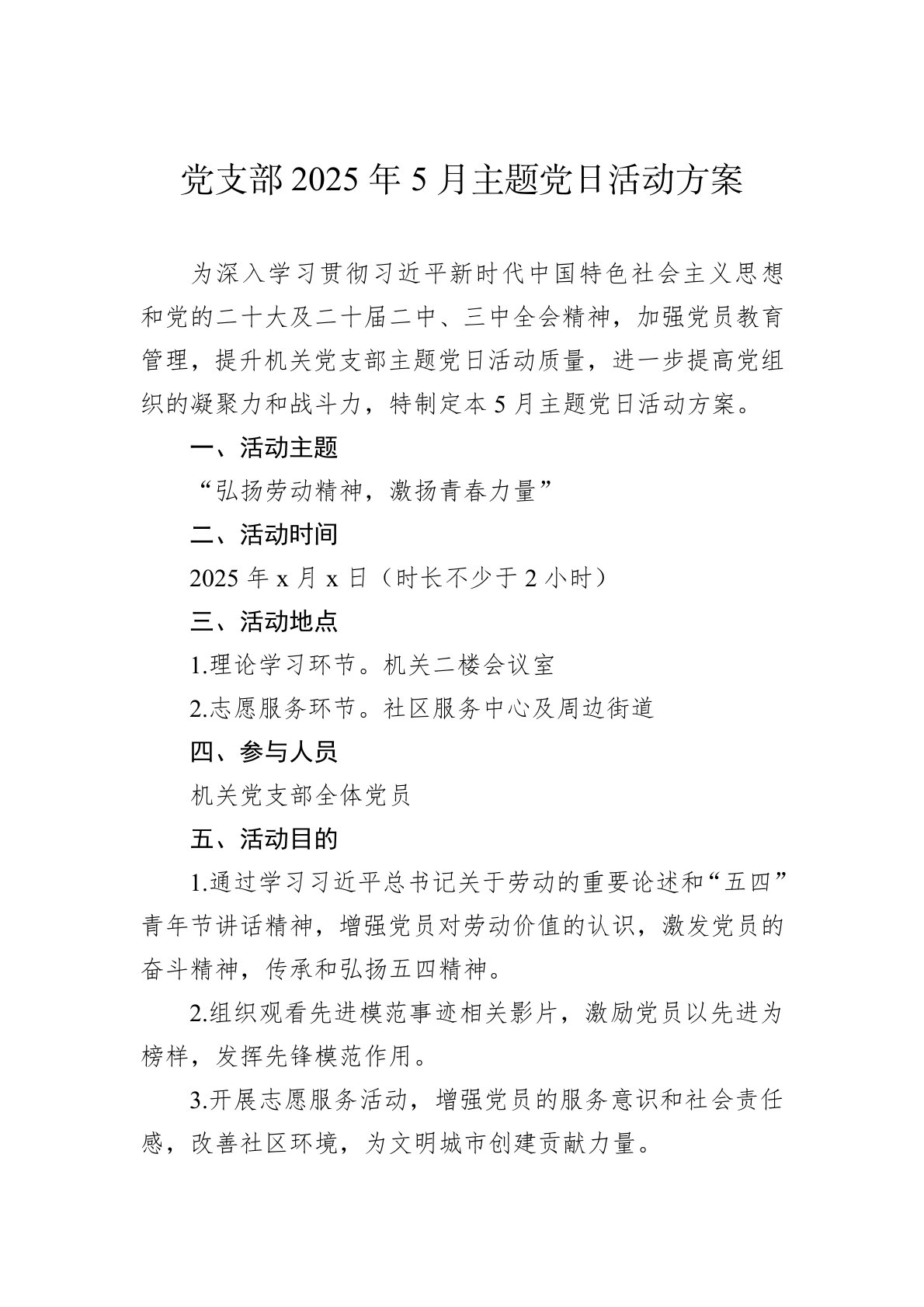 为深入学习贯彻习近平新时代中国特色社会主义思想和党的二十大及二十届二中、三中全会精神,加强党员教育管理,提升机关党支部主题党日活动质量,进一步提高党组织的凝聚力和战斗力,特制定本5月主题党日活动方案。一、活动主题“弘扬劳动精神,激扬青春力量”二、活动时间2025年x月x日(时长不少于2小时)三、活动地点1.理论学习环节。机关二楼会议室2.志愿服务环节。社区服务中心及周边街道四、参与人员机关党支部全体党员五、活动目的1.通过学习习近平总书记关于劳动的重要论述和“五四”青年节讲话精神,增强党员对劳动价值的认识,激发党员的奋斗精神,传承和弘扬五四精神。2.组织观看先进模范事迹相关影片,激励党员以先进...