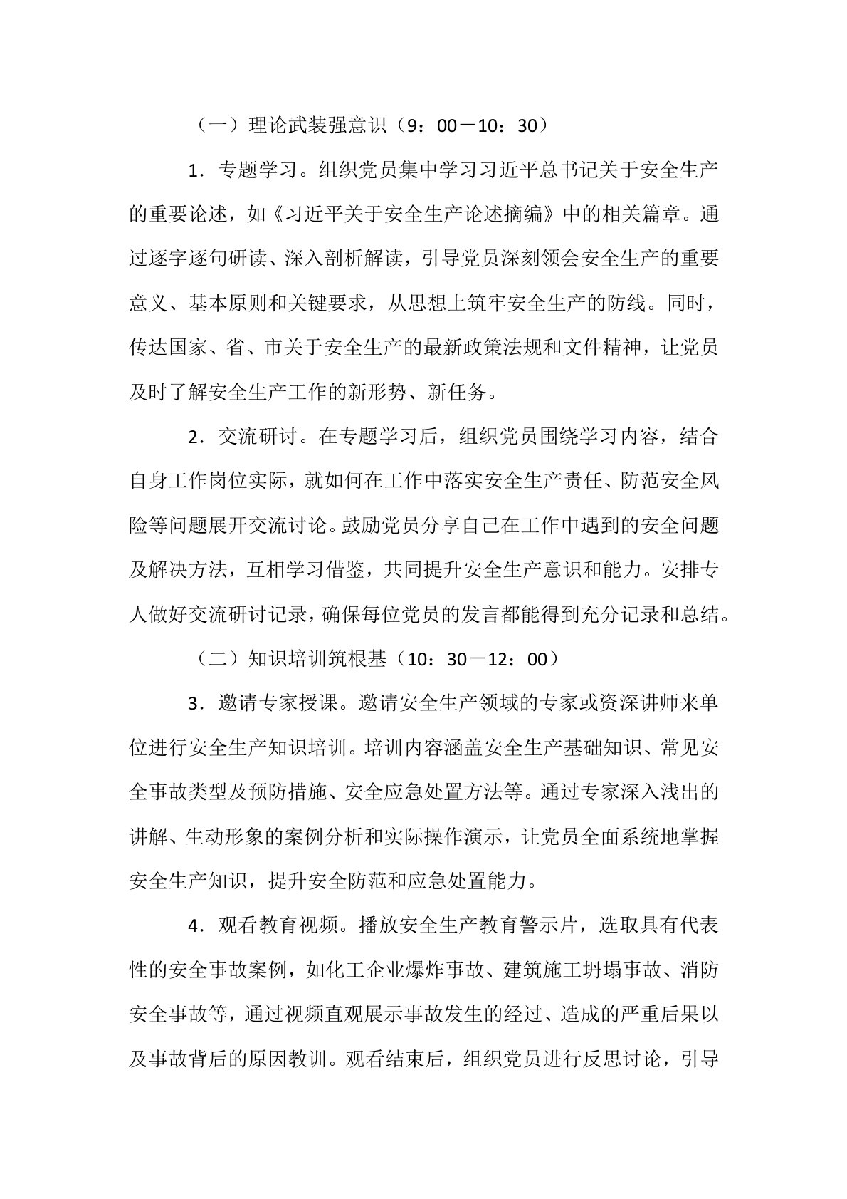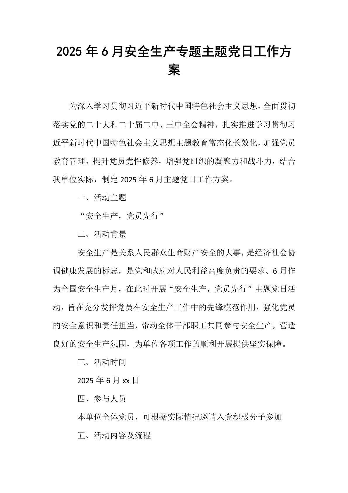 2025年6月安全生产专题主题党日工作方案为深入学习贯彻习近平新时代中国特色社会主义思想,全面贯彻落实党的二十大和二十届二中、三中全会精神,扎实推进学习贯彻习近平新时代中国特色社会主义思想主题教育常态化长效化,加强党员教育管理,提升党员党性修养,增强党组织的凝聚力和战斗力,结合我单位实际,制定2025年6月主题党日工作方案。一、活动主题“安全生产,党员先行”二、活动背景安全生产是关系人民群众生命财产安全的大事,是经济社会协调健康发展的标志,是党和政府对人民利益高度负责的要求。6月作为全国安全生产月,在此时开展“安全生产,党员先行”主题党日活动,旨在充分发挥党员在安全生产工作中的先锋模范作用,强...