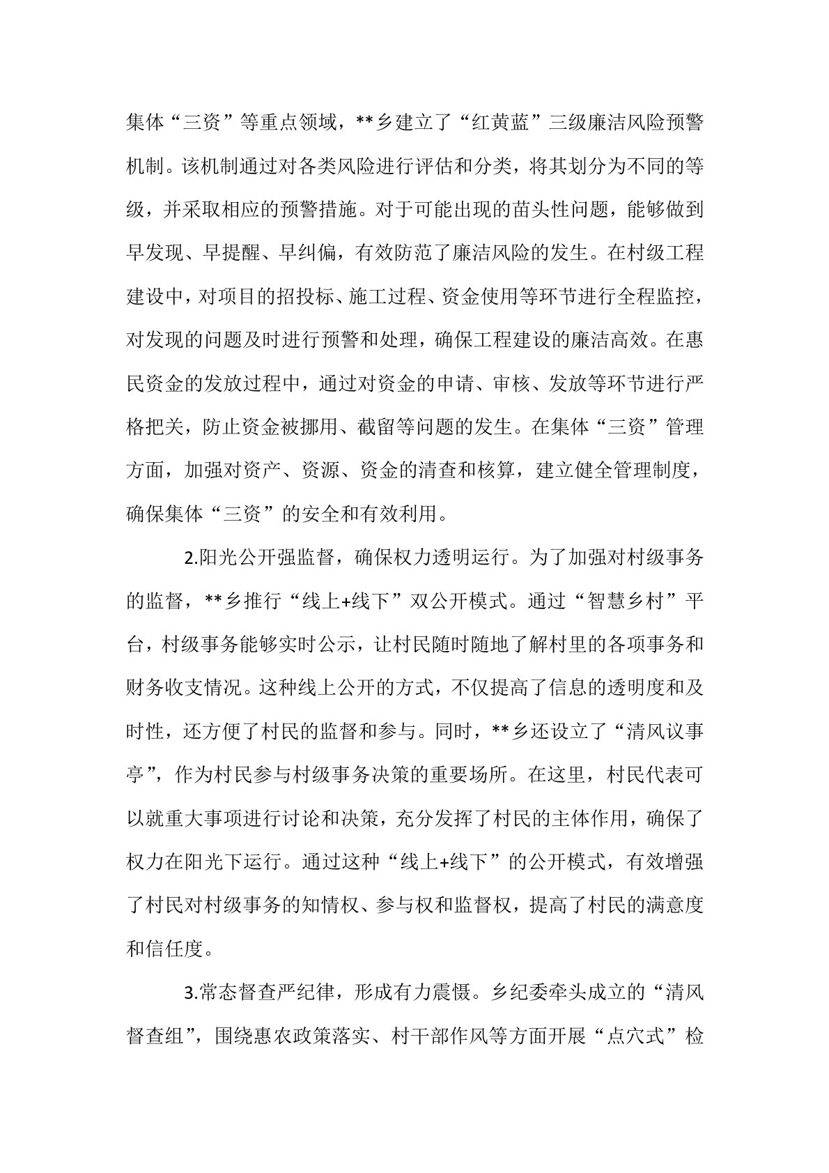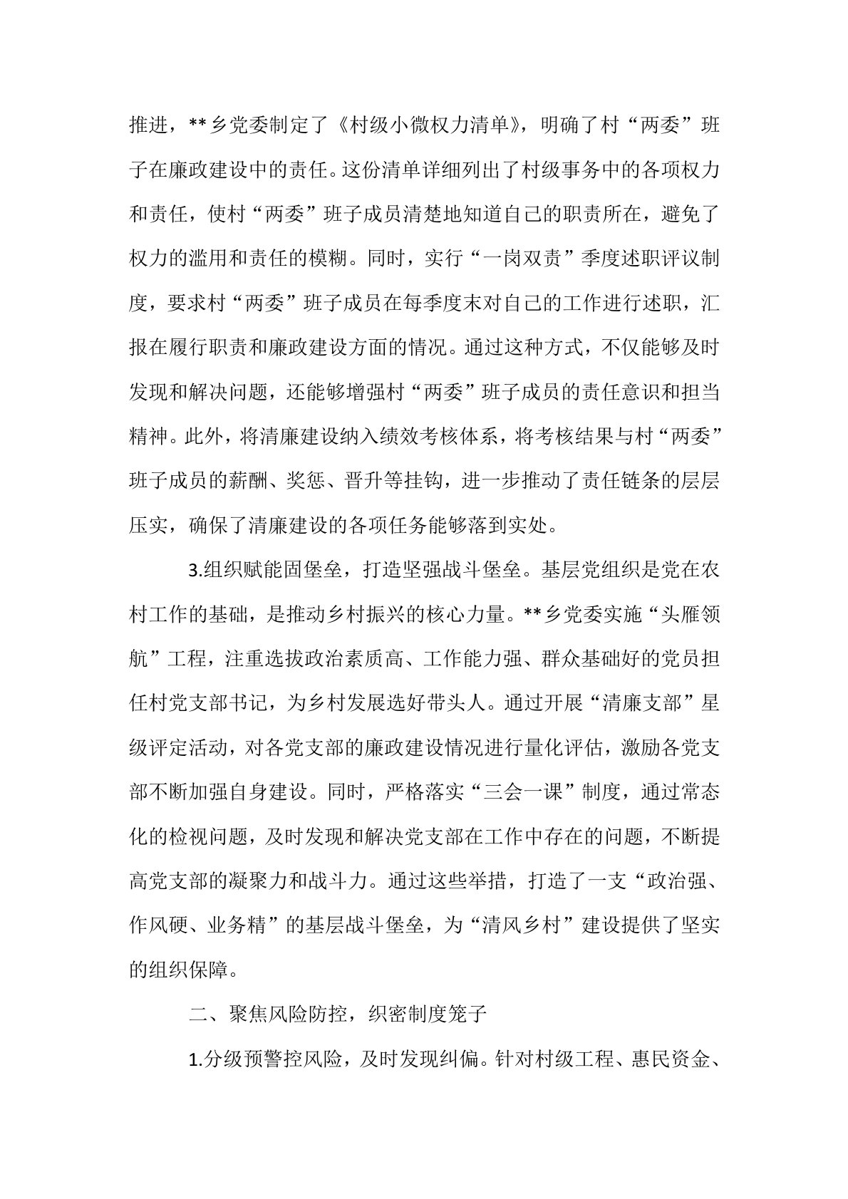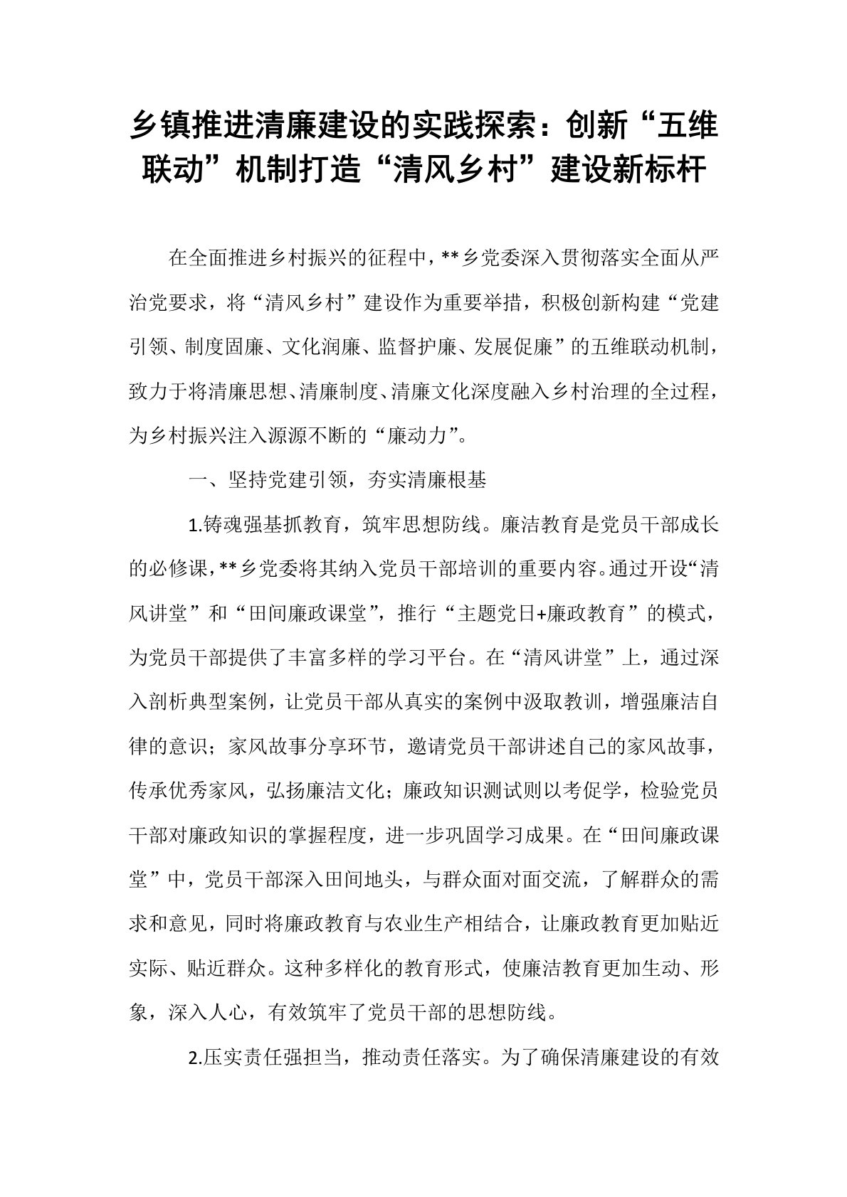 乡镇推进清廉建设的实践探索:创新“五维联动”机制打造“清风乡村”建设新标杆在全面推进乡村振兴的征程中,**乡党委深入贯彻落实全面从严治党要求,将“清风乡村”建设作为重要举措,积极创新构建“党建引领、制度固廉、文化润廉、监督护廉、发展促廉”的五维联动机制,致力于将清廉思想、清廉制度、清廉文化深度融入乡村治理的全过程,为乡村振兴注入源源不断的“廉动力”。一、坚持党建引领,夯实清廉根基1.铸魂强基抓教育,筑牢思想防线。廉洁教育是党员干部成长的必修课,**乡党委将其纳入党员干部培训的重要内容。通过开设“清风讲堂”和“田间廉政课堂”,推行“主题党日+廉政教育”的模式,为党员干部提供了丰富多样的学习平台。...