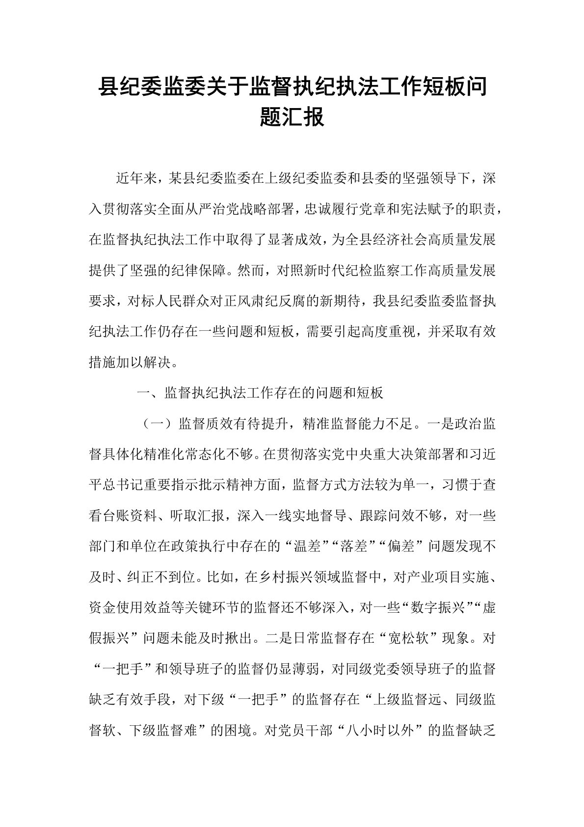 县纪委监委关于监督执纪执法工作短板问题汇报近年来,某县纪委监委在上级纪委监委和县委的坚强领导下,深入贯彻落实全面从严治党战略部署,忠诚履行党章和宪法赋予的职责,在监督执纪执法工作中取得了显著成效,为全县经济社会高质量发展提供了坚强的纪律保障。然而,对照新时代纪检监察工作高质量发展要求,对标人民群众对正风肃纪反腐的新期待,我县纪委监委监督执纪执法工作仍存在一些问题和短板,需要引起高度重视,并采取有效措施加以解决。一、监督执纪执法工作存在的问题和短板(一)监督质效有待提升,精准监督能力不足。一是政治监督具体化精准化常态化不够。在贯彻落实党中央重大决策部署和习近平总书记重要指示批示精神方面,监督方式...