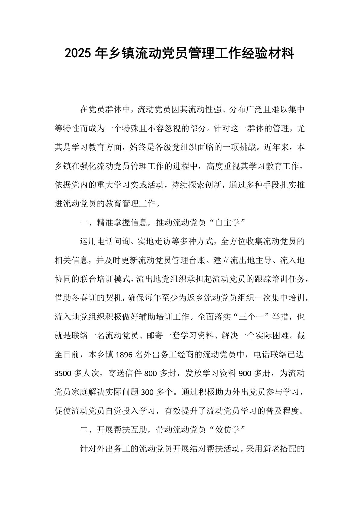 2025年乡镇流动党员管理工作经验材料在党员群体中,流动党员因其流动性强、分布广泛且难以集中等特性而成为一个特殊且不容忽视的部分。针对这一群体的管理,尤其是学习教育方面,始终是各级党组织面临的一项挑战。近年来,本乡镇在强化流动党员管理工作的进程中,高度重视其学习教育工作,依据党内的重大学习实践活动,持续探索创新,通过多种手段扎实推进流动党员的教育管理工作。一、精准掌握信息,推动流动党员“自主学”运用电话问询、实地走访等多种方式,全方位收集流动党员的相关信息,并及时更新流动党员管理台账。建立流出地主导、流入地协同的联合培训模式,流出地党组织承担起流动党员的跟踪培训任务,借助冬春训的契机,确保每年...