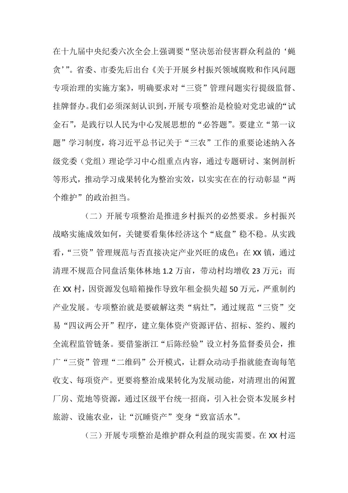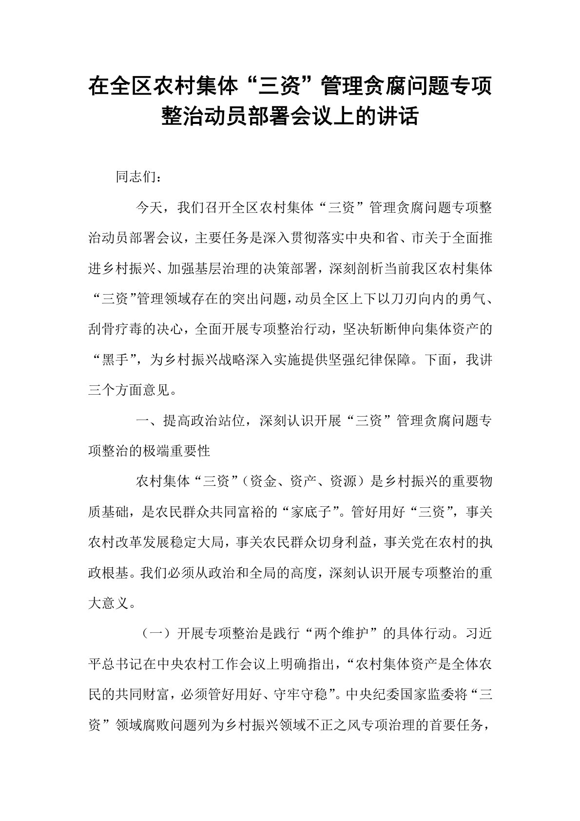 在全区农村集体“三资”管理贪腐问题专项整治动员部署会议上的讲话同志们:今天,我们召开全区农村集体“三资”管理贪腐问题专项整治动员部署会议,主要任务是深入贯彻落实中央和省、市关于全面推进乡村振兴、加强基层治理的决策部署,深刻剖析当前我区农村集体“三资”管理领域存在的突出问题,动员全区上下以刀刃向内的勇气、刮骨疗毒的决心,全面开展专项整治行动,坚决斩断伸向集体资产的“黑手”,为乡村振兴战略深入实施提供坚强纪律保障。下面,我讲三个方面意见。一、提高政治站位,深刻认识开展“三资”管理贪腐问题专项整治的极端重要性农村集体“三资”(资金、资产、资源)是乡村振兴的重要物质基础,是农民群众共同富裕的“家底子”...