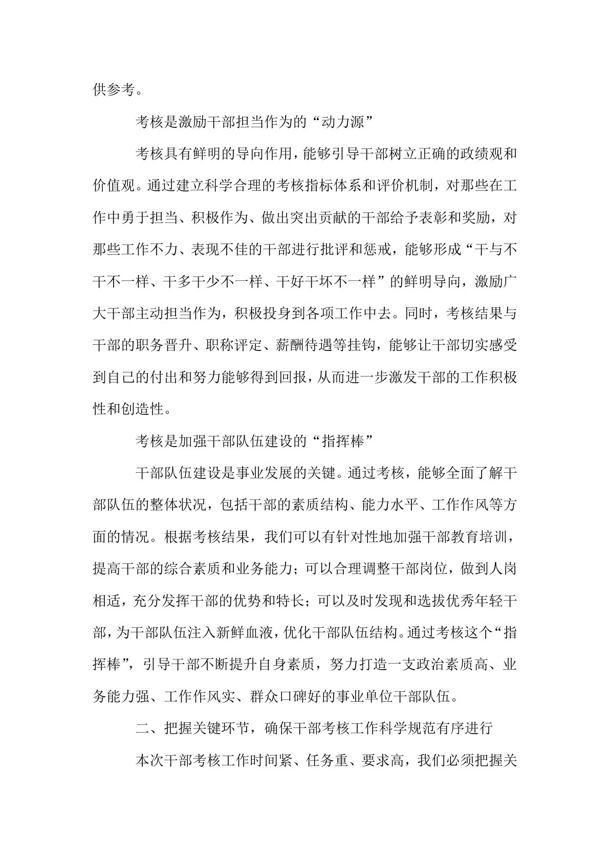 在某区事业单位干部考核工作部署会上的发言同志们:今天,我们召开全区事业单位干部考核工作部署会,主要目的是深入贯彻落实上级关于干部考核工作的相关要求,全面安排部署我区本年度事业单位干部考核工作,进一步规范考核程序,提高考核质量,充分发挥考核的导向作用,激励广大事业单位干部积极担当作为、干事创业。下面,我就做好本次干部考核工作讲几点意见。一、提高思想认识,深刻领会干部考核工作的重要意义干部考核是干部管理的基础性工作,是激励干部担当作为、促进事业发展的重要抓手。对于我们区的事业单位来说,做好干部考核工作具有极其重要的现实意义。考核是检验干部工作成效的“试金石”事业单位承担着公共服务、社会管理等重要职...
