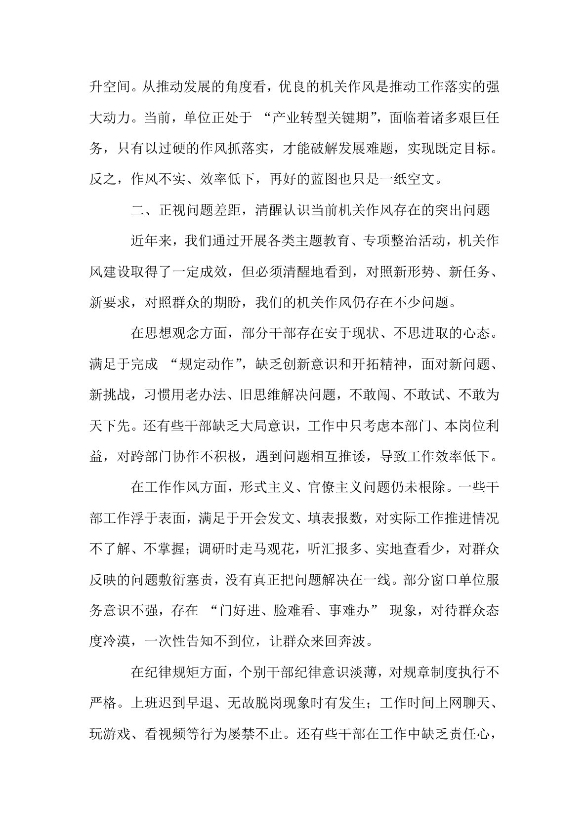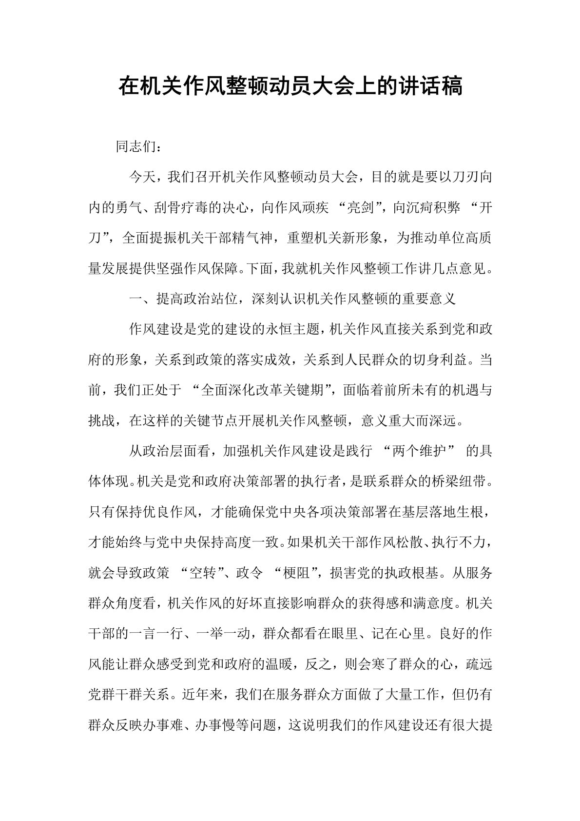 在机关作风整顿动员大会上的讲话稿同志们:今天,我们召开机关作风整顿动员大会,目的就是要以刀刃向内的勇气、刮骨疗毒的决心,向作风顽疾“亮剑”,向沉疴积弊“开刀”,全面提振机关干部精气神,重塑机关新形象,为推动单位高质量发展提供坚强作风保障。下面,我就机关作风整顿工作讲几点意见。一、提高政治站位,深刻认识机关作风整顿的重要意义作风建设是党的建设的永恒主题,机关作风直接关系到党和政府的形象,关系到政策的落实成效,关系到人民群众的切身利益。当前,我们正处于“全面深化改革关键期”,面临着前所未有的机遇与挑战,在这样的关键节点开展机关作风整顿,意义重大而深远。从政治层面看,加强机关作风建设是践行“两个维护...