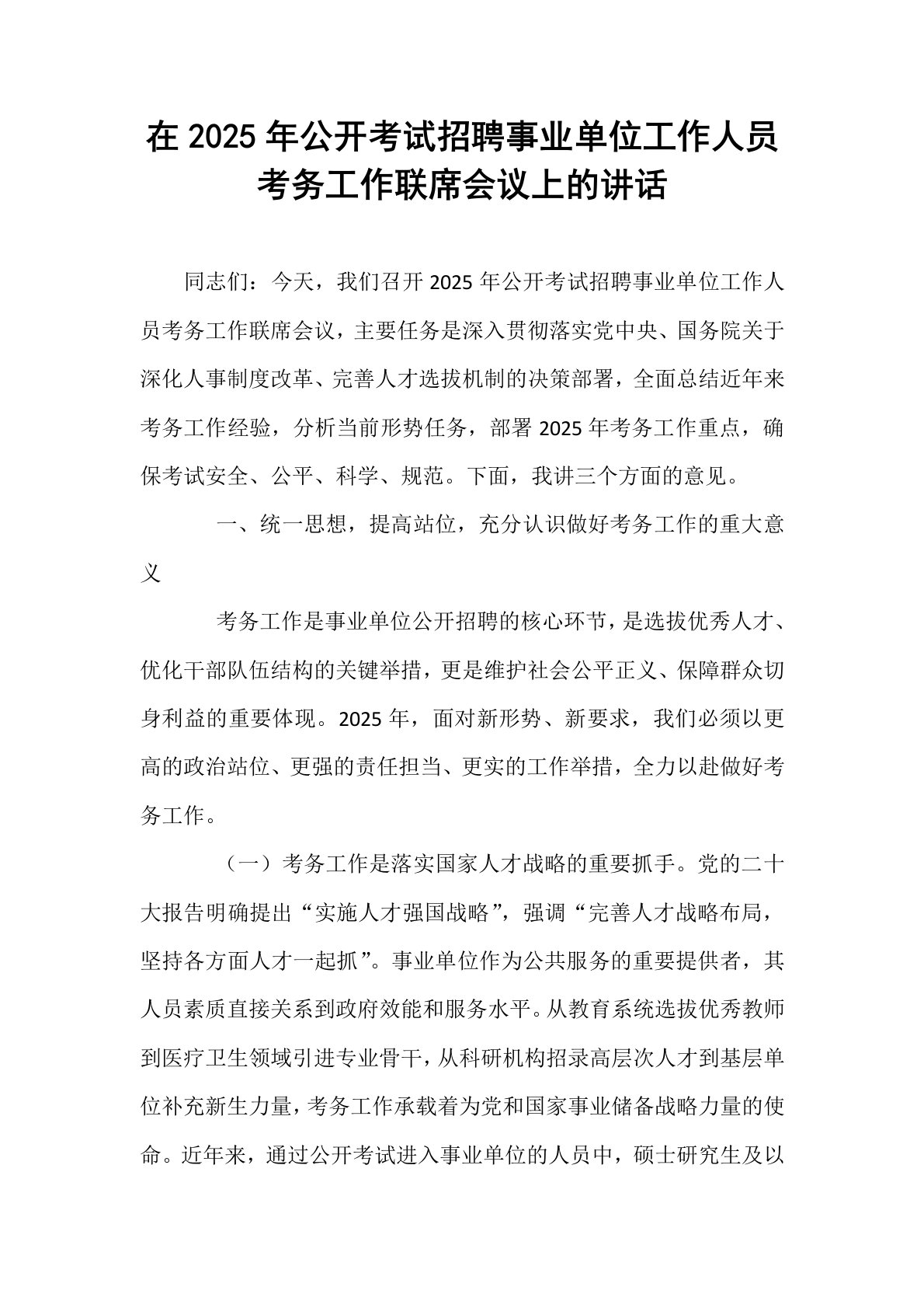 在2025年公开考试招聘事业单位工作人员考务工作联席会议上的讲话同志们:今天,我们召开2025年公开考试招聘事业单位工作人员考务工作联席会议,主要任务是深入贯彻落实党中央、国务院关于深化人事制度改革、完善人才选拔机制的决策部署,全面总结近年来考务工作经验,分析当前形势任务,部署2025年考务工作重点,确保考试安全、公平、科学、规范。下面,我讲三个方面的意见。一、统一思想,提高站位,充分认识做好考务工作的重大意义考务工作是事业单位公开招聘的核心环节,是选拔优秀人才、优化干部队伍结构的关键举措,更是维护社会公平正义、保障群众切身利益的重要体现。2025年,面对新形势、新要求,我们必须以更高的政治站...