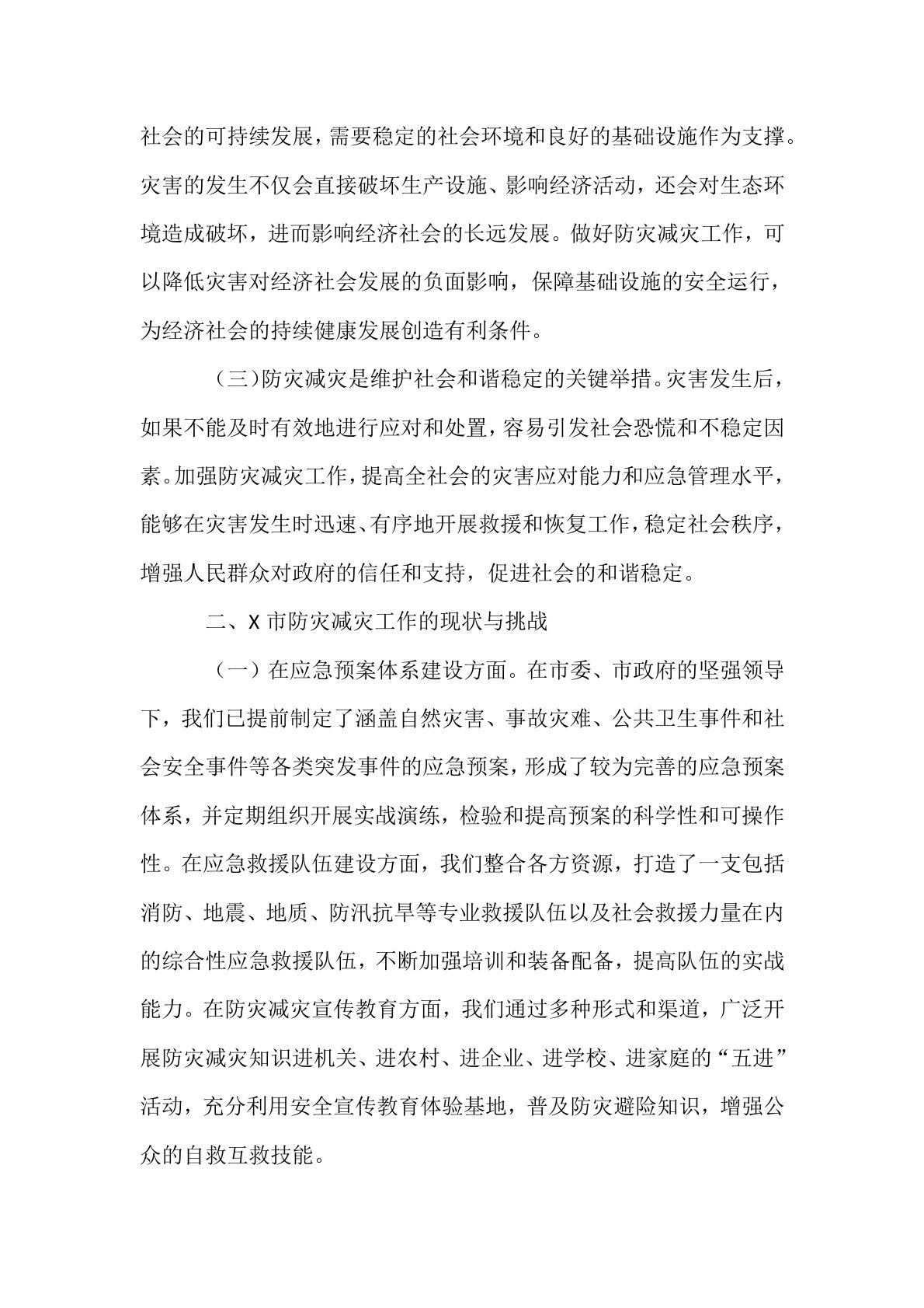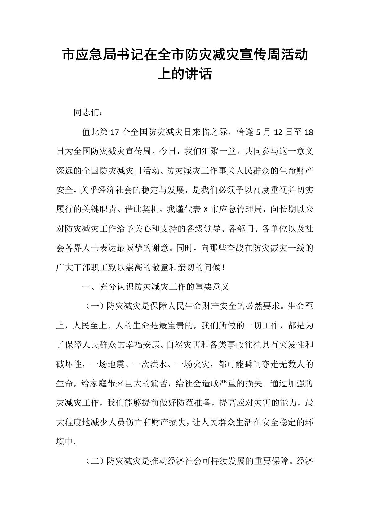 市应急局书记在全市防灾减灾宣传周活动上的讲话同志们:值此第17个全国防灾减灾日来临之际,恰逢5月12日至18日为全国防灾减灾宣传周。今日,我们汇聚一堂,共同参与这一意义深远的全国防灾减灾日活动。防灾减灾工作事关人民群众的生命财产安全,关乎经济社会的稳定与发展,是我们必须予以高度重视并切实履行的关键职责。借此契机,我谨代表X市应急管理局,向长期以来对防灾减灾工作给予关心和支持的各级领导、各部门、各单位以及社会各界人士表达最诚挚的谢意。同时,向那些奋战在防灾减灾一线的广大干部职工致以崇高的敬意和亲切的问候!一、充分认识防灾减灾工作的重要意义(一)防灾减灾是保障人民生命财产安全的必然要求。生命至上,...