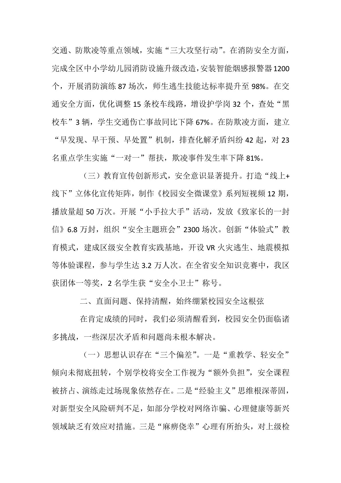 区教育局长在全区教育系统安全工作会议上的讲话同志们:今天,我们召开全区教育系统安全工作会议,主要任务是深入贯彻落实习近平总书记关于安全生产的重要论述和省、市、区安全工作会议精神,总结成绩、分析形势、部署任务,动员全区教育系统牢固树立“生命至上、安全第一”理念,以“时时放心不下”的责任感,筑牢校园安全防线,为教育事业高质量发展提供坚实保障。下面,我讲三个方面意见。一、总结成绩、增强信心,牢牢把握校园安全主动权过去一年,全区教育系统坚持把安全作为教育发展的“生命线”,以“平安校园”建设为抓手,统筹推进责任落实、专项整治、教育宣传,校园安全形势持续稳定向好。(一)责任体系更加严密,安全根基不断夯实。...