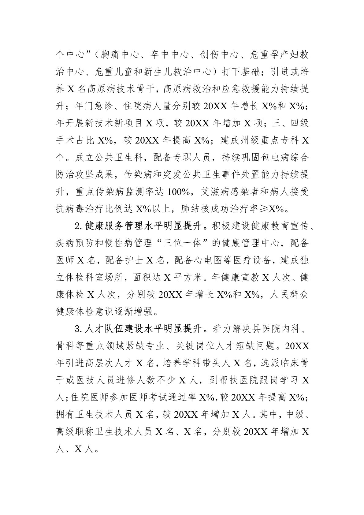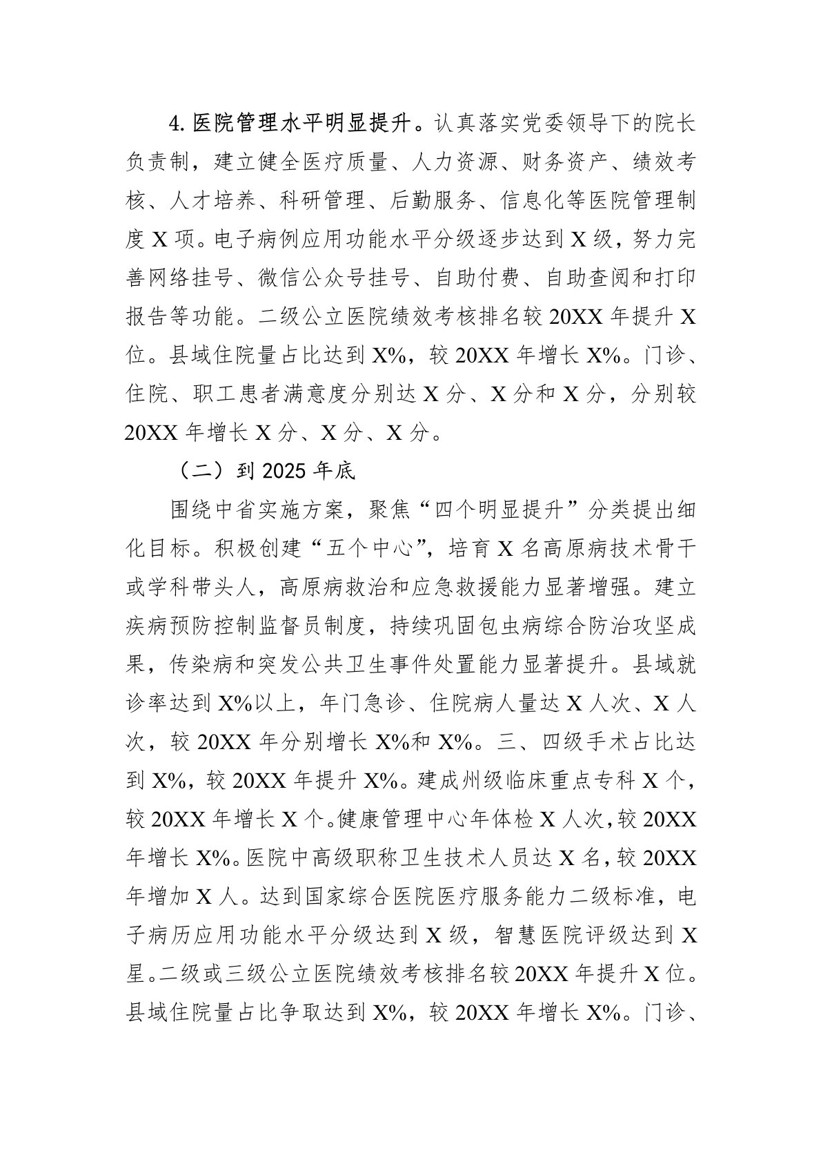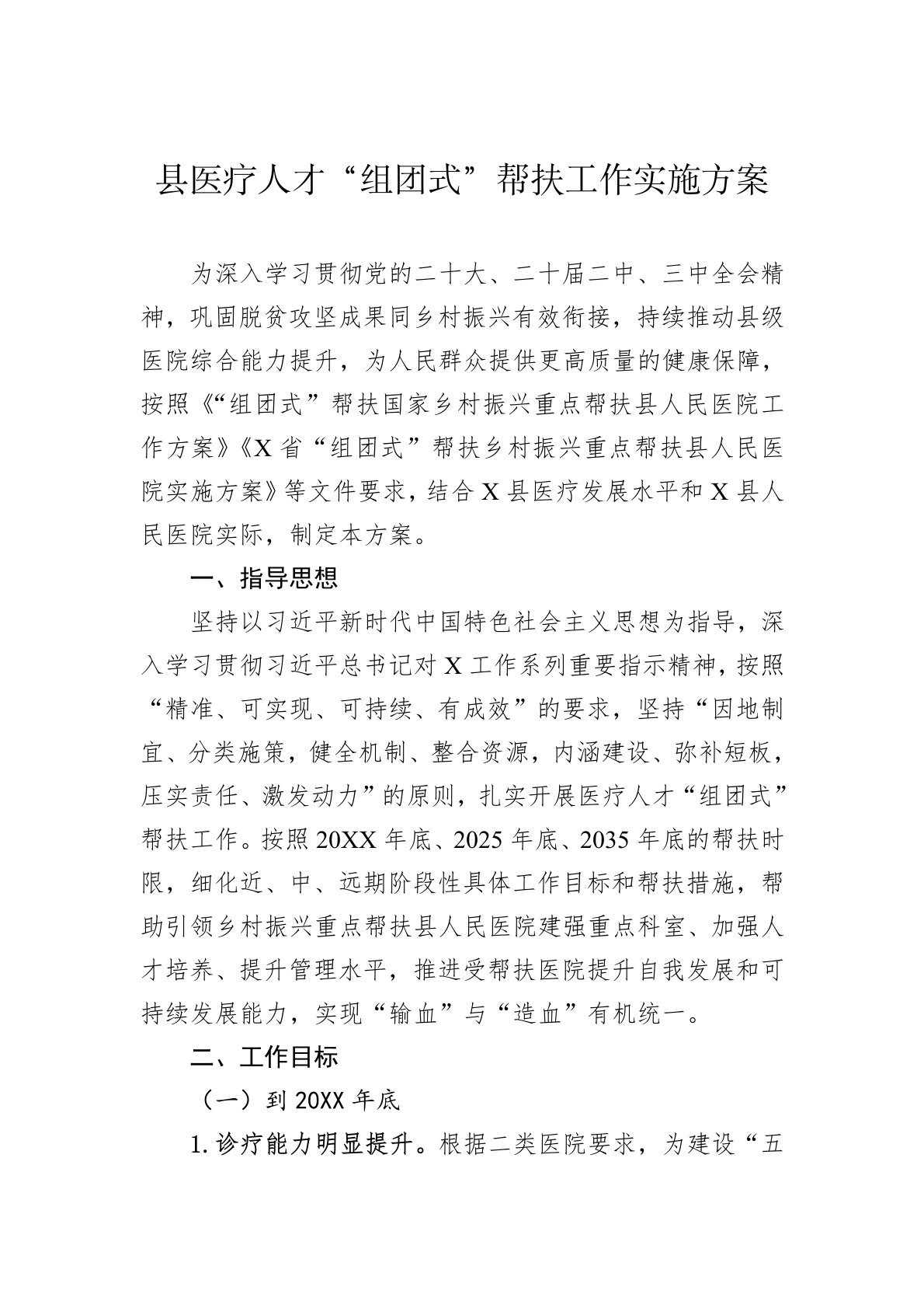 为深入学习贯彻党的二十大、二十届二中、三中全会精神,巩固脱贫攻坚成果同乡村振兴有效衔接,持续推动县级医院综合能力提升,为人民群众提供更高质量的健康保障,按照《“组团式”帮扶国家乡村振兴重点帮扶县人民医院工作方案》《X省“组团式”帮扶乡村振兴重点帮扶县人民医院实施方案》等文件要求,结合X县医疗发展水平和X县人民医院实际,制定本方案。一、指导思想坚持以习近平新时代中国特色社会主义思想为指导,深入学习贯彻习近平总书记对X工作系列重要指示精神,按照“精准、可实现、可持续、有成效”的要求,坚持“因地制宜、分类施策,健全机制、整合资源,内涵建设、弥补短板,压实责任、激发动力”的原则,扎实开展医疗人才“组团...